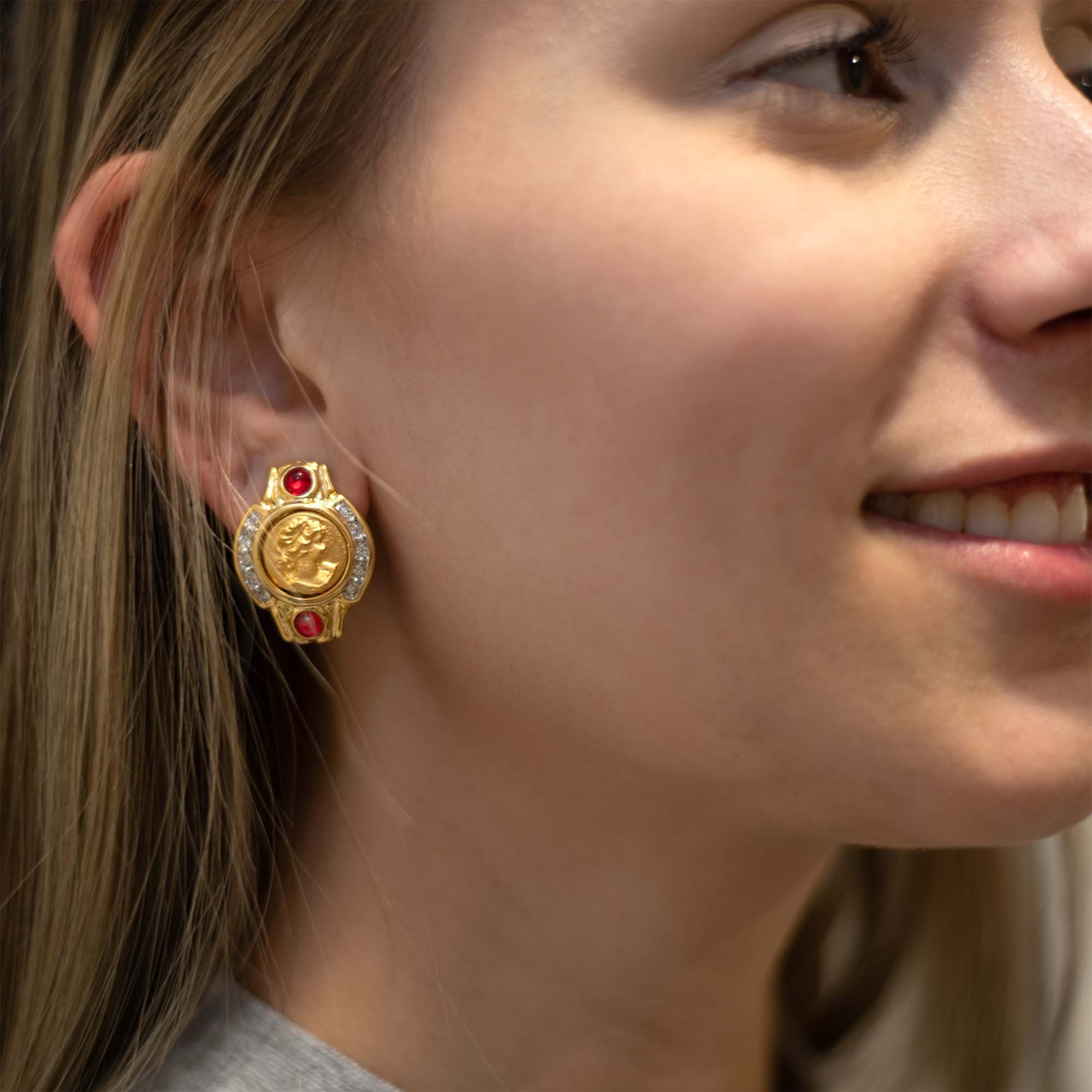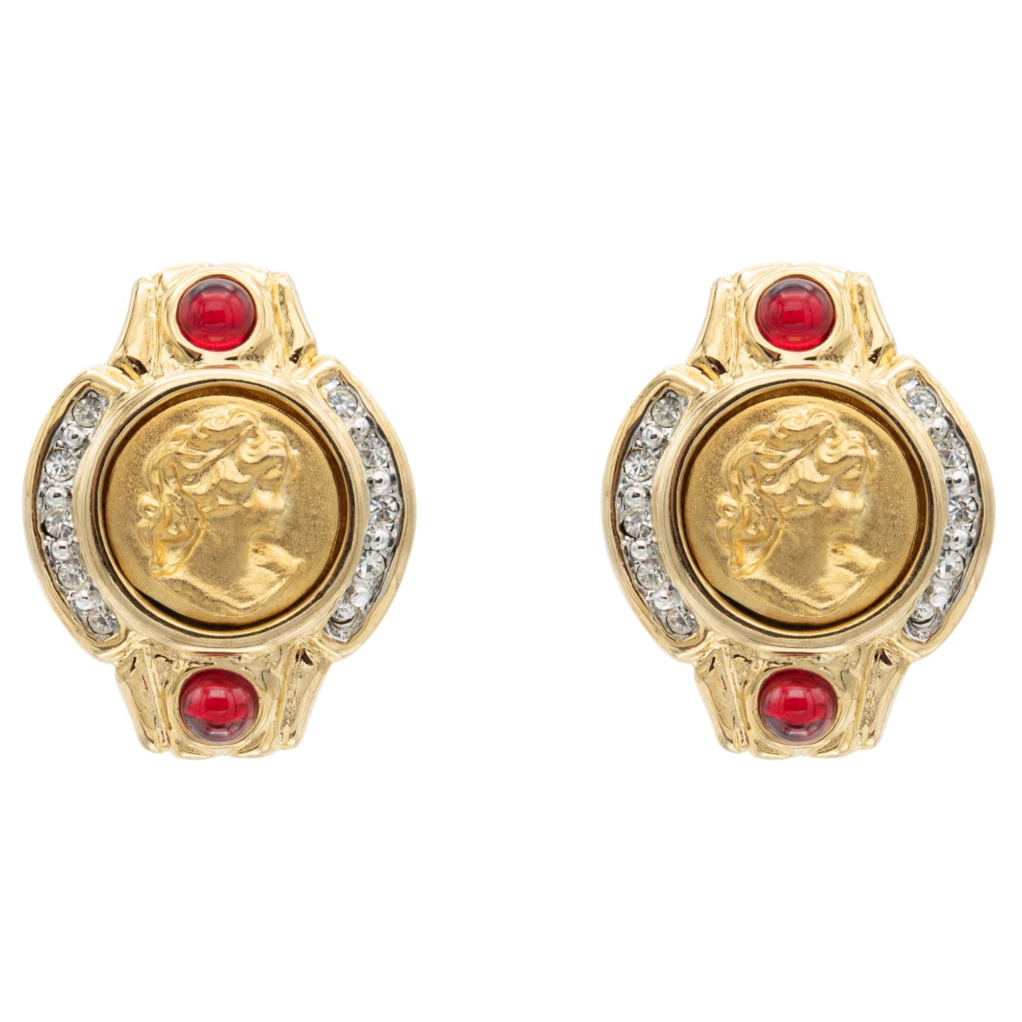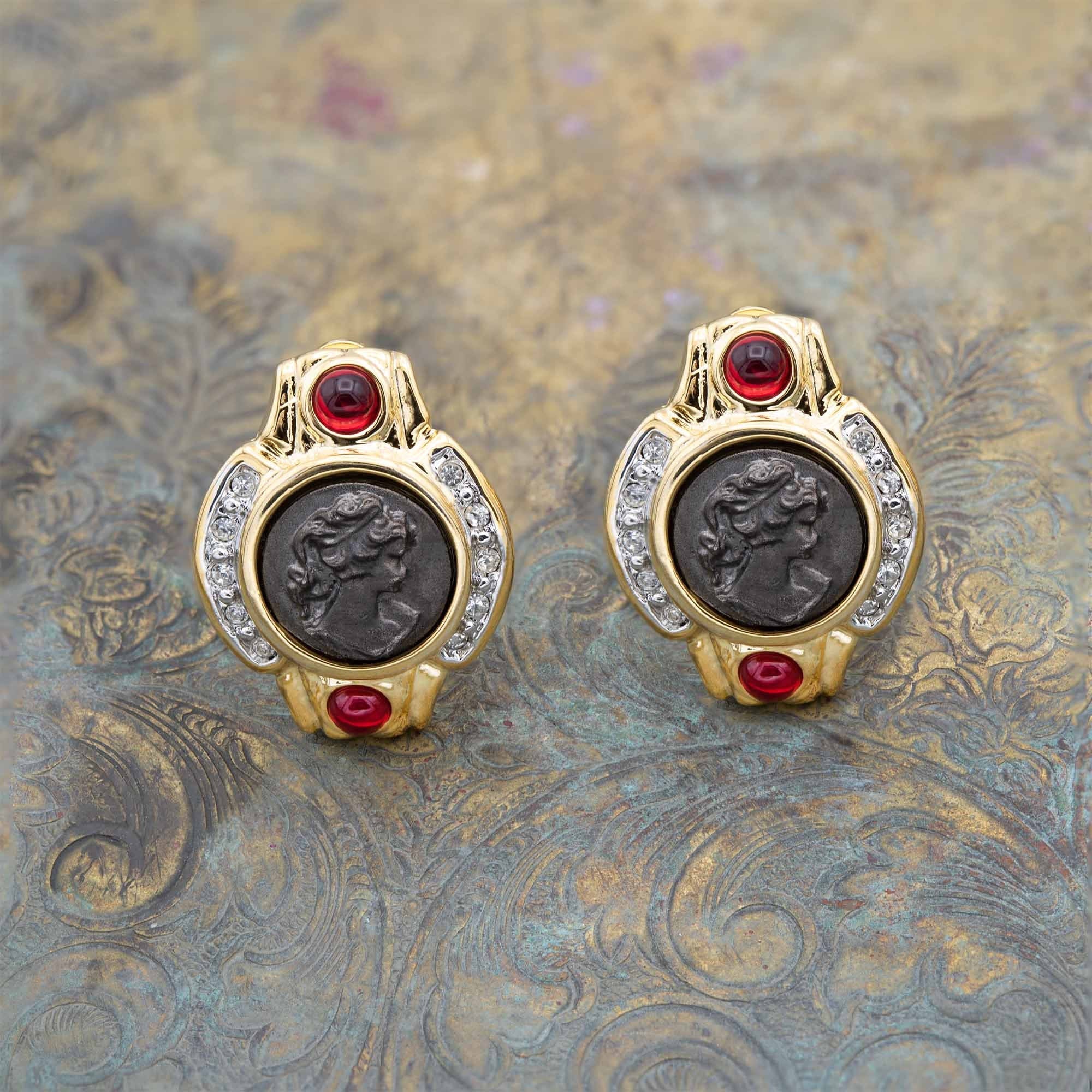 Vintage Antique Gold Earrings Black Roman Collectable Coin Ruby and Clear Crystals Womans Handmade E4089-CB - Limited Stock - Never Worn Clip Earrings Gold Plated Victorian Lady Profile Black Cameo Design Ruby Cabachon and Clear Crystals Earrings Measure 1"