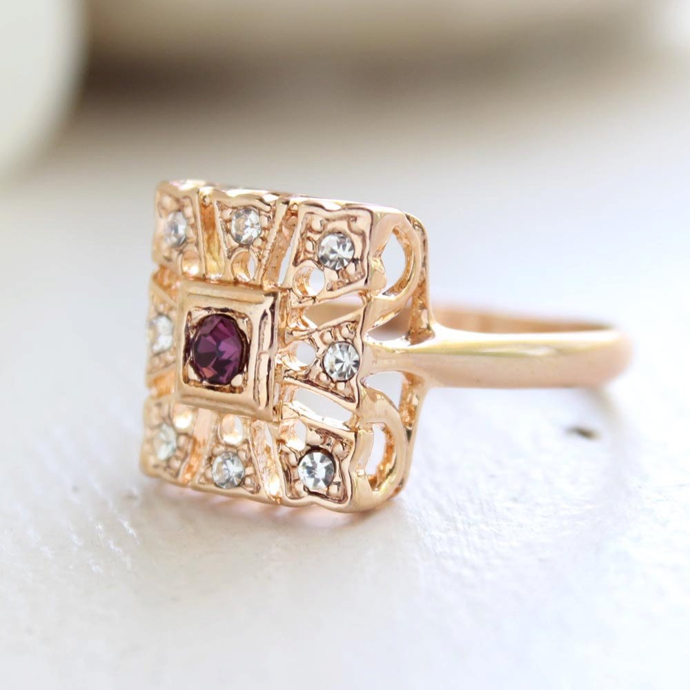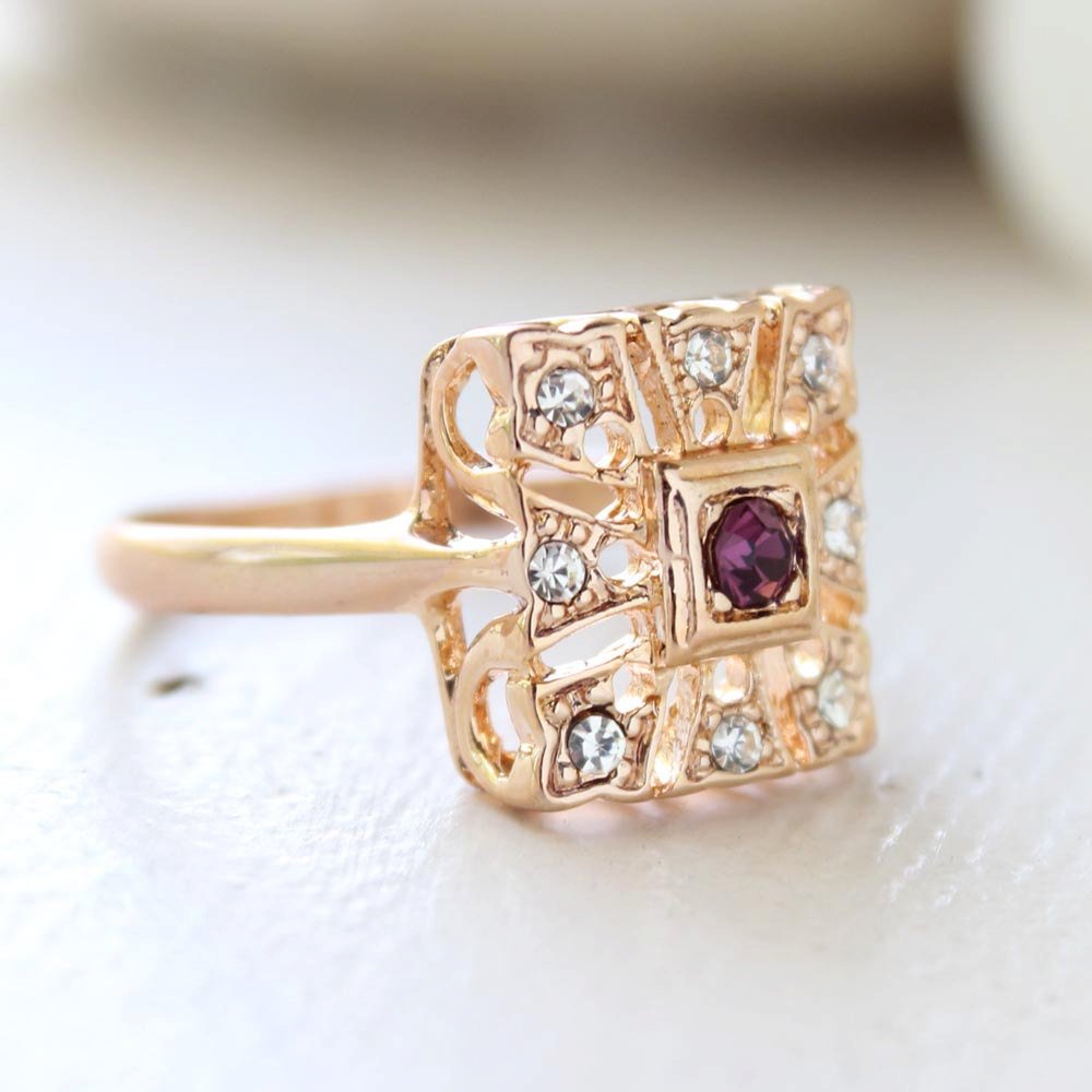 Condition: Excellent (Never worn and with tags) Vintage 1970s Filigree Ring Made in Providence, RI, USA 18k Gold Plated Amethyst and Clear Austrian Crystals Stamped - 18k HGE