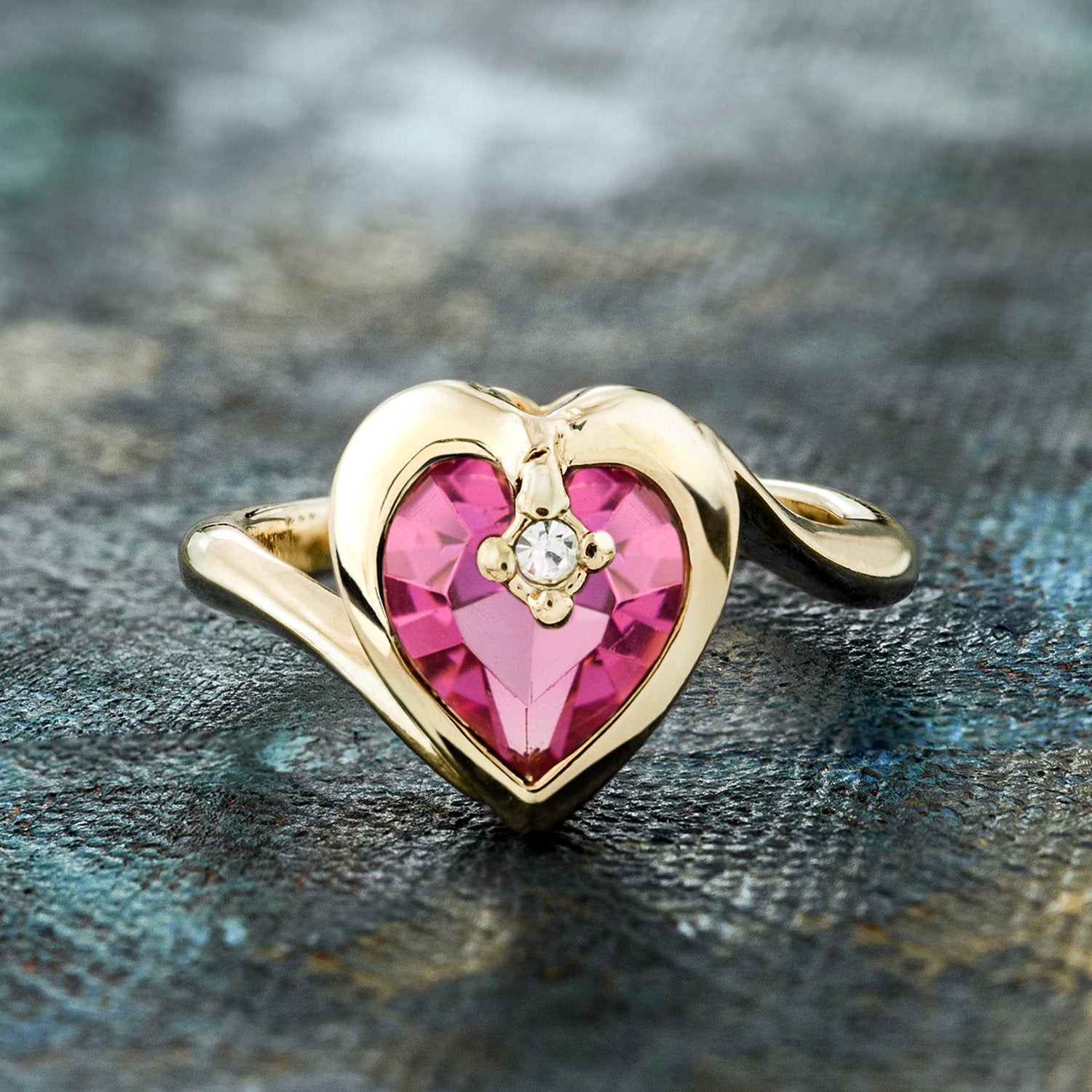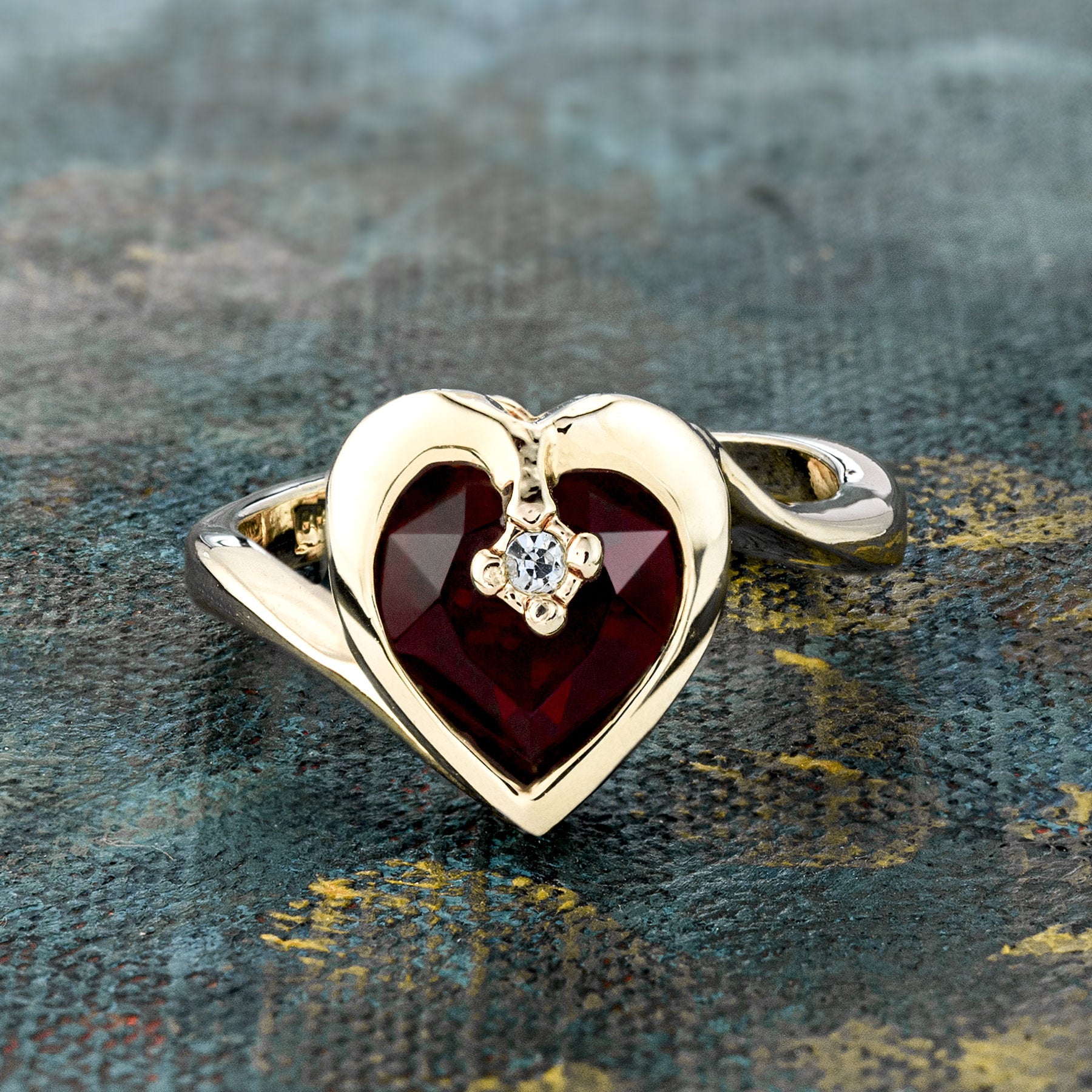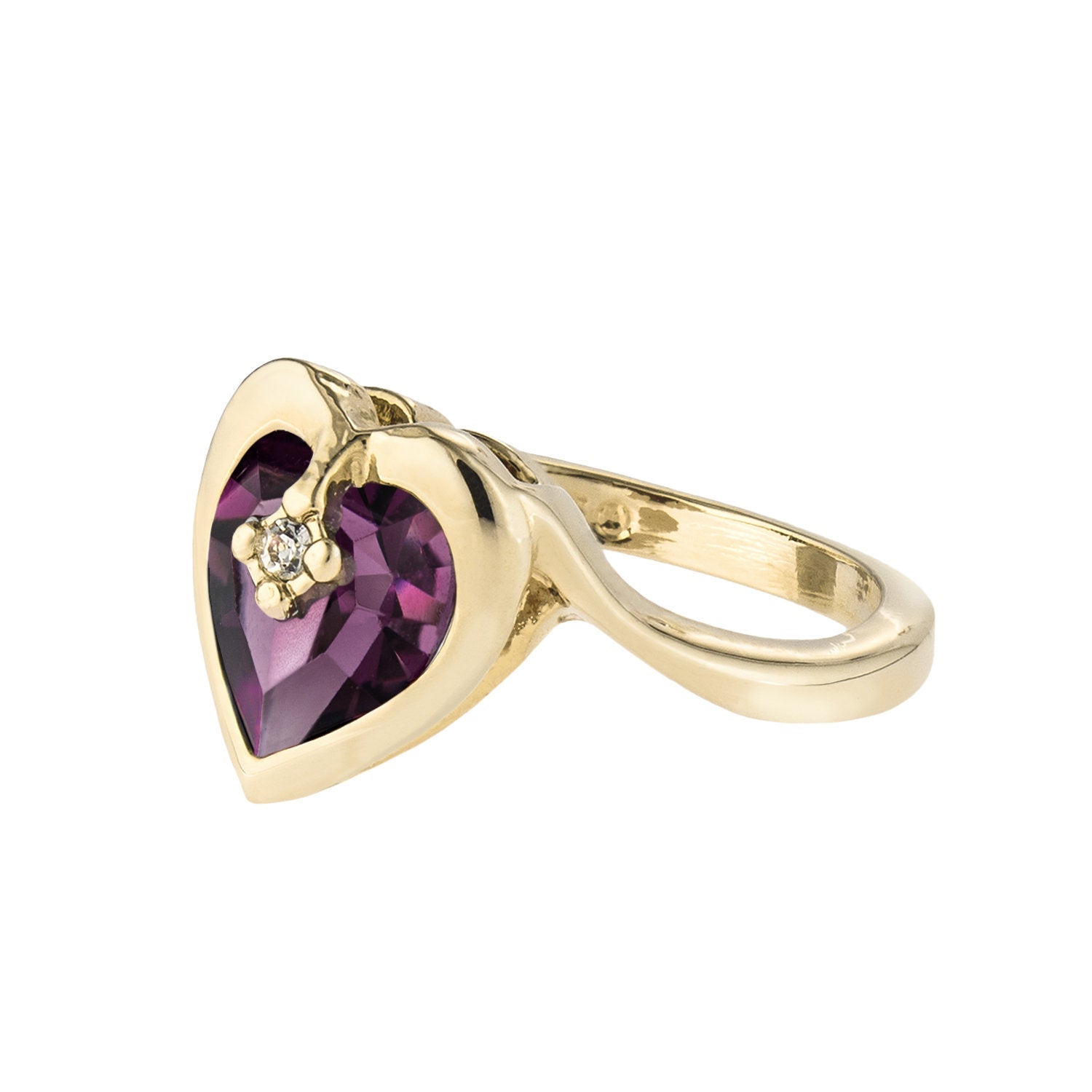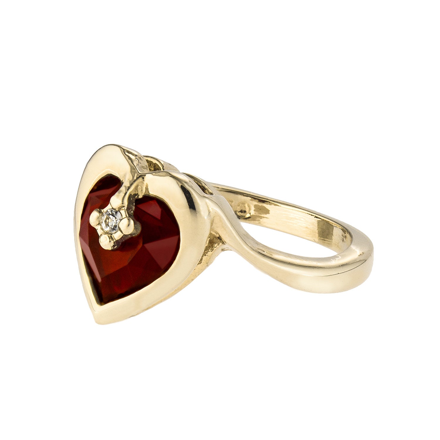 • Vintage 1970s Heart Shape Ring with Clear Austrian Crystal 18k Yellow Gold Electroplated