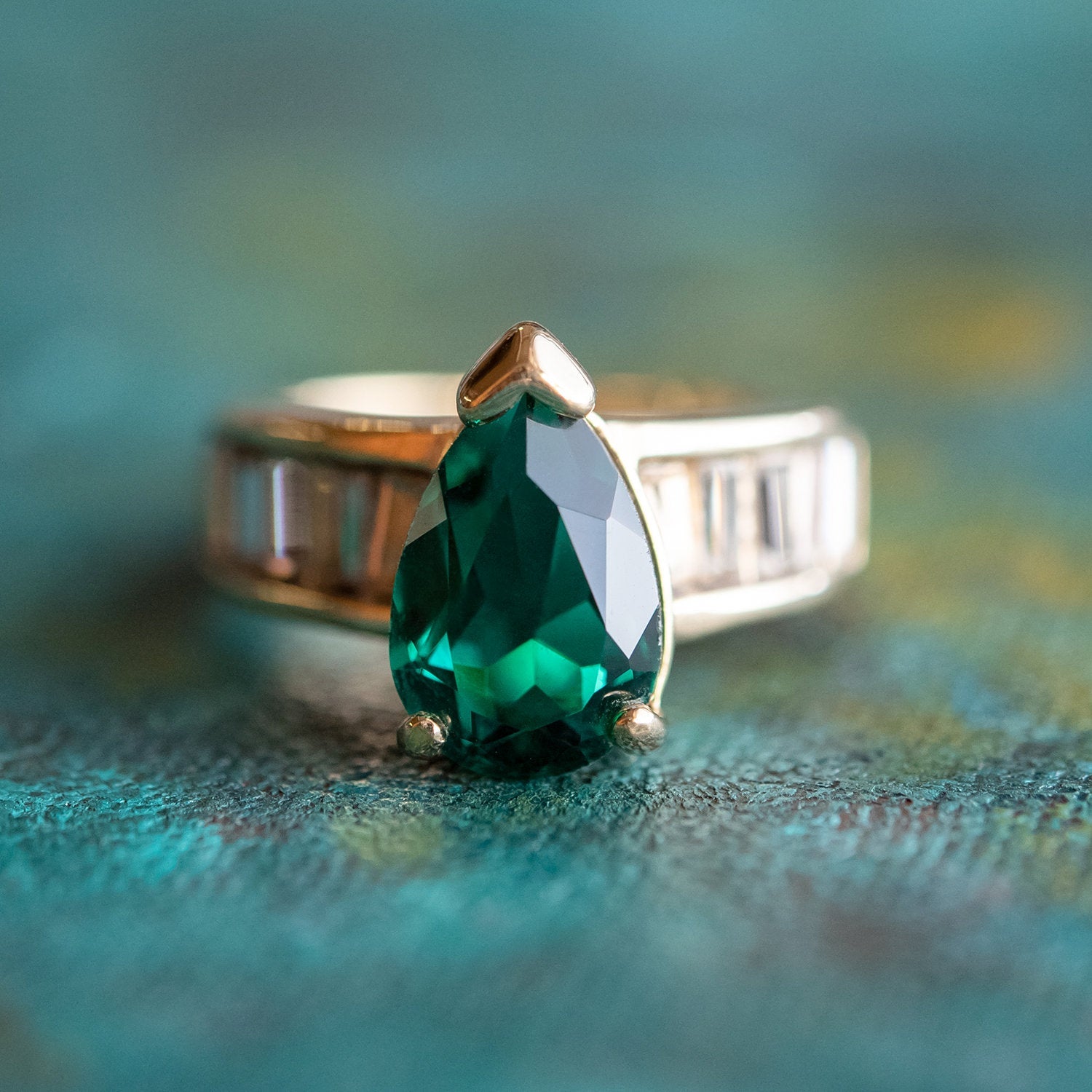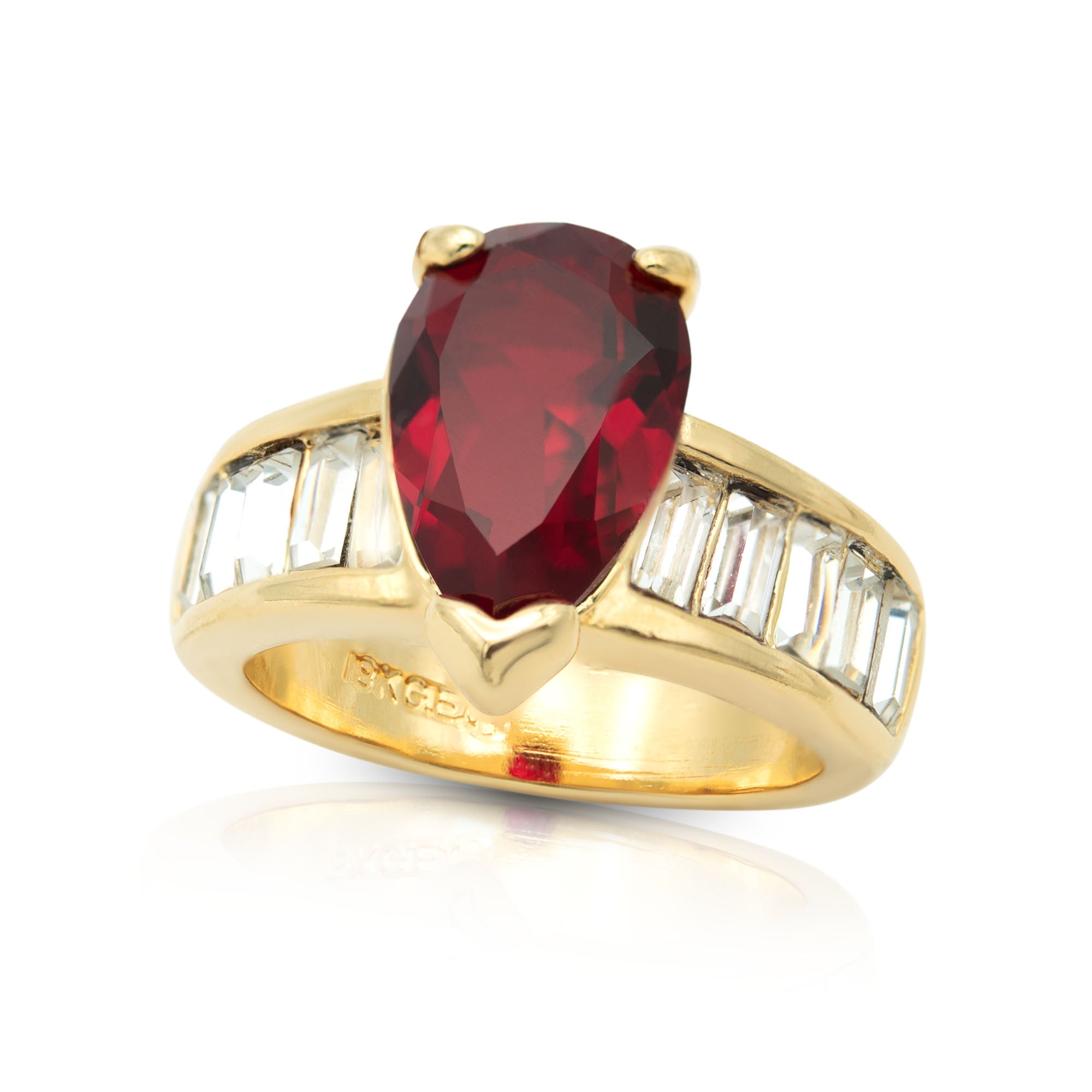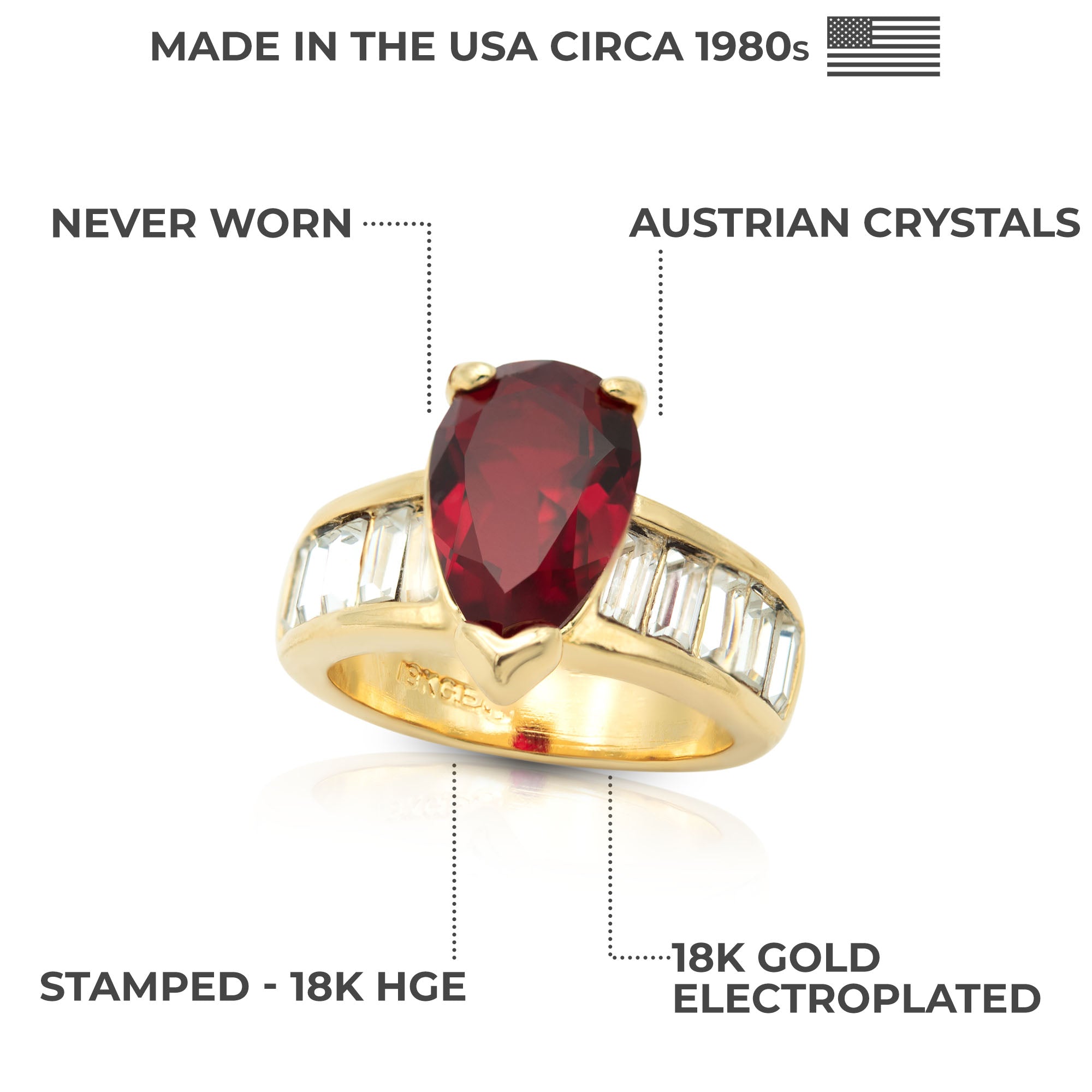 • Vintage 1970s Ring Teardrop Solitair Austrian Crystals 18k Yellow Gold Electroplate