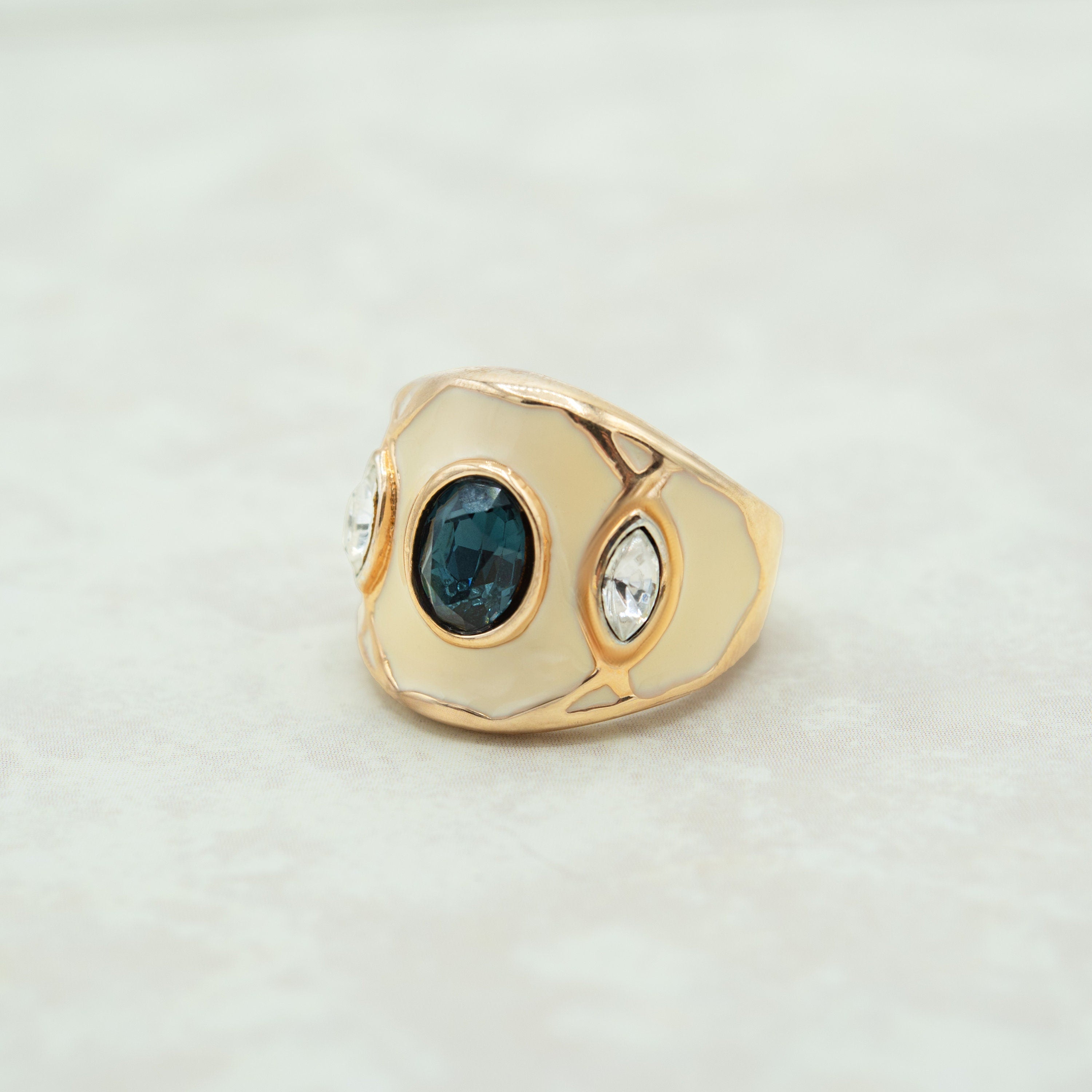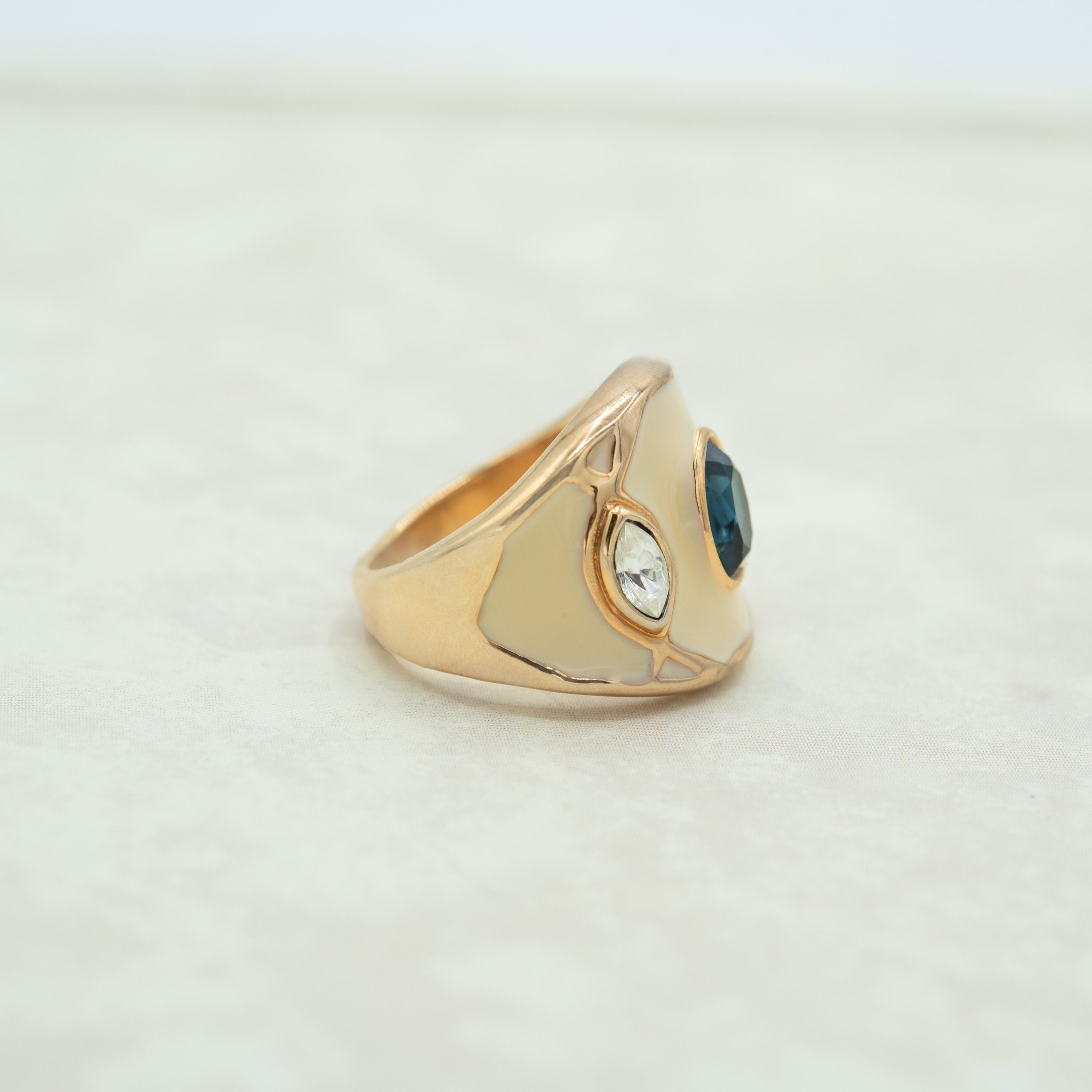 • Vintage 1980s White Enamel set with Sapphire and Clear Crystals Band 18k Yellow Gold Electroplated