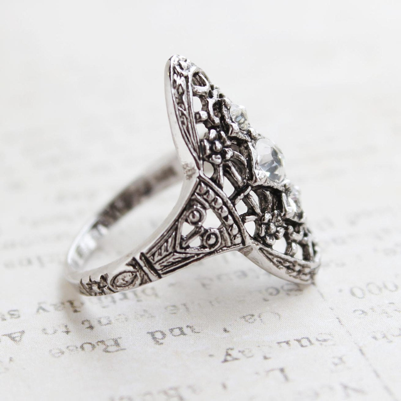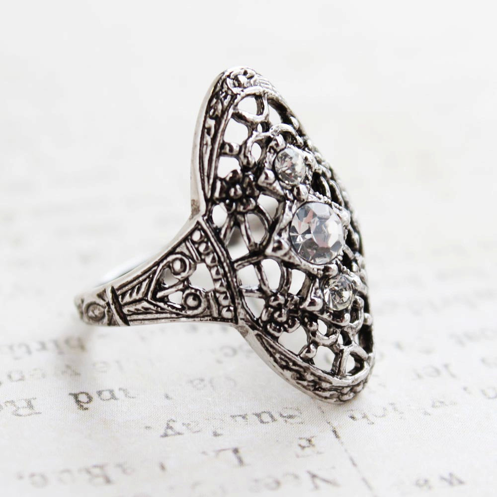 • Vintage Antiqued 18k White Gold Electroplated Filigree Ring with Clear Austrian Crystals Size 7