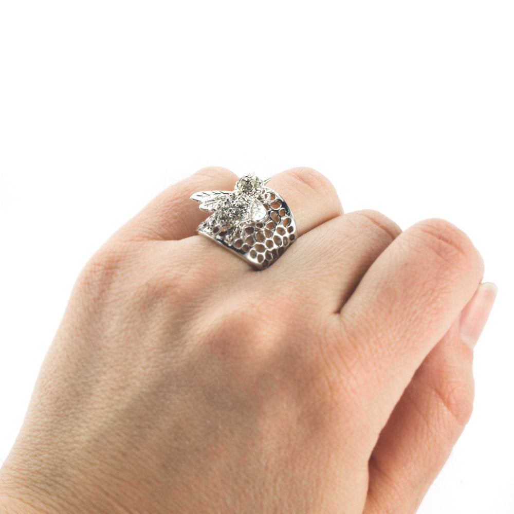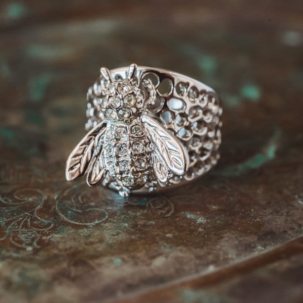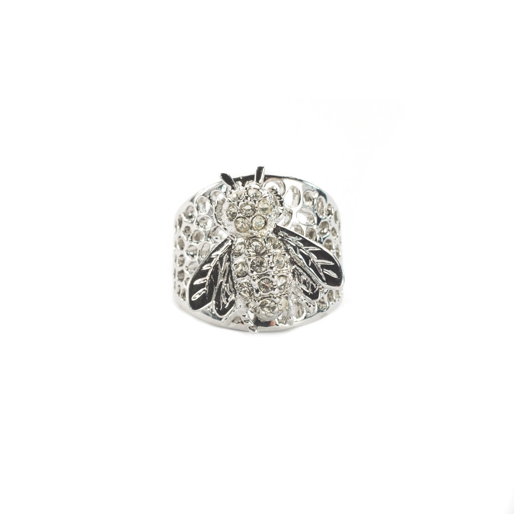 Vintage Ring Bee Ring Clear Swarovski Crystals 18kt White Gold Antique Womans Jewelry #R193 - Limited Stock - Never Worn Vintage 1980s Beautiful Bee Ring Clear Austrian Crystals 18k White Gold Electroplated Made in Providence, RI, USA Stamped - 18k HGEs