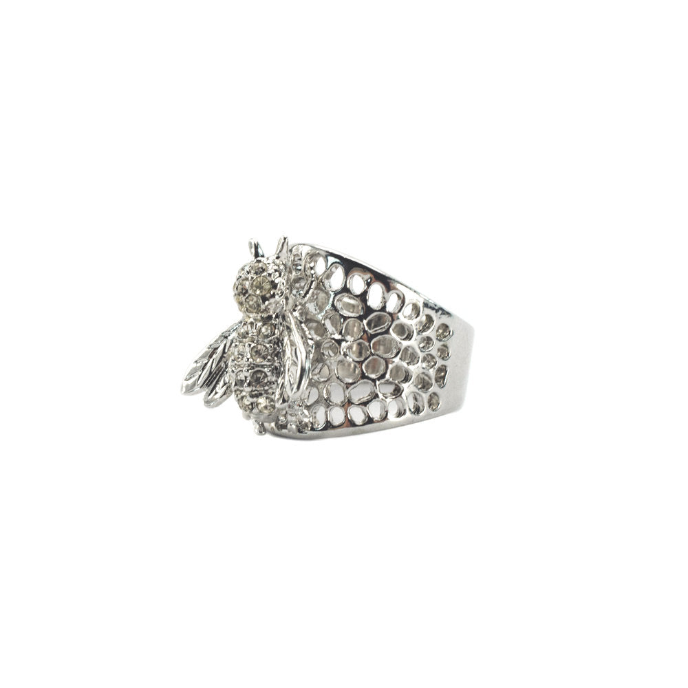 • Vintage Ring Bee Ring Clear Swarovski Crystals 18kt White Gold Silver Antique Womans Jewelry #R193 Size: 8