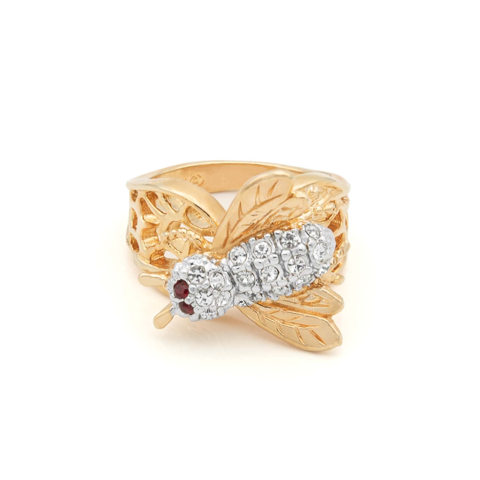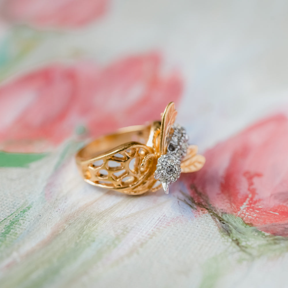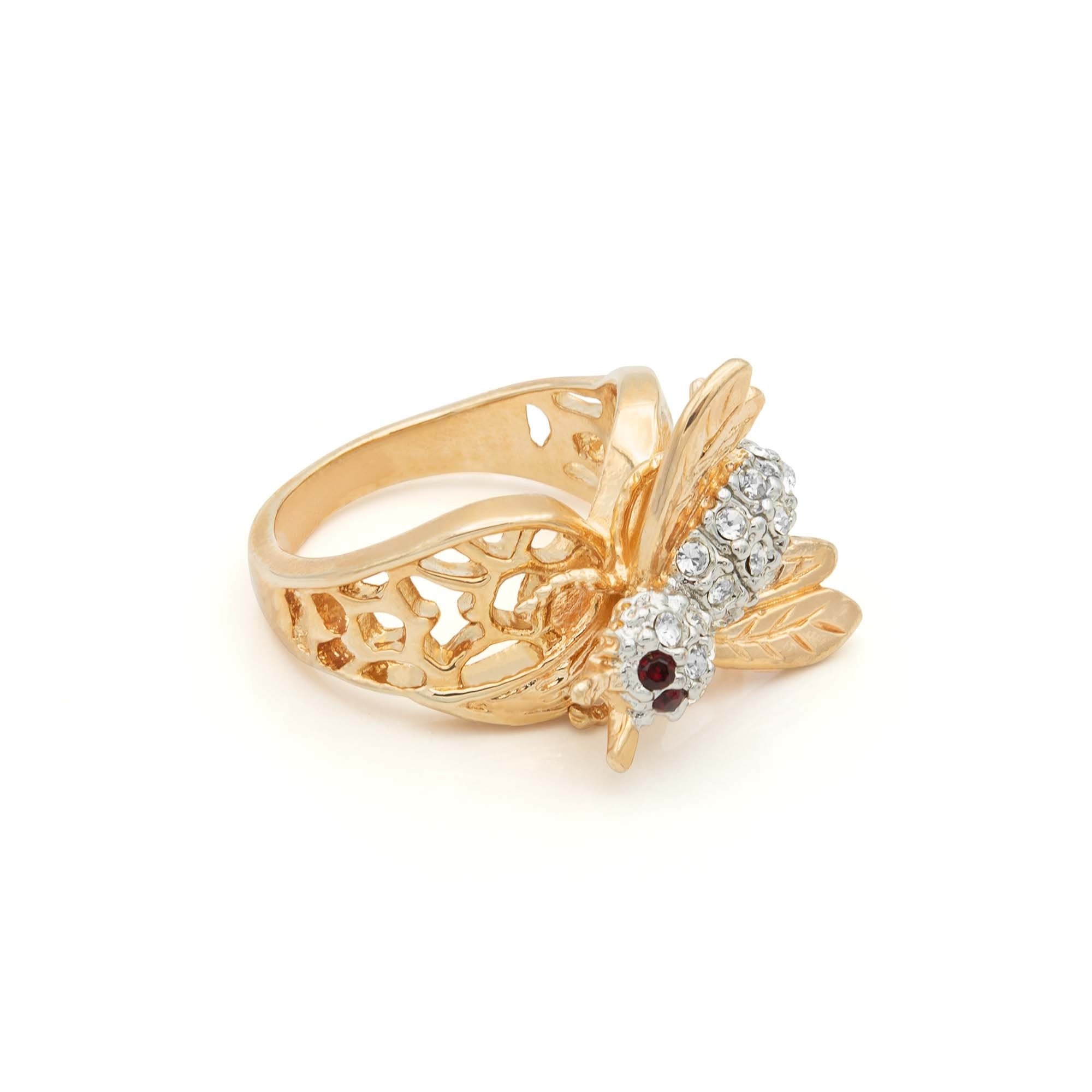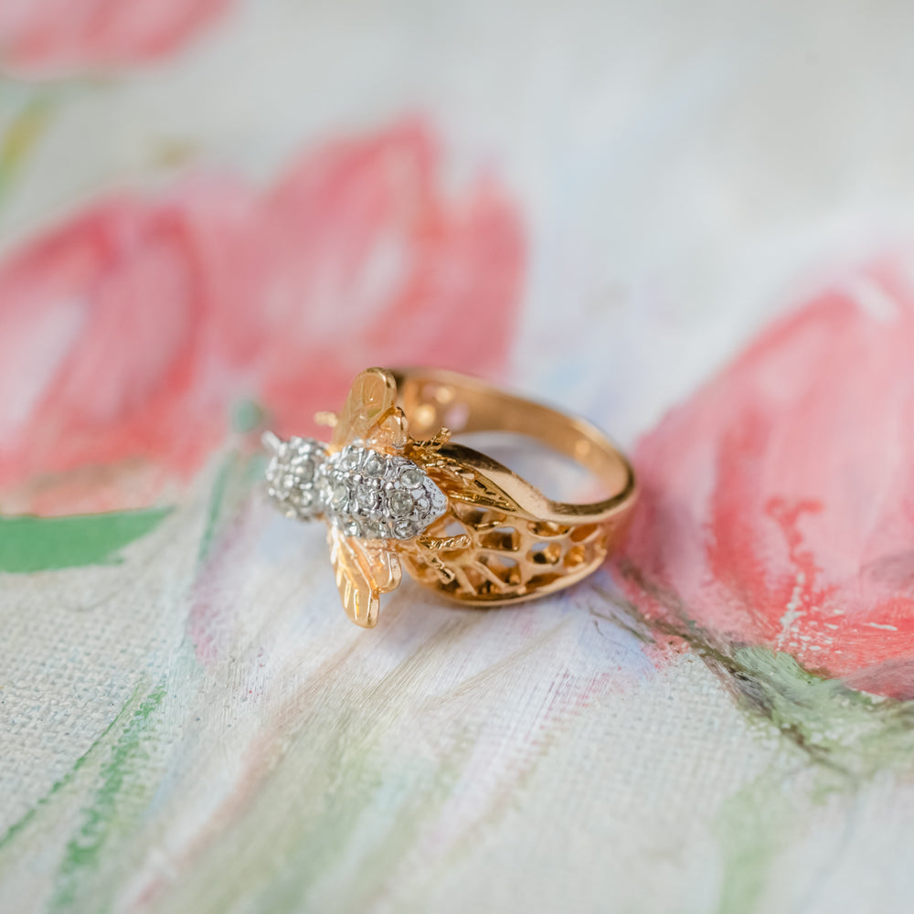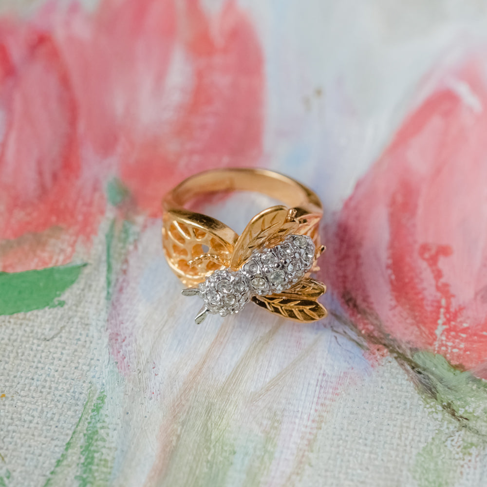 Vintage Ring Bee Ring Clear Swarovski Crystals 18kt Gold Insect Womans Jewlery Handmade #R681 Antique Rings
