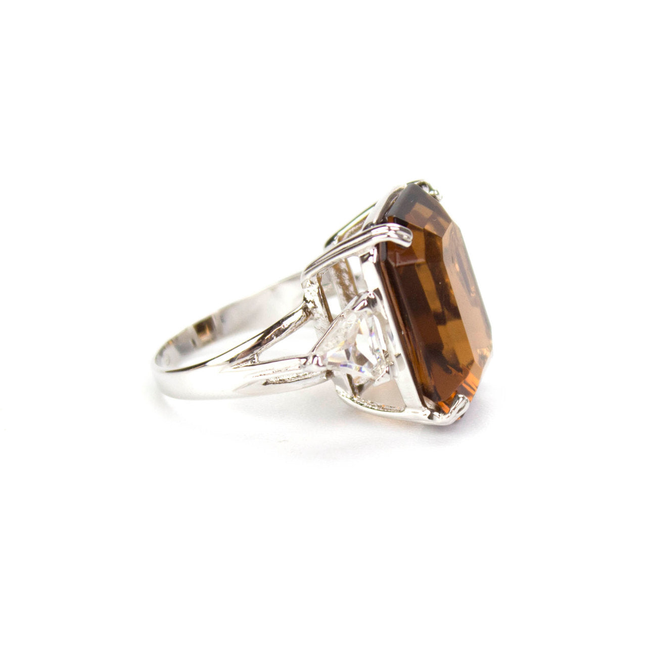 Vintage Ring Cocktail Ring Smoky Topaz and Clear Swarovski Crystals Rhodium Plated Silver Tone #R2239 Condition: Excellent (Never worn or owned) Vintage 1970s Cocktail Ring Made in Providence, RI, USA Rhodium Plated Emerald Cut Smoky Topaz Austrian Crystal Clear Austrian Crystal Accents Crystal Measures: 19.7mm x 15.1mm Height from back of finger to face of the ring: 12.8mm November's Birthstone Color More November's Birthstone Rings: