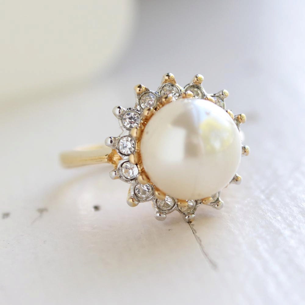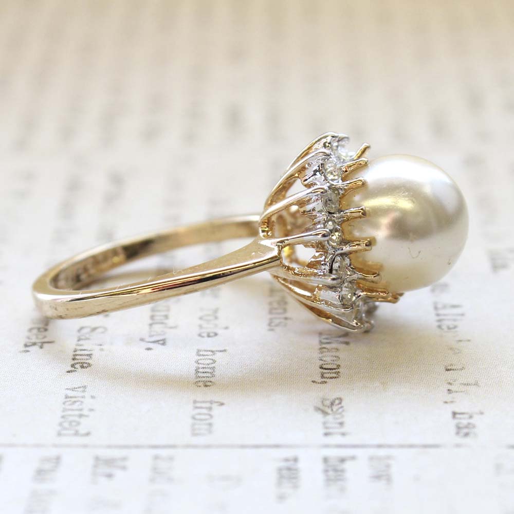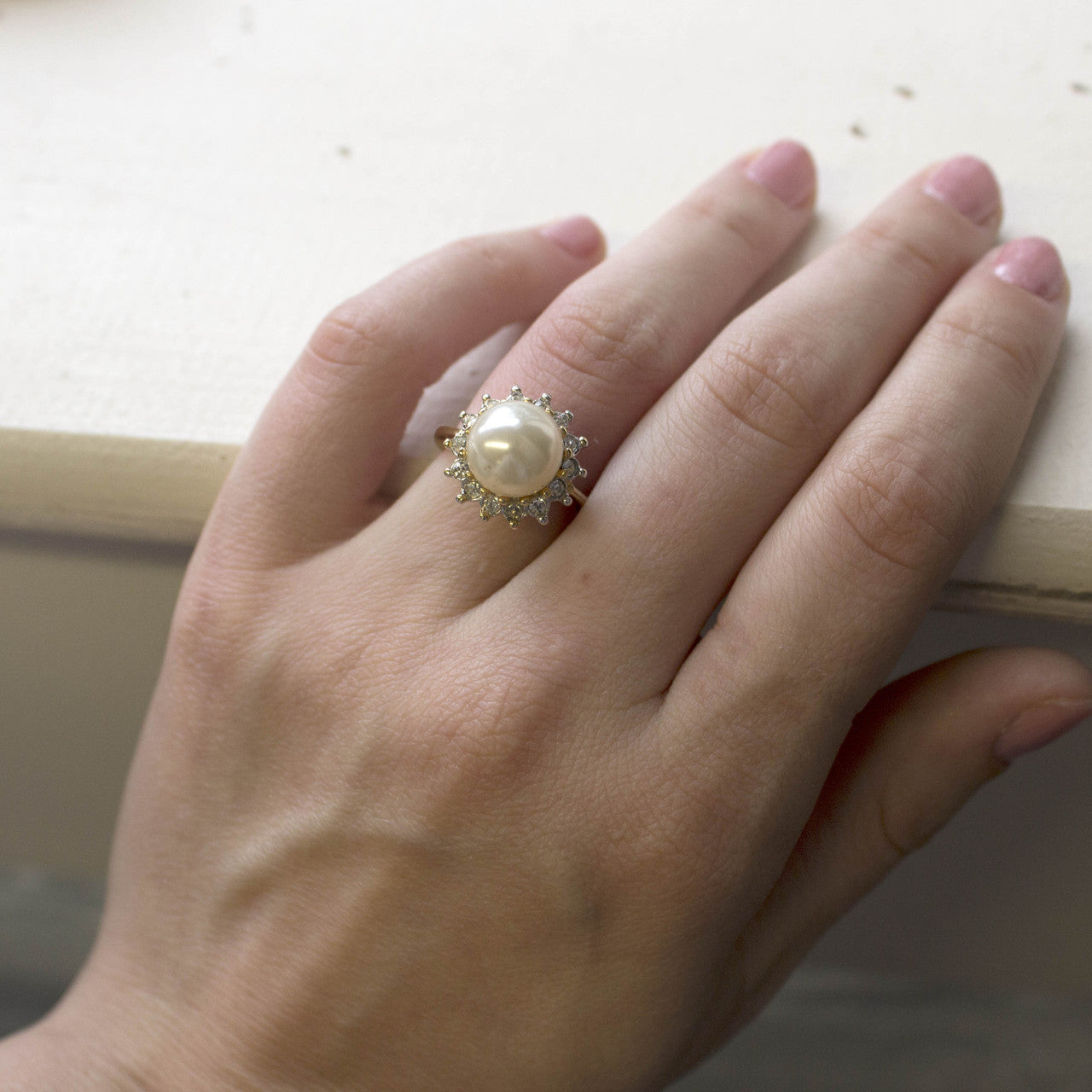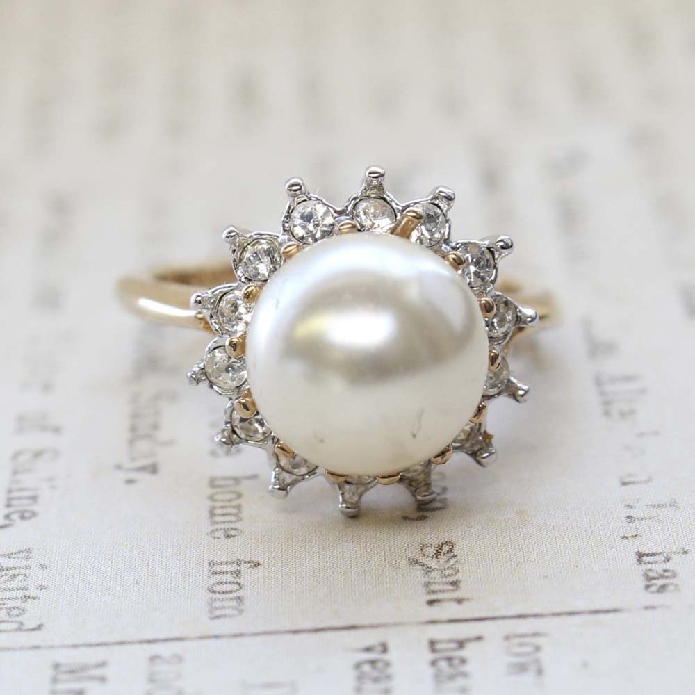 • Vintage Ring 1970s Faux Cream Pearl Ring 18k Gold Band with Swarovski Crystals June Birthstone Rings Womans Jewelry #R1273 - LIMITED SUPPLY Size: 6