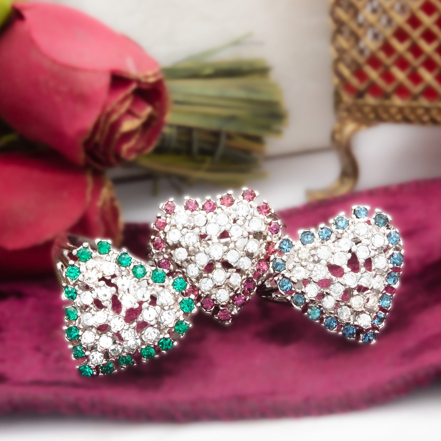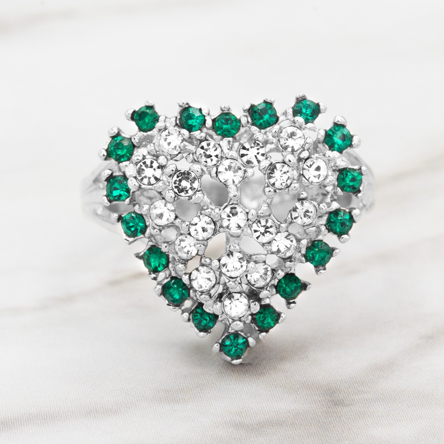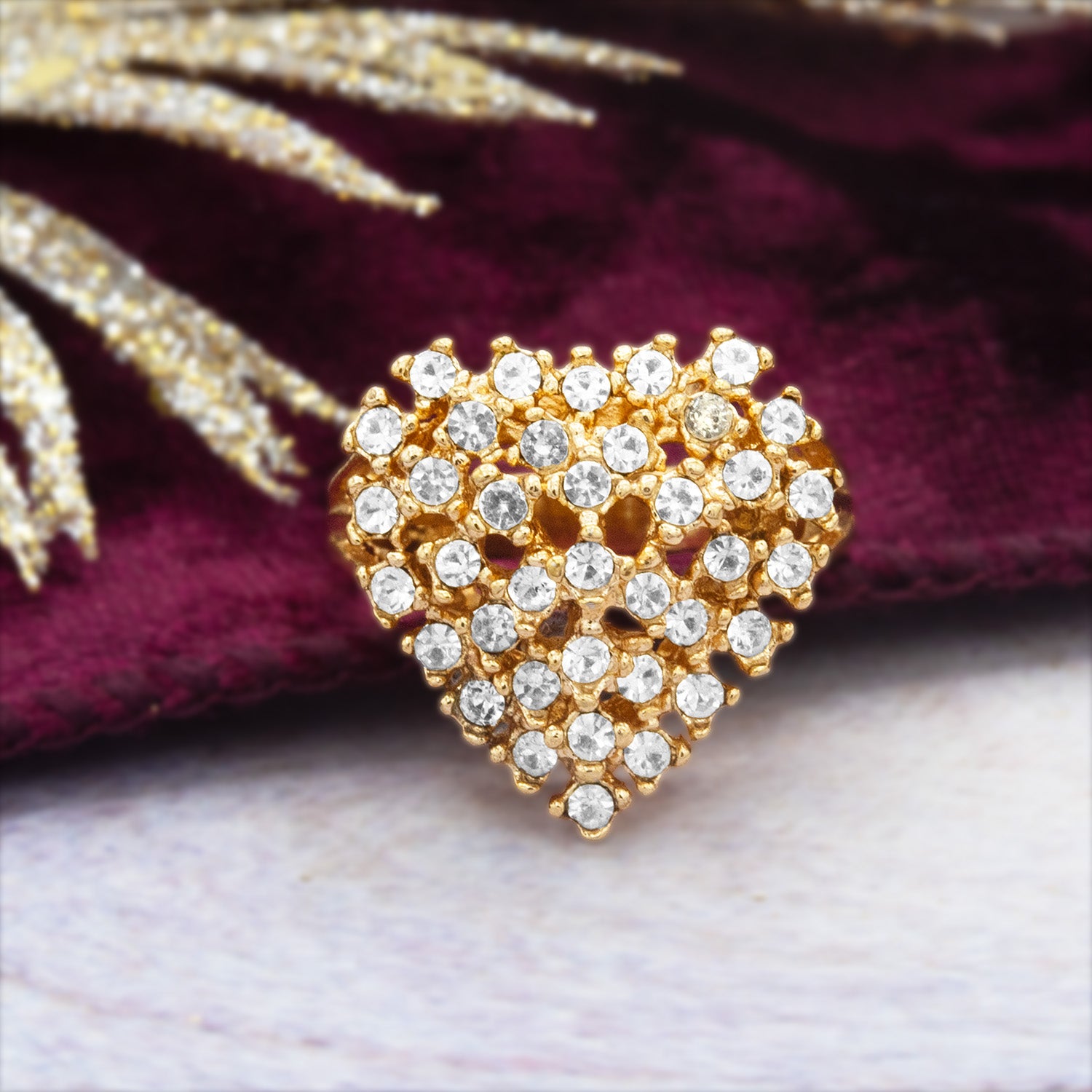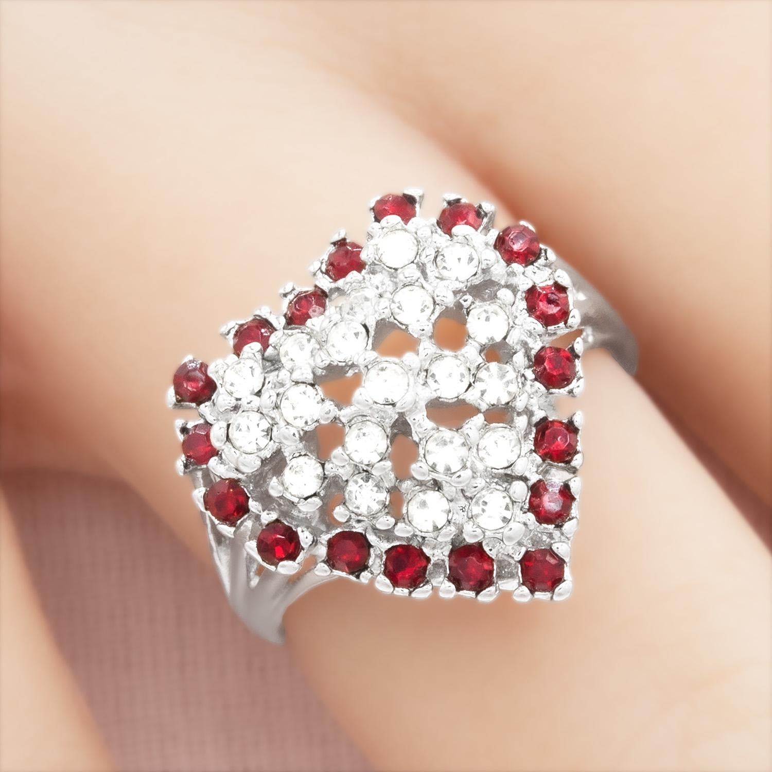 This exquisite vintage ring features a sparkling heart design crafted from clear Austrian crystals surrounded by vibrant color crystals. Electroplated with 18k yellow or white gold, this timeless piece exudes elegance and charm. Perfect for Valentine's Day or as a cherished addition to any antique jewelry collection, this ring beautifully combines vintage allure with romantic style.
