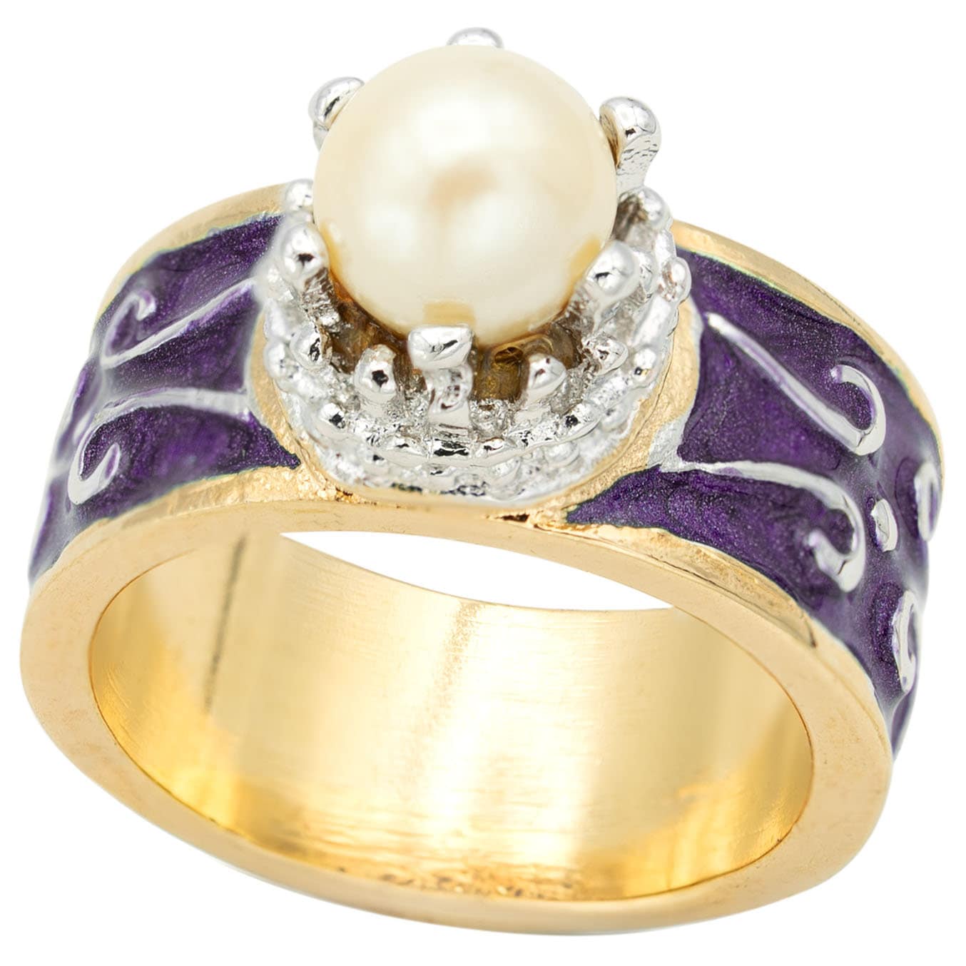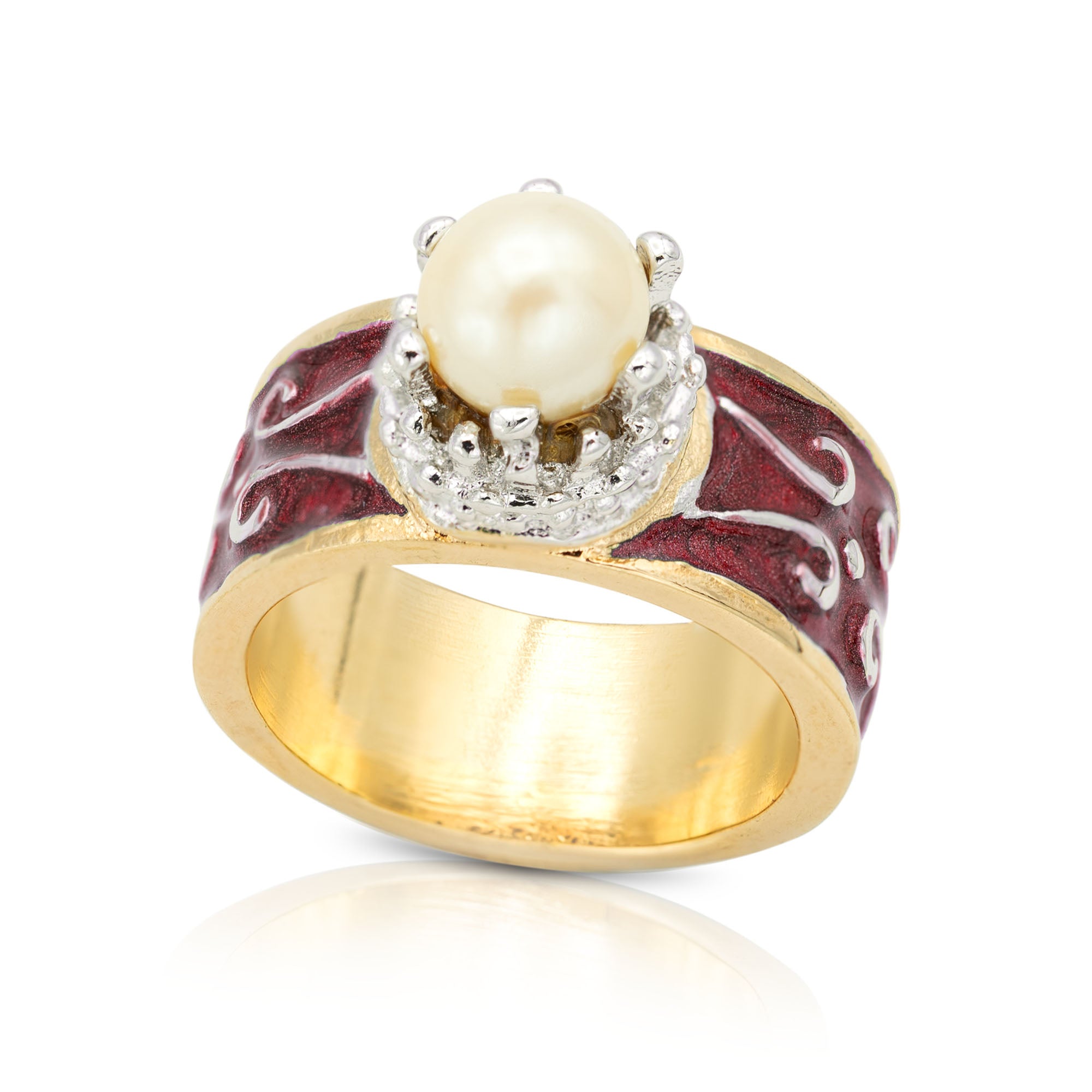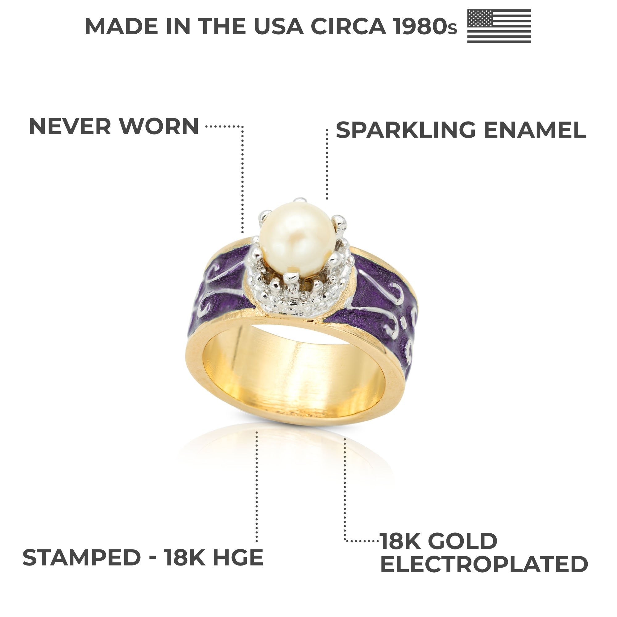 Vintage 1980s Royal Crown Hand Painted Enamel Ring with Pearl Bead 18k Gold Plated #R9014