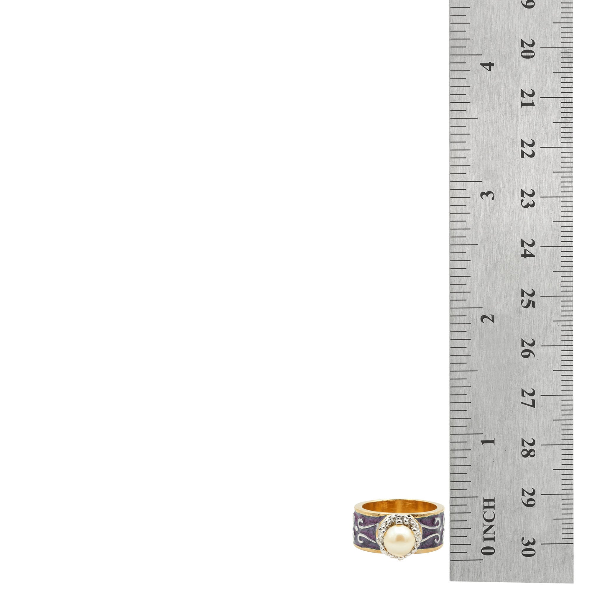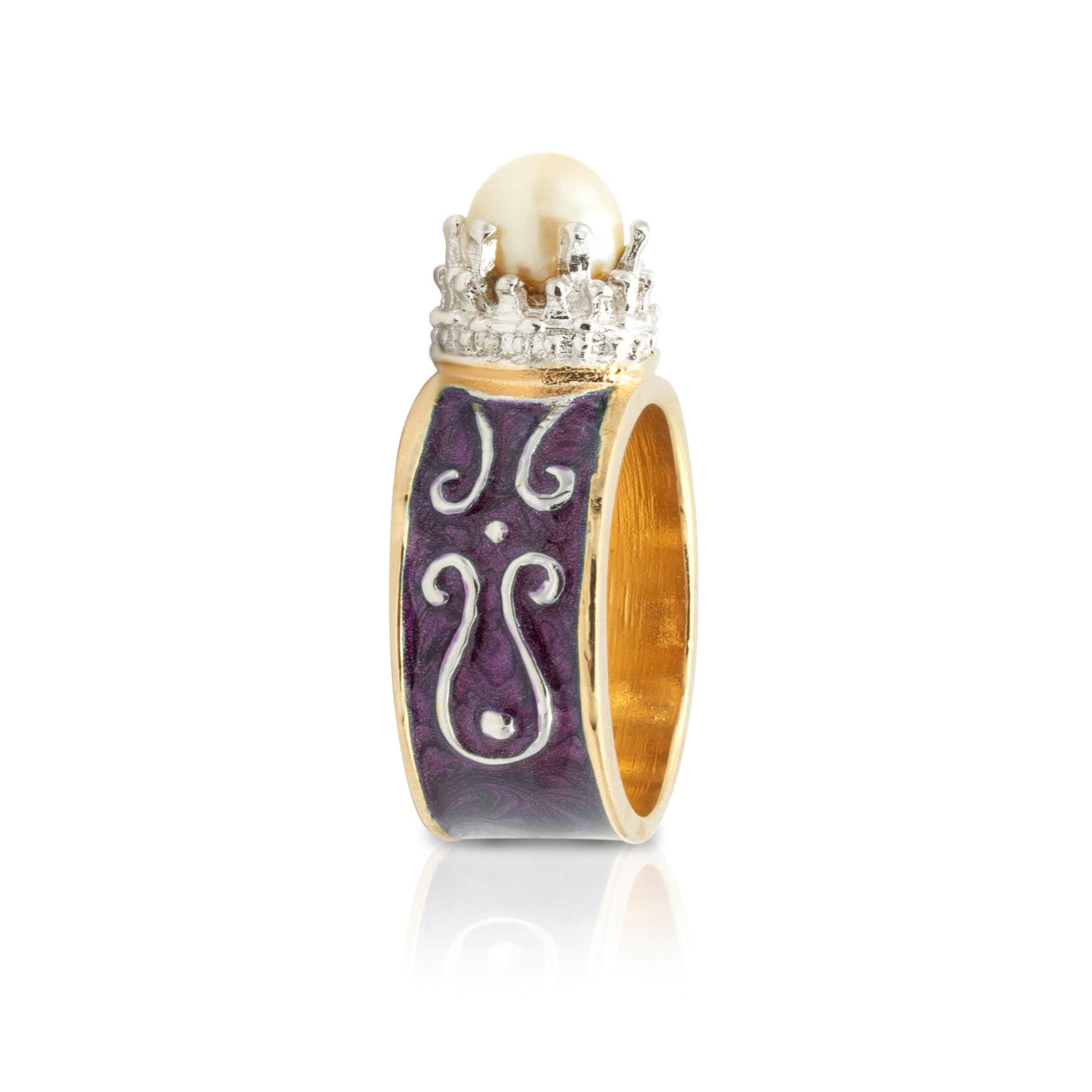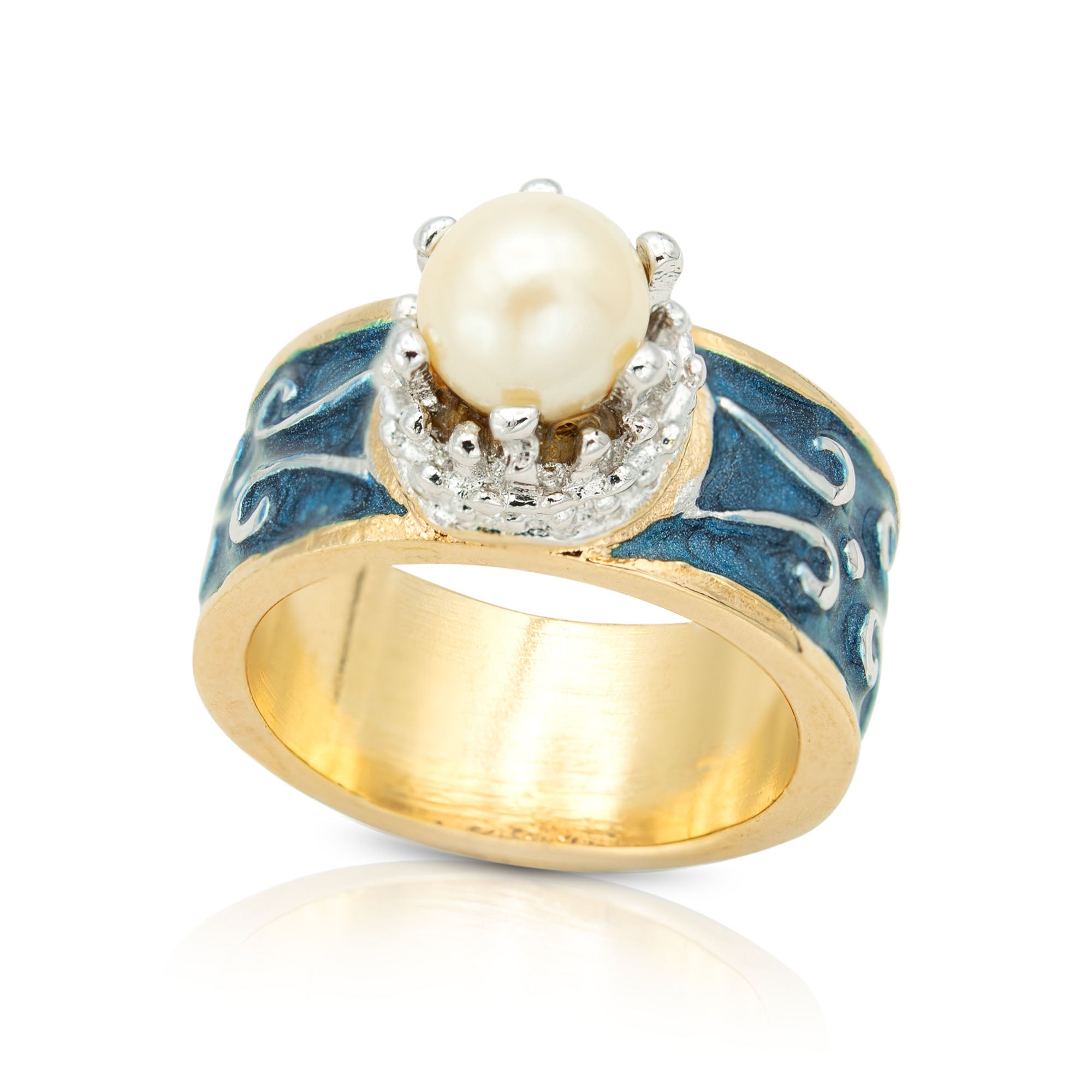 Vintage 1980s Royal Crown Hand Painted Enamel Ring with Pearl Bead 18k Gold Plated #R9014