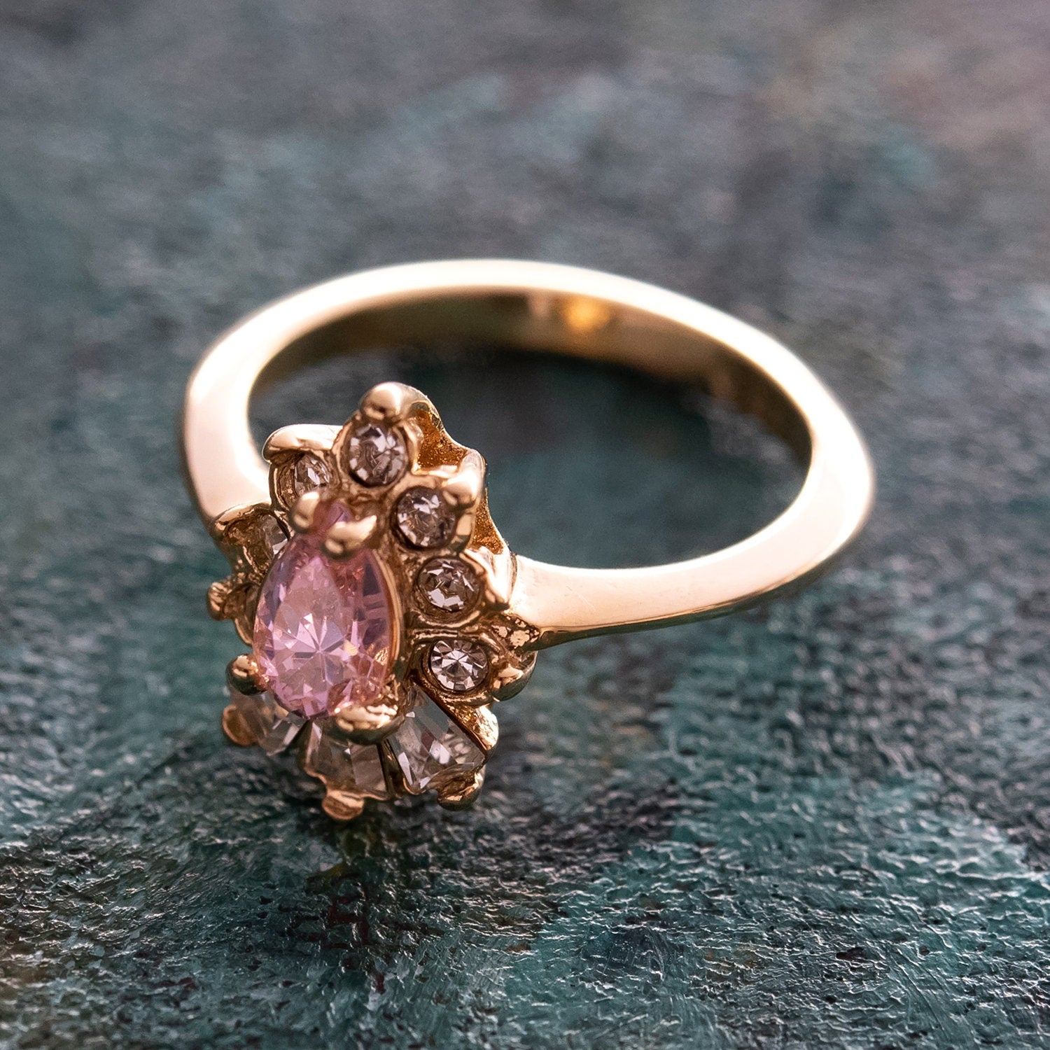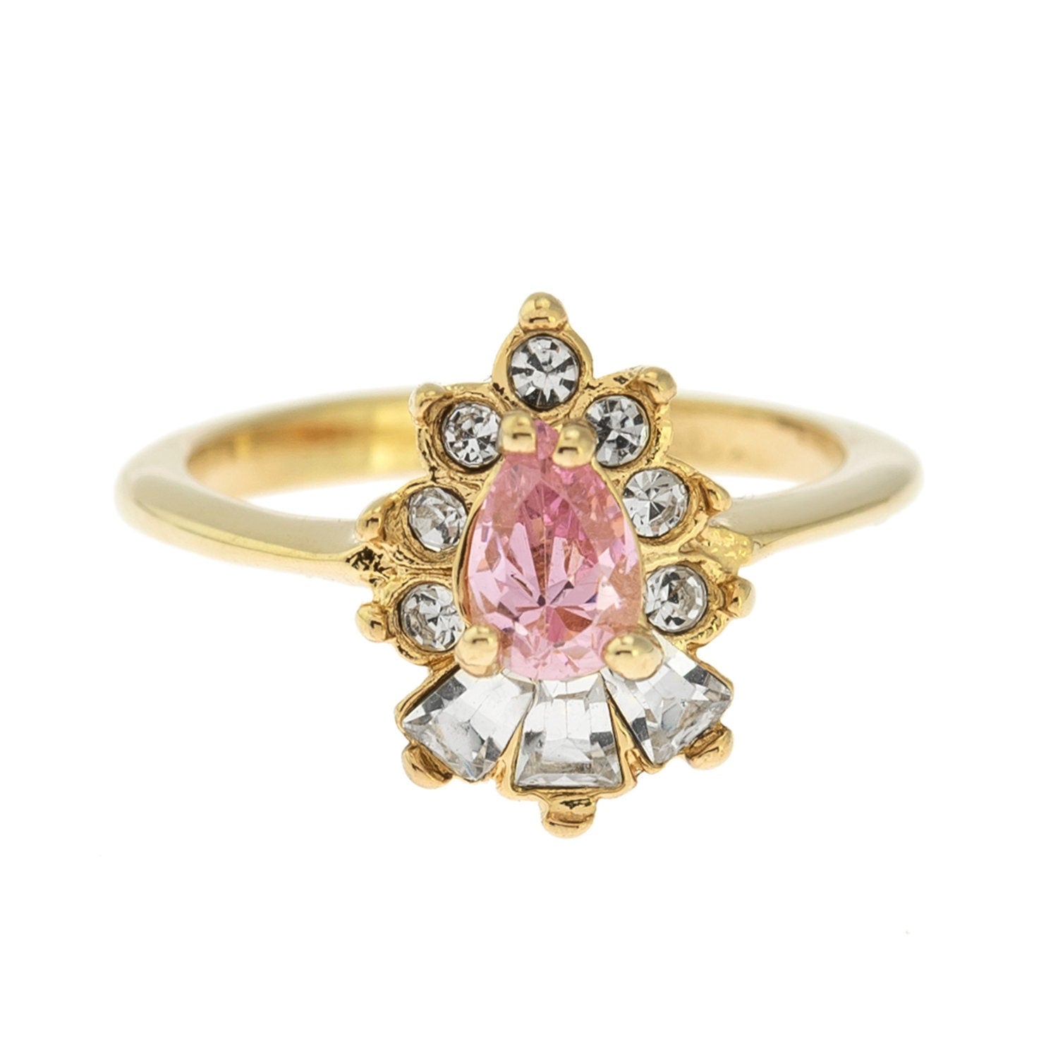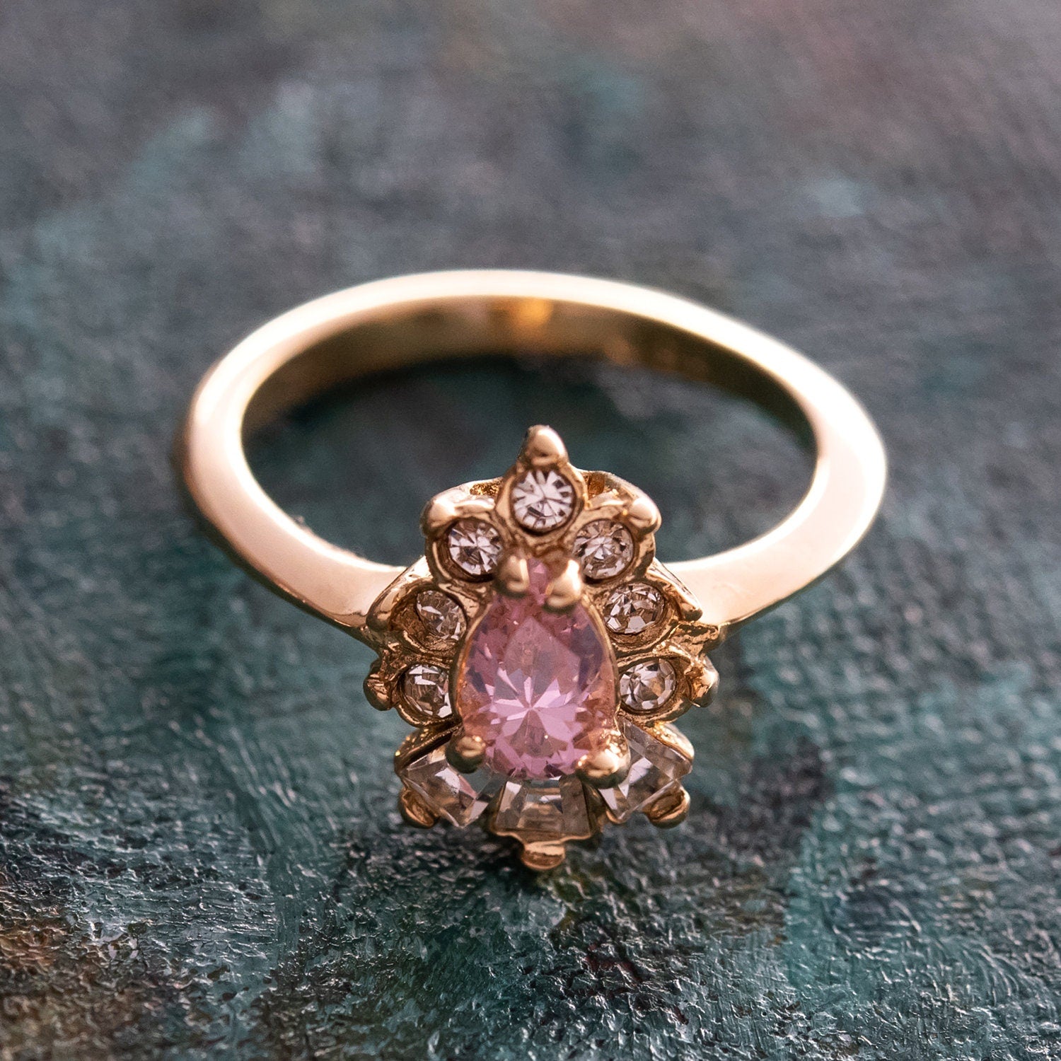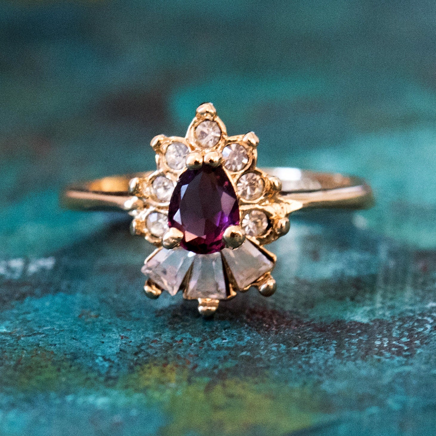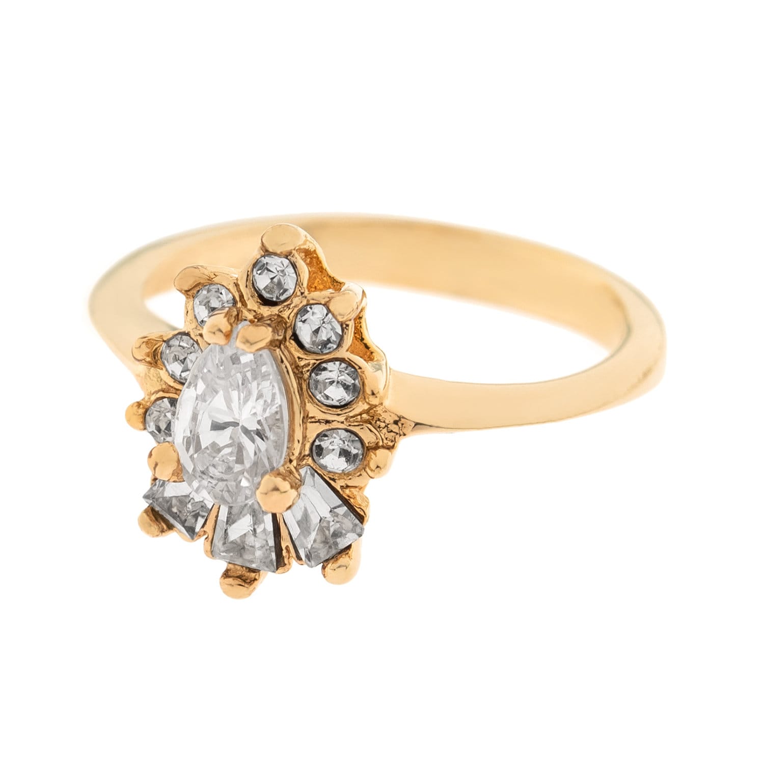 Vintage Ring 1990's Sapphire and Clear Swarovski Crystals 18k Gold Plated Ring R3093 Antique Womans Jewelry - Limited Stock - Never Worn Condition: Excellent (Never worn or owned) Vintage 1990s Cocktail Ring Made in Providence, RI, USA 18k Gold Electroplated Sapphire Austrian Crystal Clear Austrian Crystals September Birthstone Color Stamped - 18k HGE