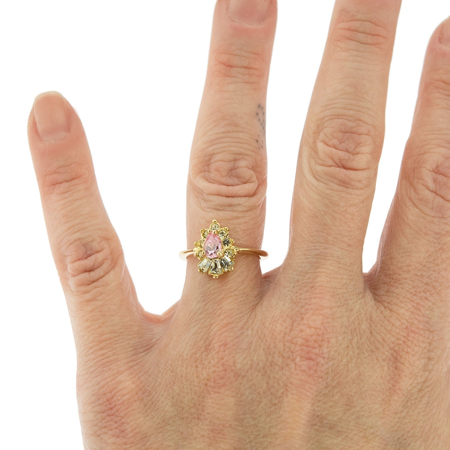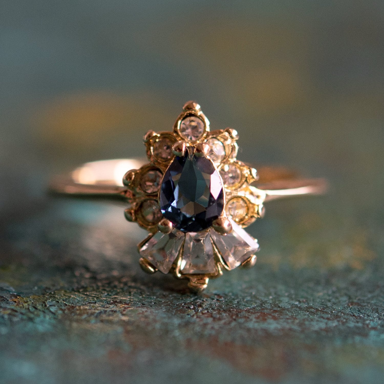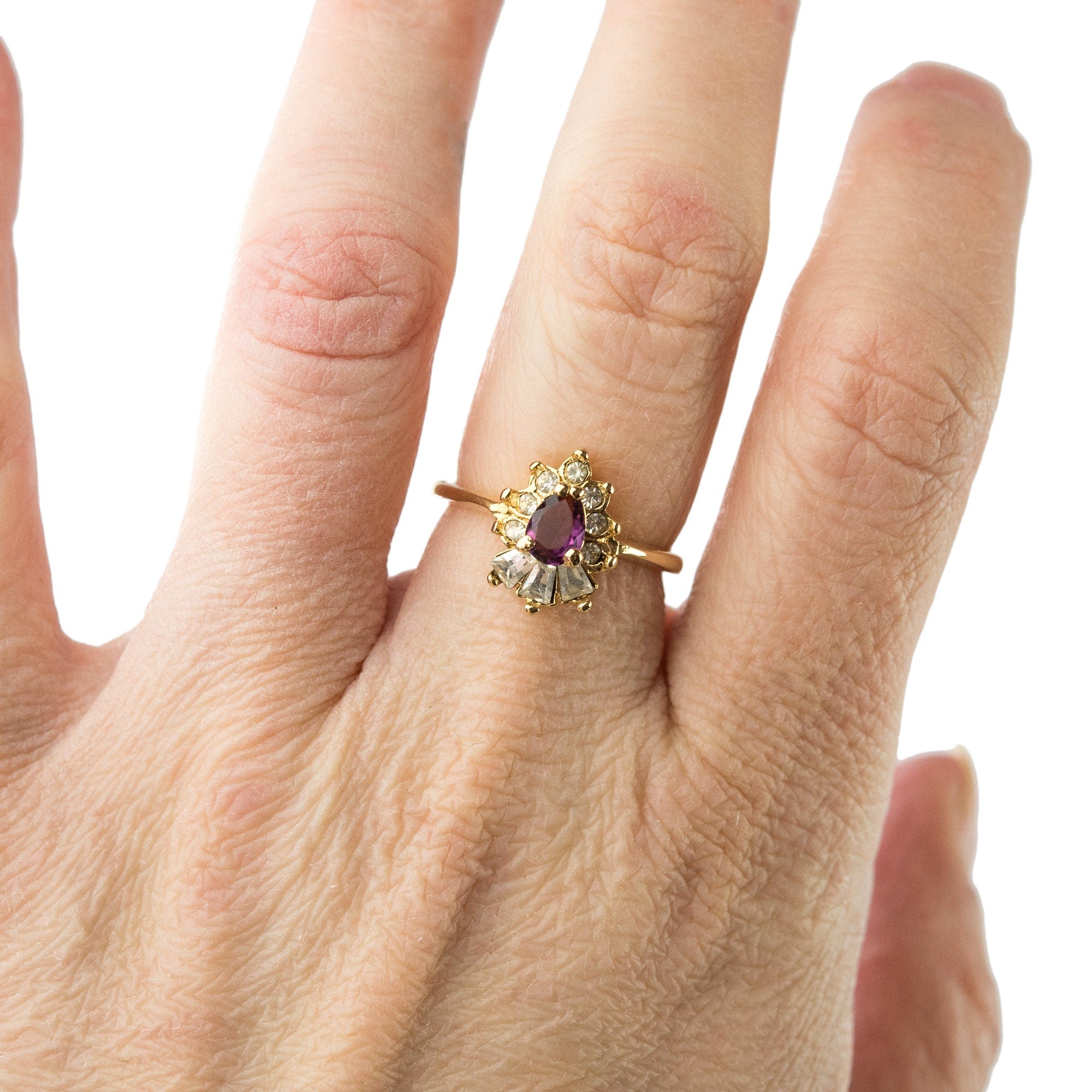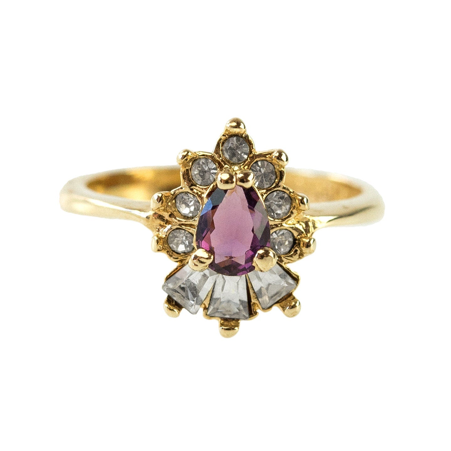 Vintage Ring 1990's Sapphire and Clear Swarovski Crystals 18k Gold Plated Ring R3093 Antique Womans Jewelry
