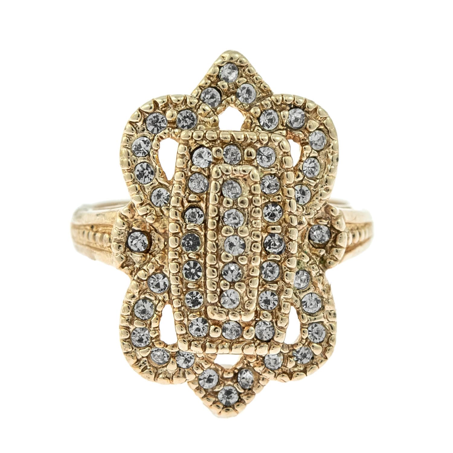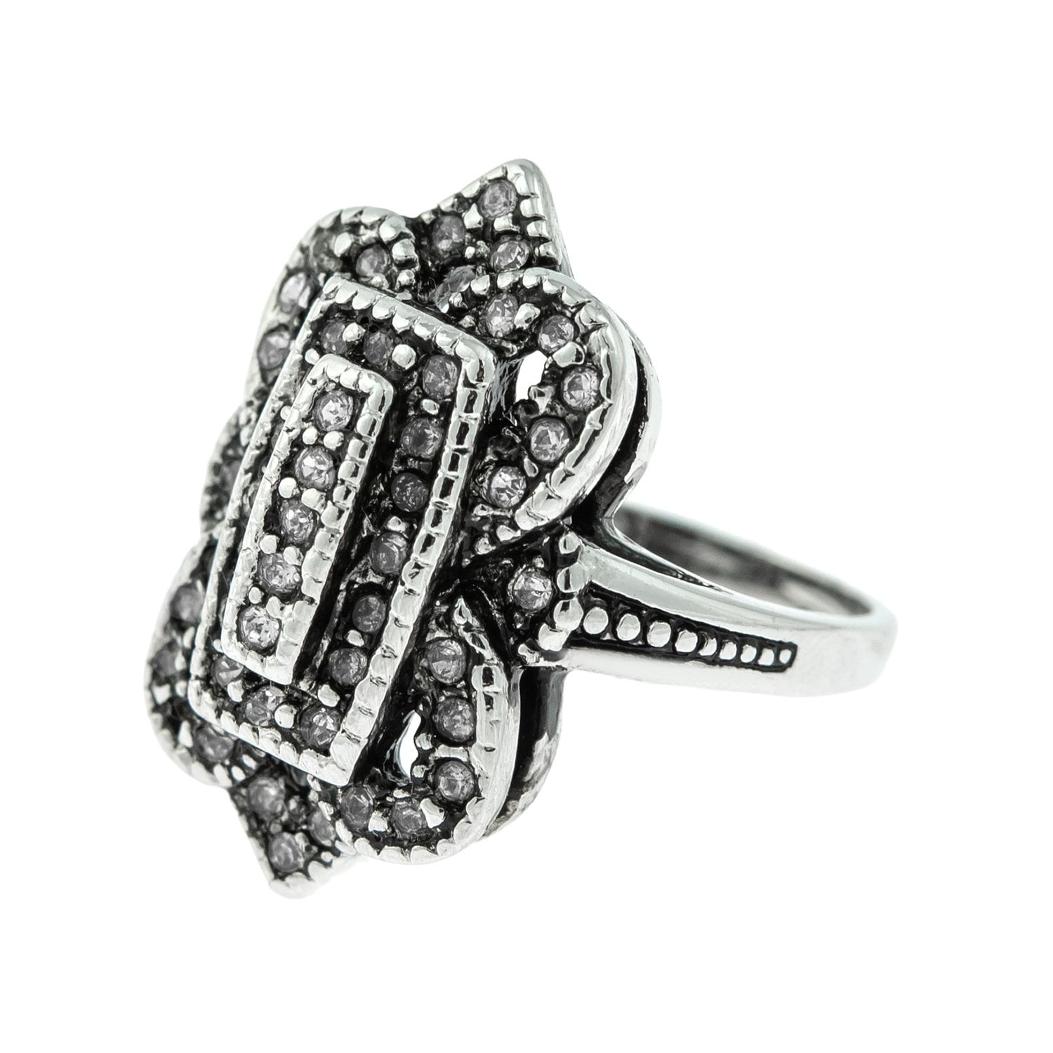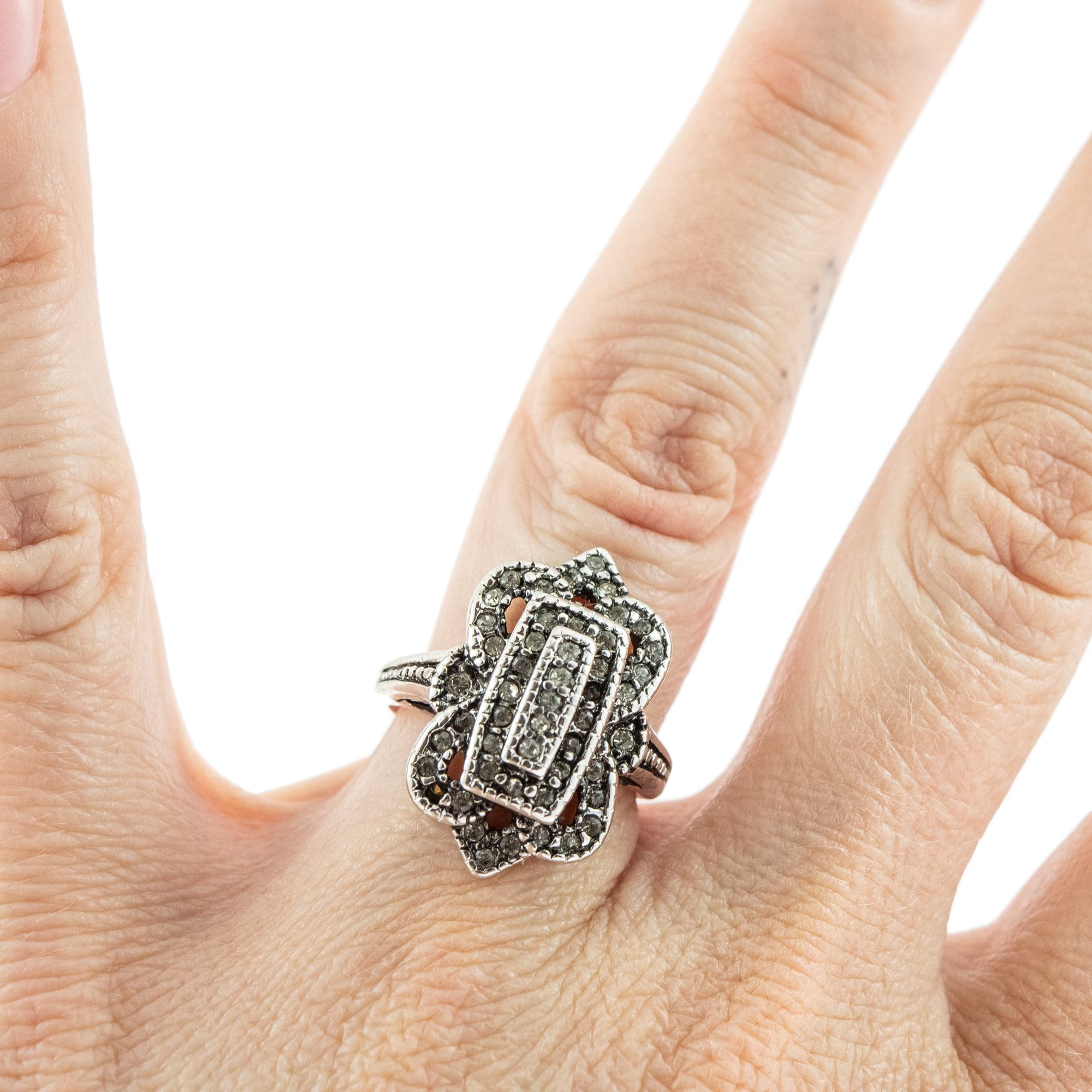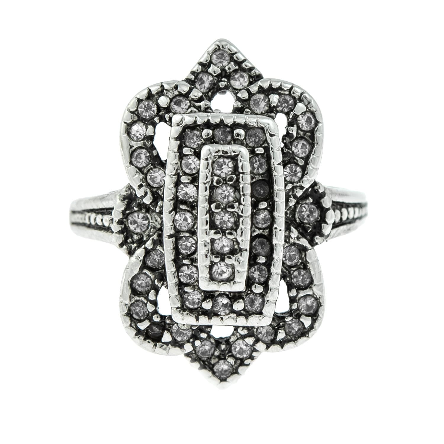 Vintage Ring Clear Swarovski Crystal Antique 18k White Gold Antique Womans Jewlery #R1415 - Limited Stock - Never Worn Condition: Excellent (Never worn and with tags) Vintage 1970s Ring Authentic Edwardian Era Mold Made in Providence, RI, USA Antiqued 18k White Gold Electroplated Clear Swarovski Crystals Stamped - 18k HGE