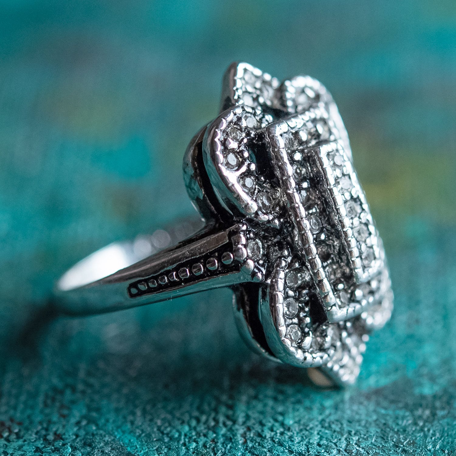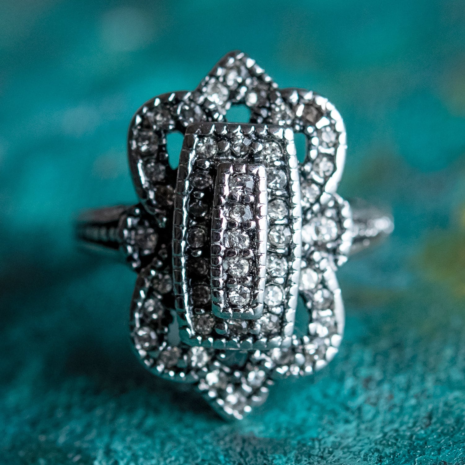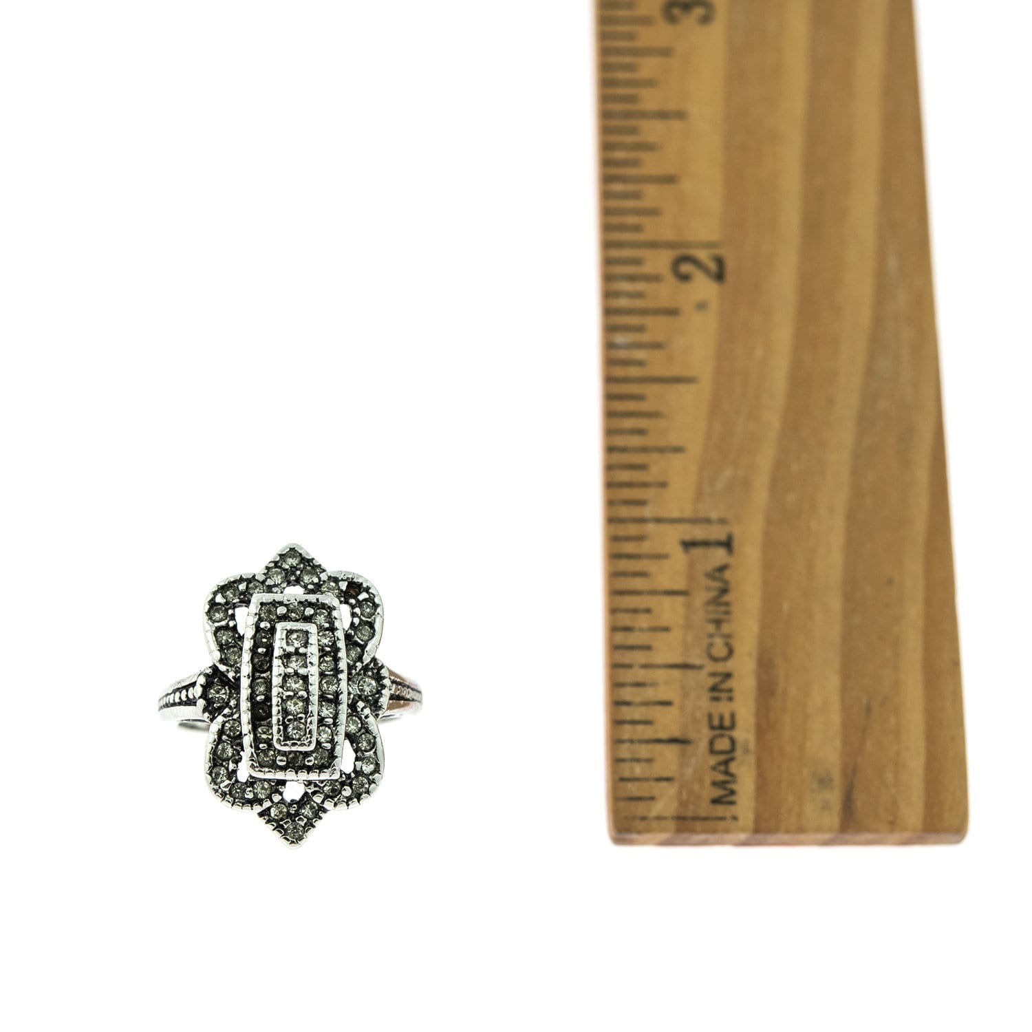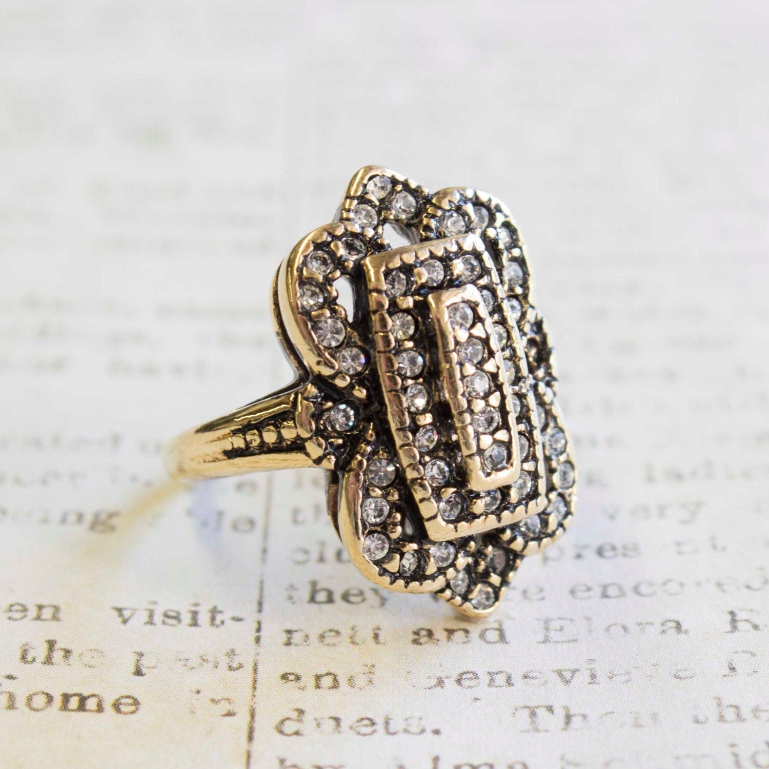 Vintage Ring Clear Swarovski Crystal Antique 18k White Gold Antique Womans Jewlery #R1415 - Limited Stock - Never Worn Condition: Excellent (Never worn and with tags) Vintage 1970s Ring Authentic Edwardian Era Mold Made in Providence, RI, USA Antiqued 18k White Gold Electroplated Clear Swarovski Crystals Stamped - 18k HGE