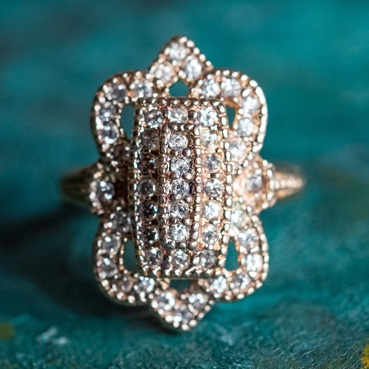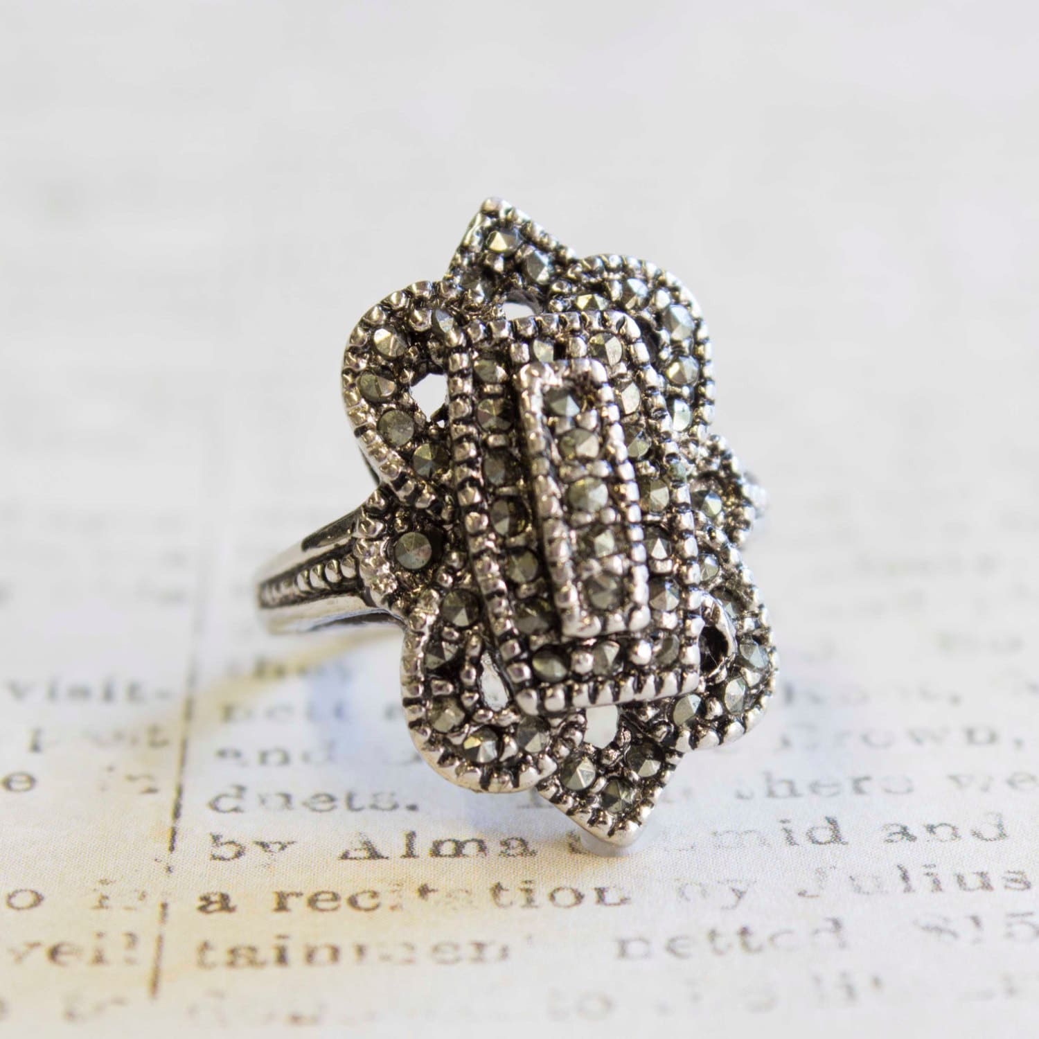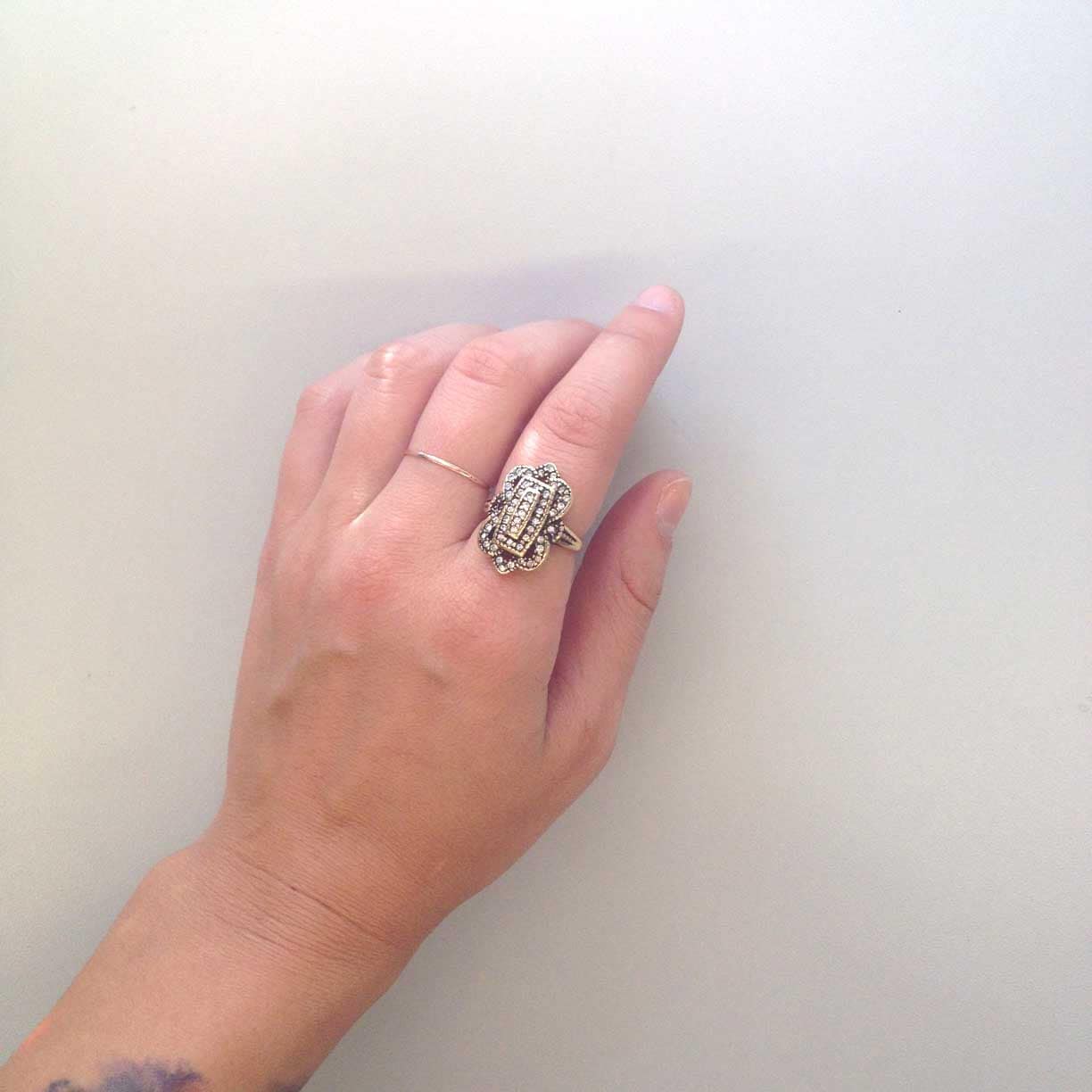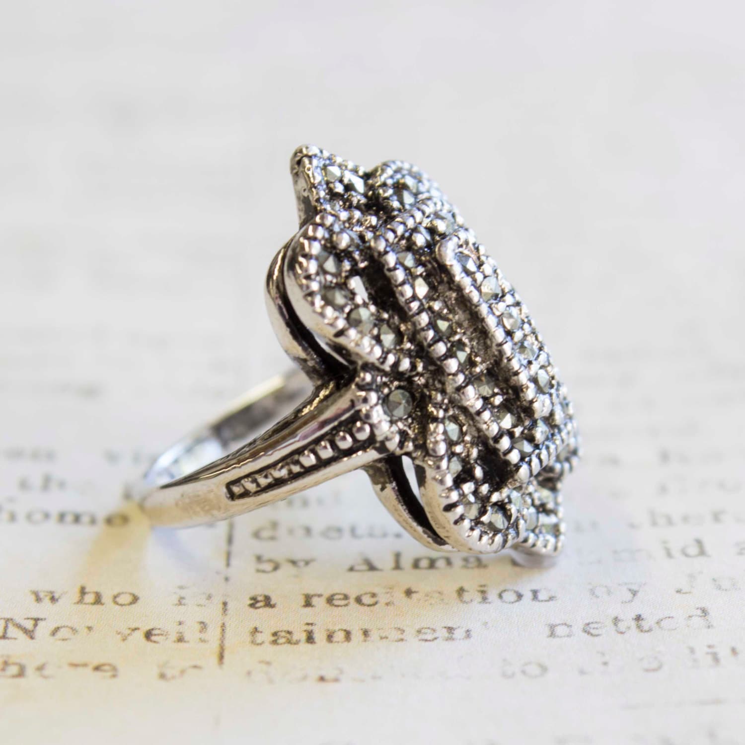Vintage Ring Clear Swarovski Crystal Antique 18k White Gold Antique Womans Jewlery #R1415 - Limited Stock - Never Worn Condition: Excellent (Never worn and with tags) Vintage 1970s Ring Authentic Edwardian Era Mold Made in Providence, RI, USA Antiqued 18k White Gold Electroplated Clear Swarovski Crystals Stamped - 18k HGE