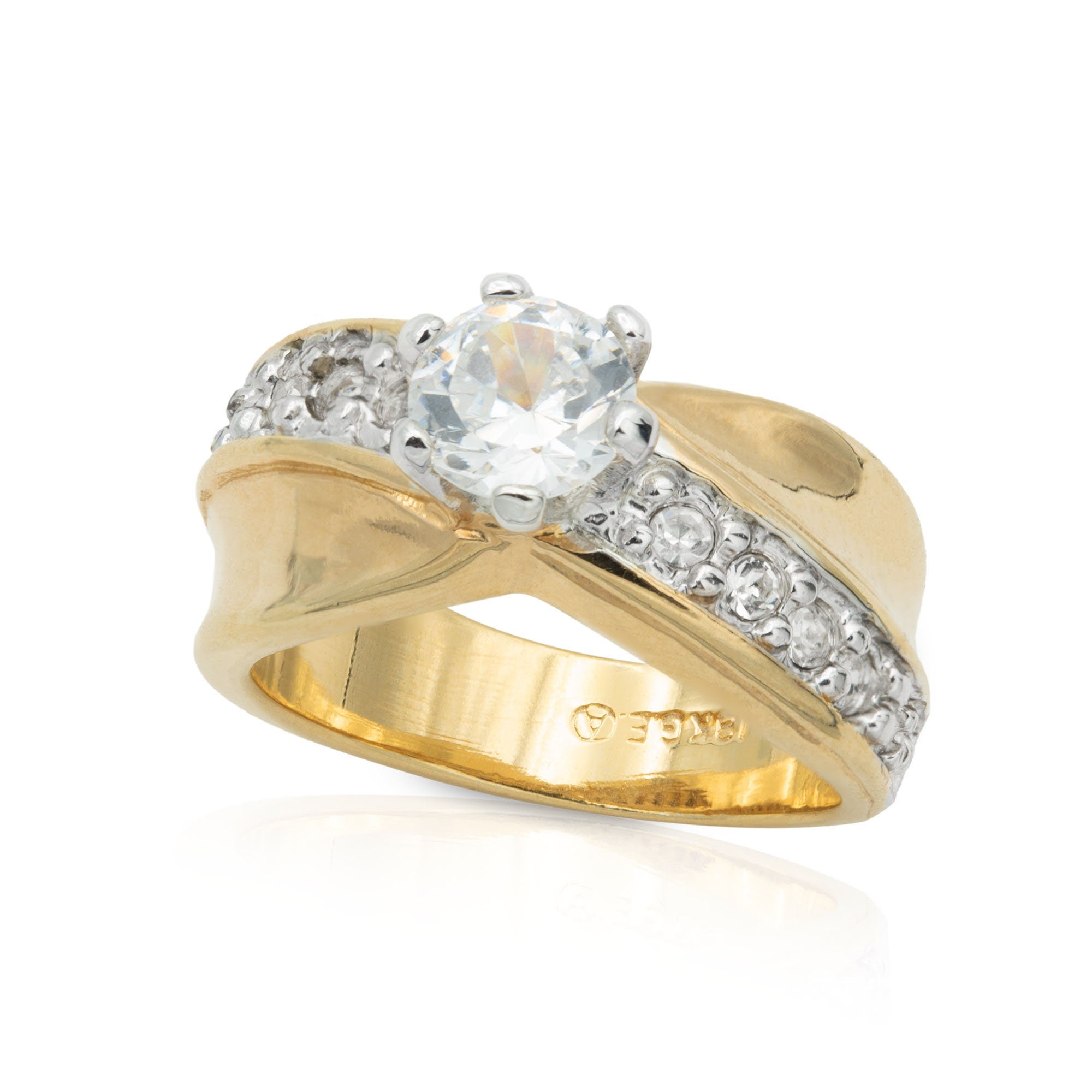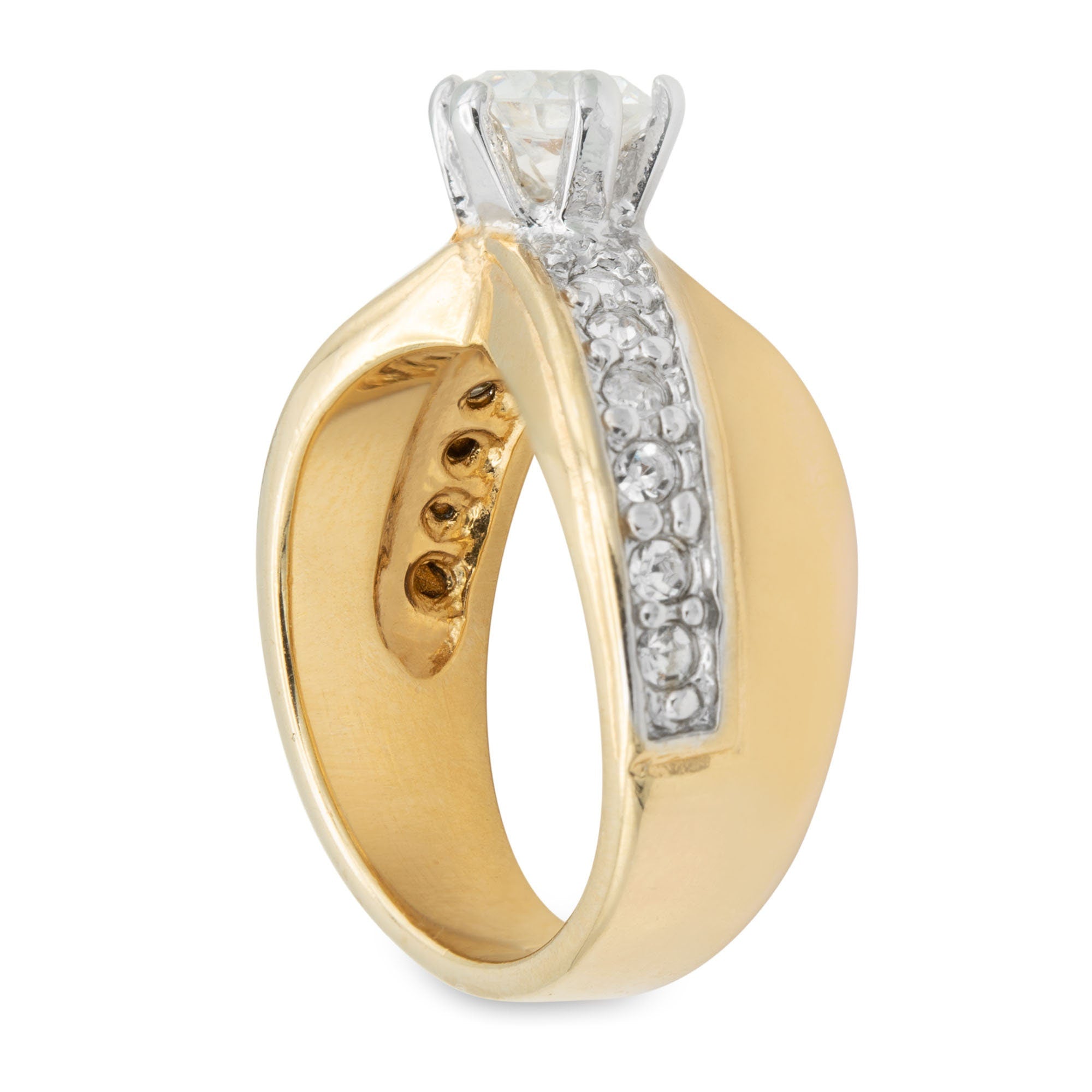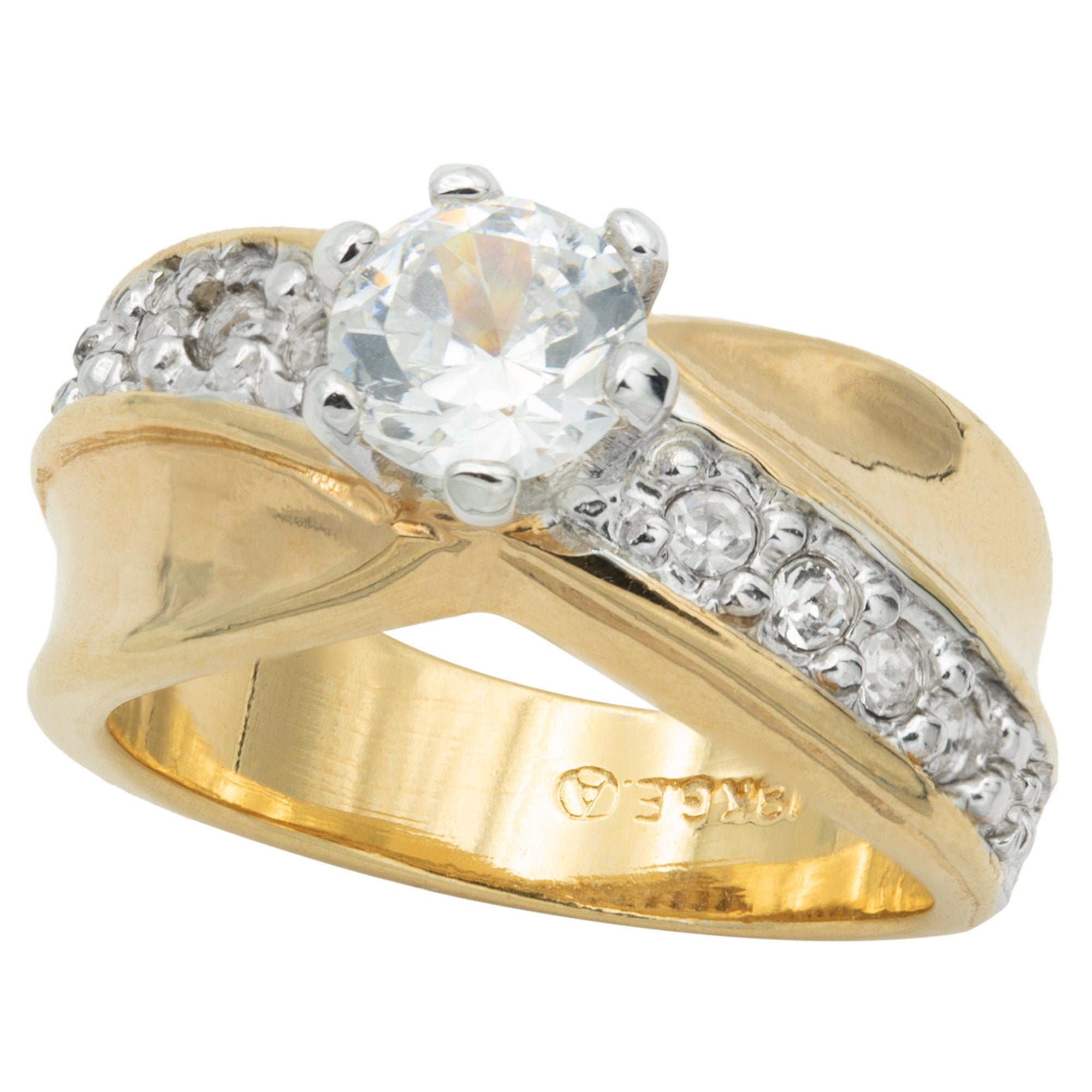 Vintage Ring Cubic Zirconia Solitaire Engagement Style Ring Clear or Ruby 18KT Gold Antique Womans Jewelry #R3139 - Limited Stock - Never Worn Condition: Excellent & SPARKLY! (Never worn or owned) Vintage 1980s Solitaire Engagement Style Ring Made in Providence, RI, USA 18k Gold Plated - Silver Tone Round Cut Cubic Zirconia Stone 1 CT. Total Weight Band has 6 Small stones on either side of the Soliaire Height of Setting: 1/4 inch April's Birthstone Color Stamped - 18k HGE