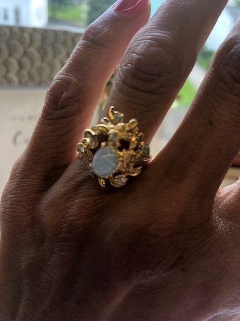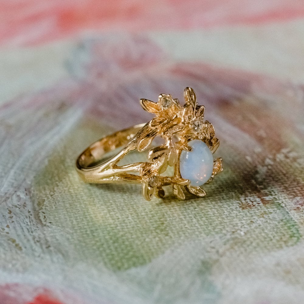 Vintage Ring Flower Petals Ring with Jelly Opal and Clear Crystals 18k Gold Antique Womans Jewelry R245 - Limited Stock - Never Worn Vintage 1980s Made in Providence, RI, USA 18k Gold Electroplated Jelly Opal Clear Austrian Crystals October's Birthstone Color Stamped - 18k HGEs