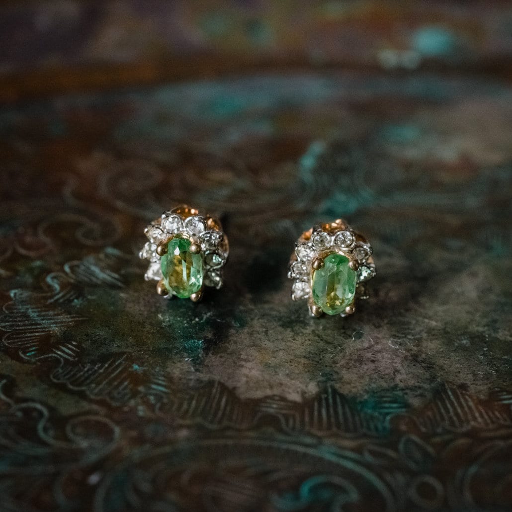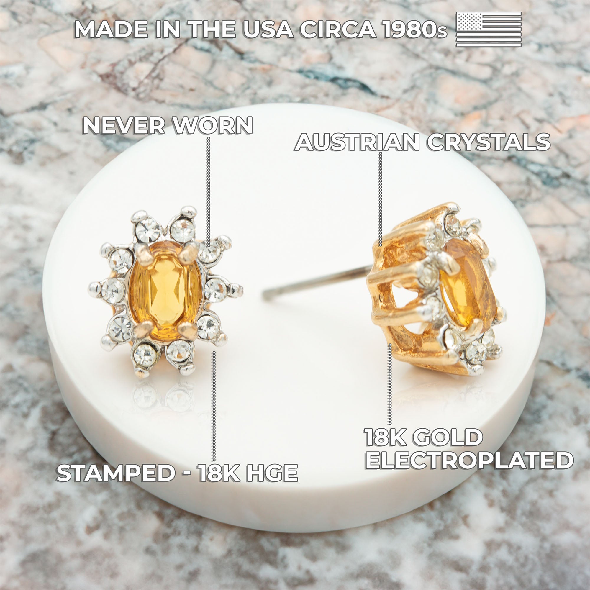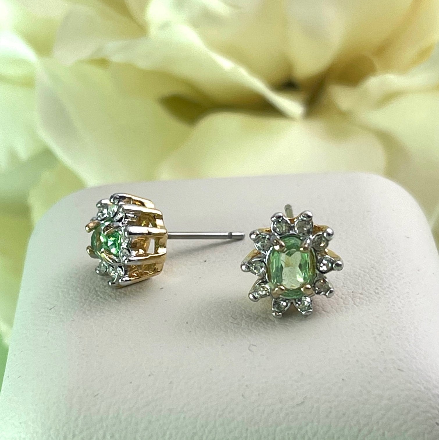Enhance your jewelry collection with these stunning Vintage 18k Gold Electroplated Crystal Earrings, available in four vibrant colors: peridot, ruby, topaz, and emerald. These unique earrings have never been worn or previously owned, and they feature post backs for a secure and comfortable fit. Their brilliant stones are hand-set in an 18k gold electroplated setting, ensuring they catch the light beautifully with every movement. Perfect for anyone who appreciates vintage elegance with a touch of color, these earrings promise excellent quality and craftsmanship that make them a truly special find.