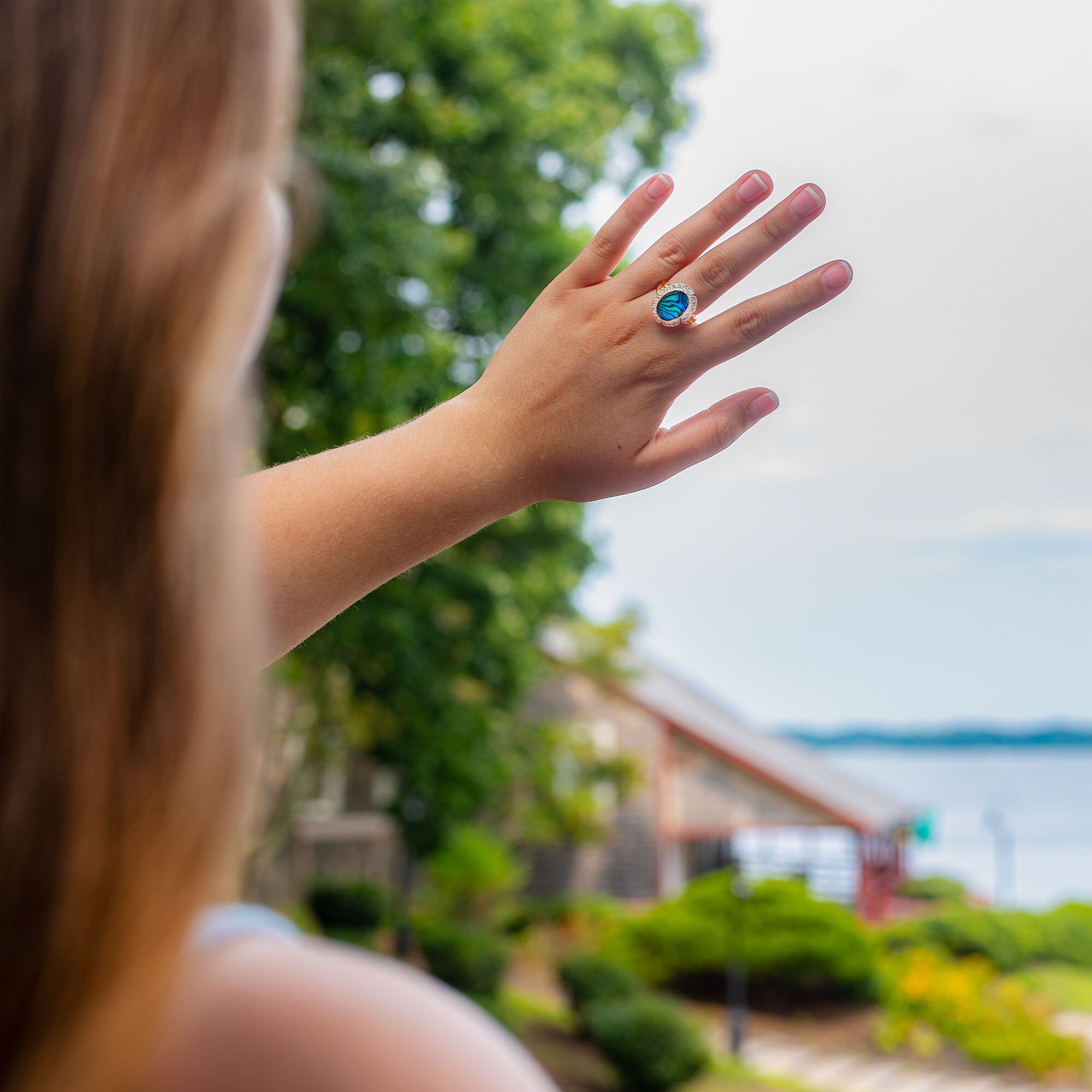 Genuine Pink, Blue, or Green, Abalone Stone Ring Vintage 1970s 18k Yellow Gold Plated Clear Austrian Crystals Woman's Handmade Jewelry #R1730