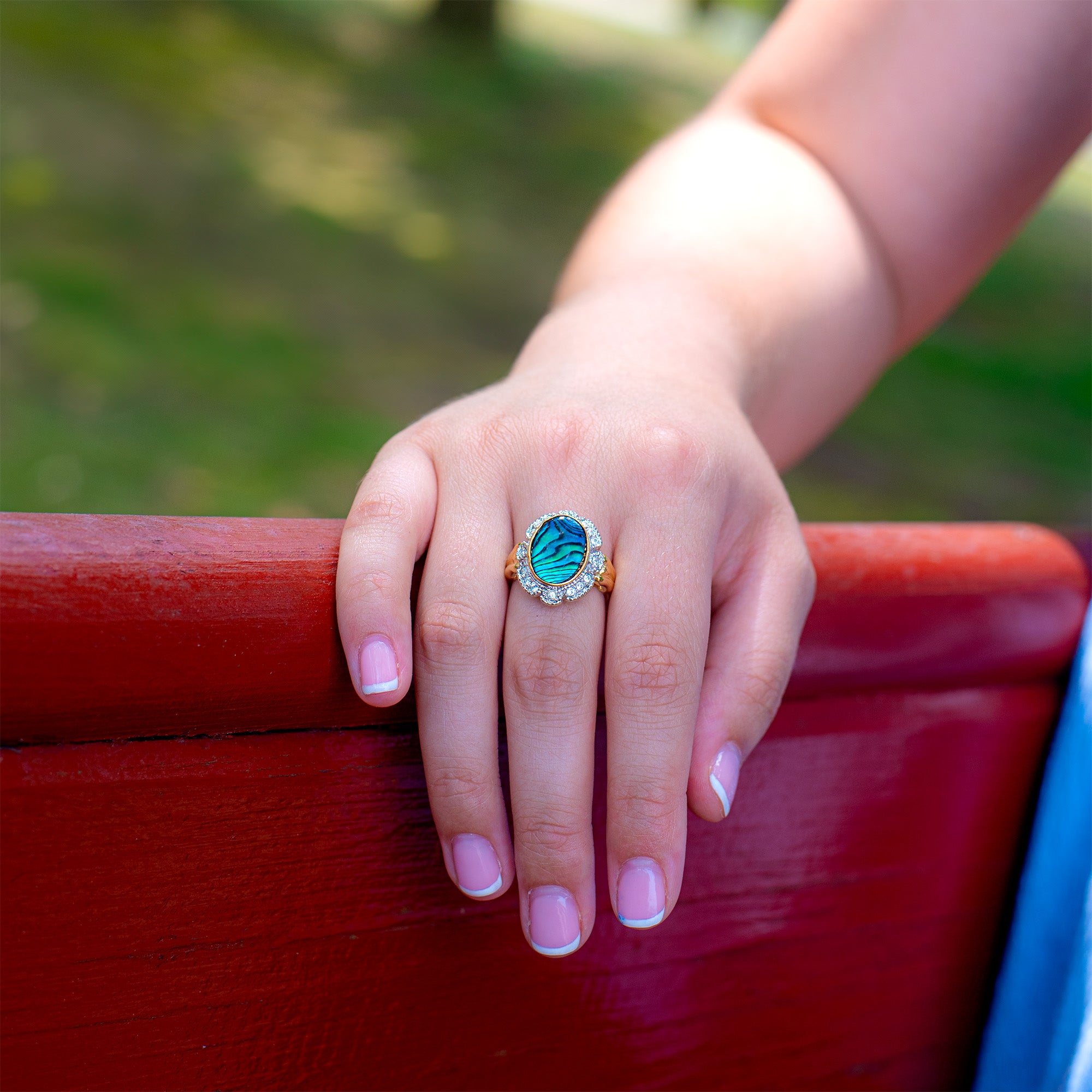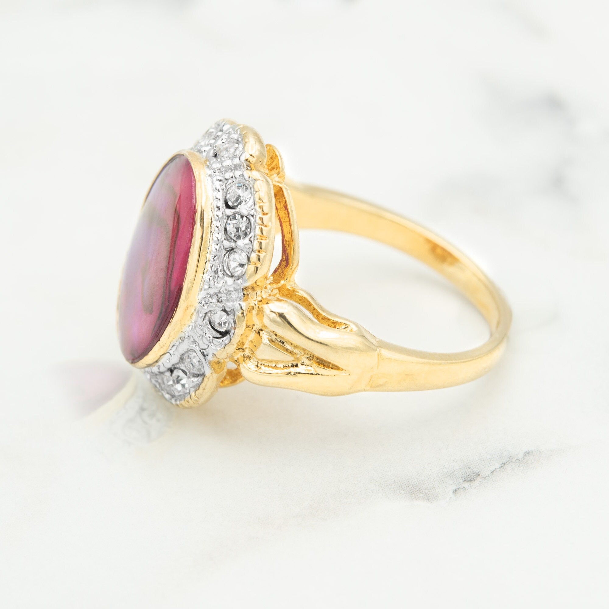 • Genuine Pink, Blue, or Green, Abalone Stone Ring Vintage 1970s 18k Yellow Gold Plated Clear Austrian Crystals Woman's Handmade Jewelry #R1730