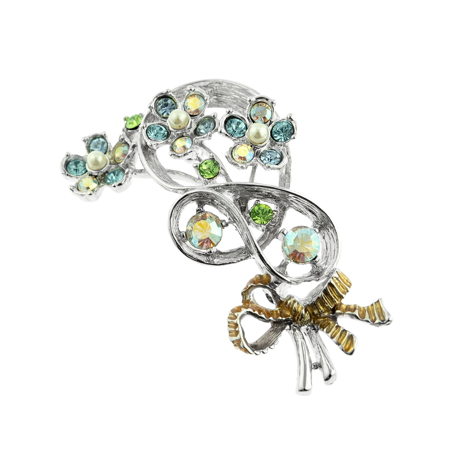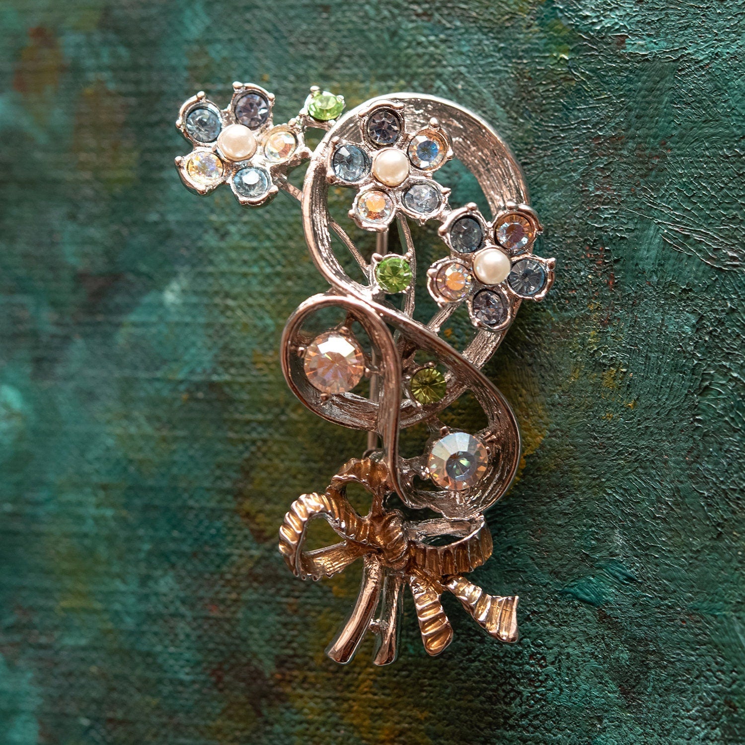 Vintage Oscar de la Renta Pin with Aurora Borealis Cubic Zirconia and Colorful Austrian Crystals Accented with Pearl Bead Details Pin Measures 2-1/2" Pin is Stamped with Oscar de la Renta on Back