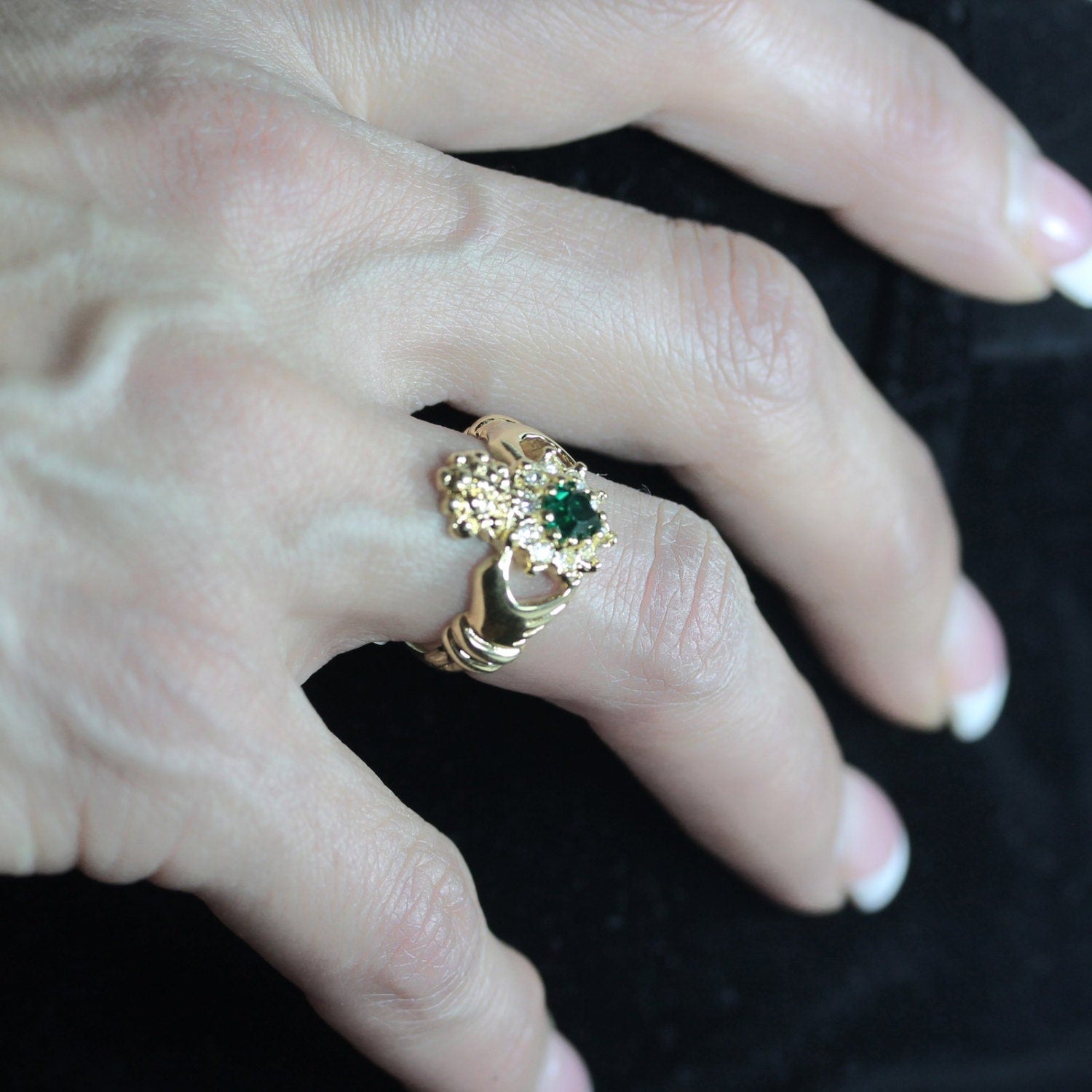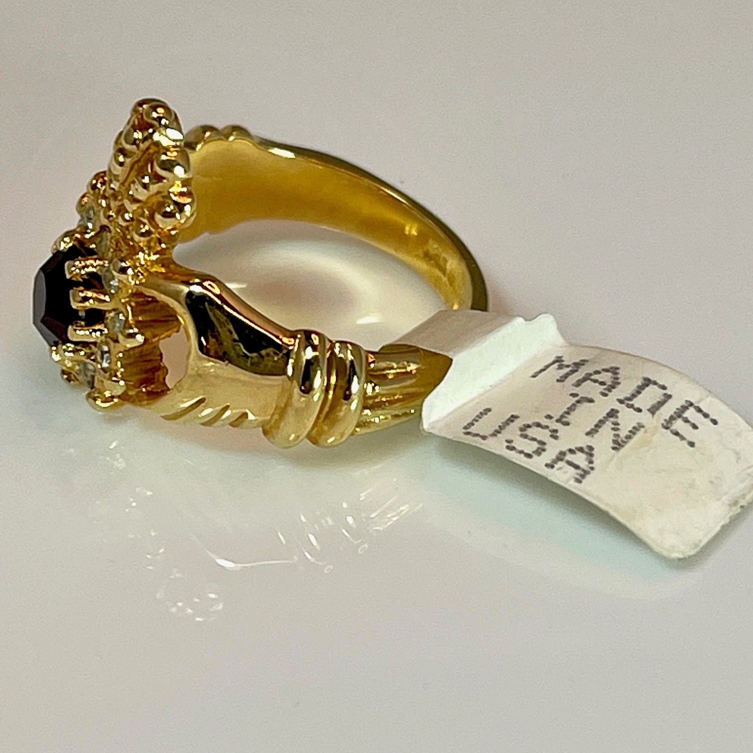 Condition: Excellent (Never worn and with tags) 1970s Vintage Claddagh Ring Made in Providence, RI, USA 18k Gold Electroplated Gold Tone Claddagh Ring with Faceted Emerald Austrian Crystal Clear Austrian Crystals Accents January Birthstone Color Size 7 Stamped - 18k HGE More Vintage Claddaghs:
