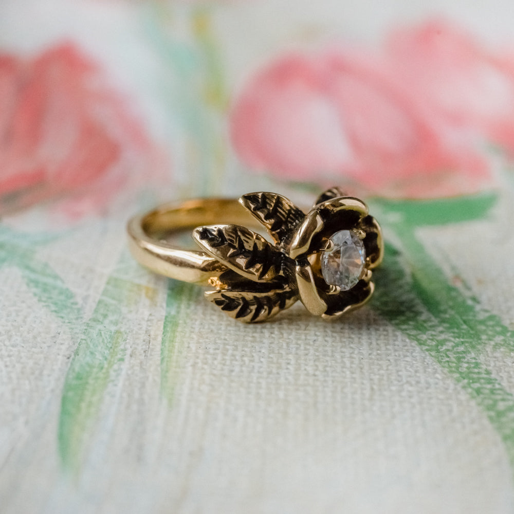 Vintage Ring 1980's design inspired by the Victorian Era Flower rings. Cubic Zirconia (1 ct.) Antiqued 18k Yellow Gold Electroplated R2920 Condition: Excellent (Never worn) Made in Providence, RI, USA Clear Cubic Zirconia April's Birthstone Unique Engagement Ring