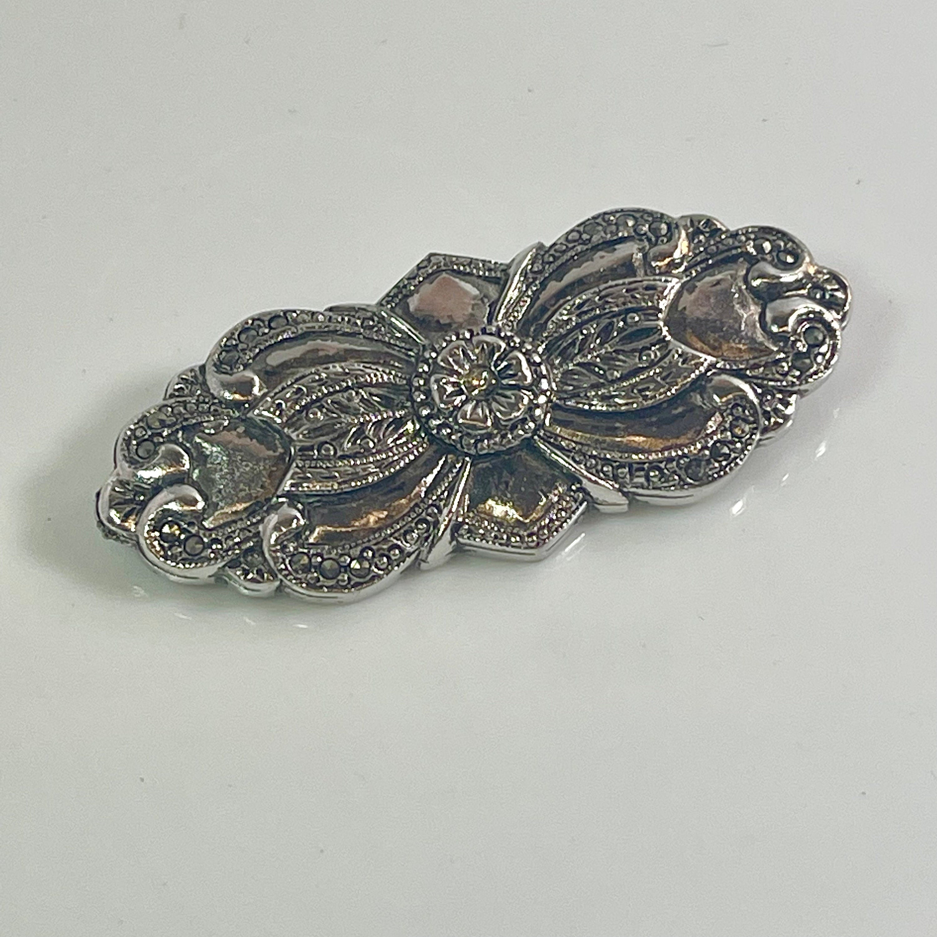 Vintage Brooch Victorian Era Pin Design Diamond Chip Stone with 20 Genuine Marcasite Stones, 18kt White Gold Electroplated Antique Design