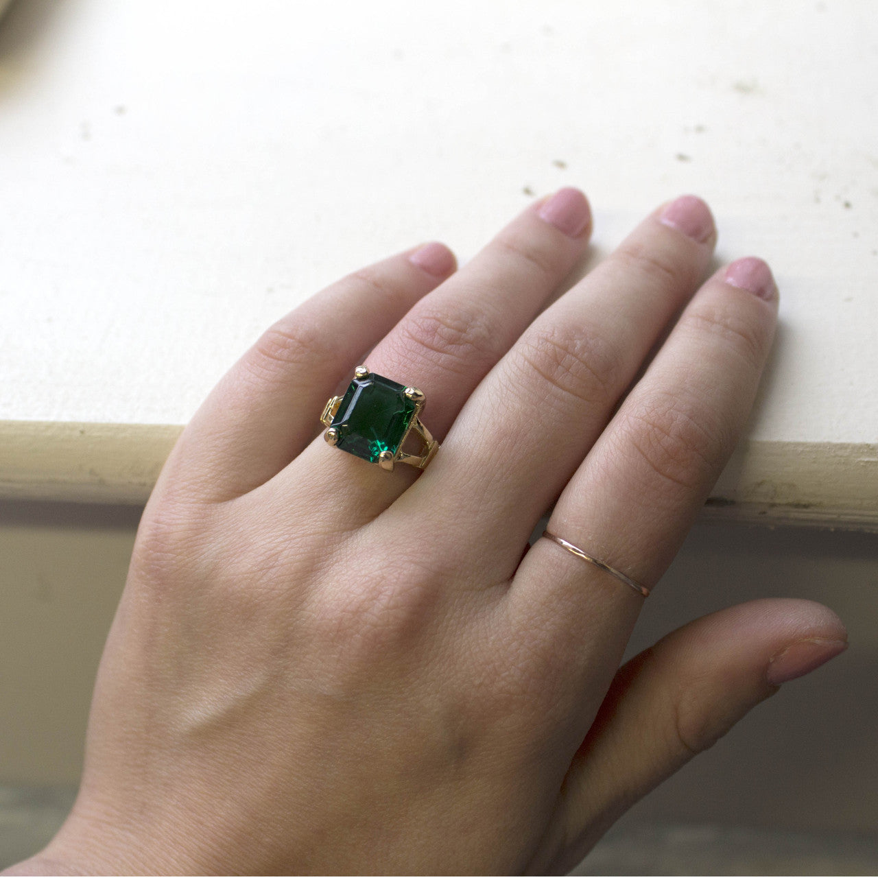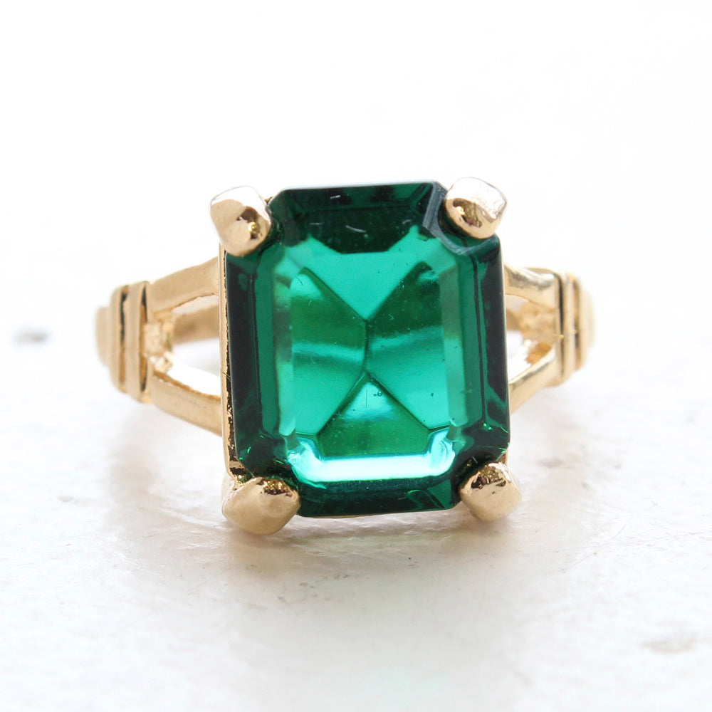 Vintage Ring Emerald Cut Emerald Austrian Crystal 18kt Antiqued Yellow Gold Plated Filligree Ring