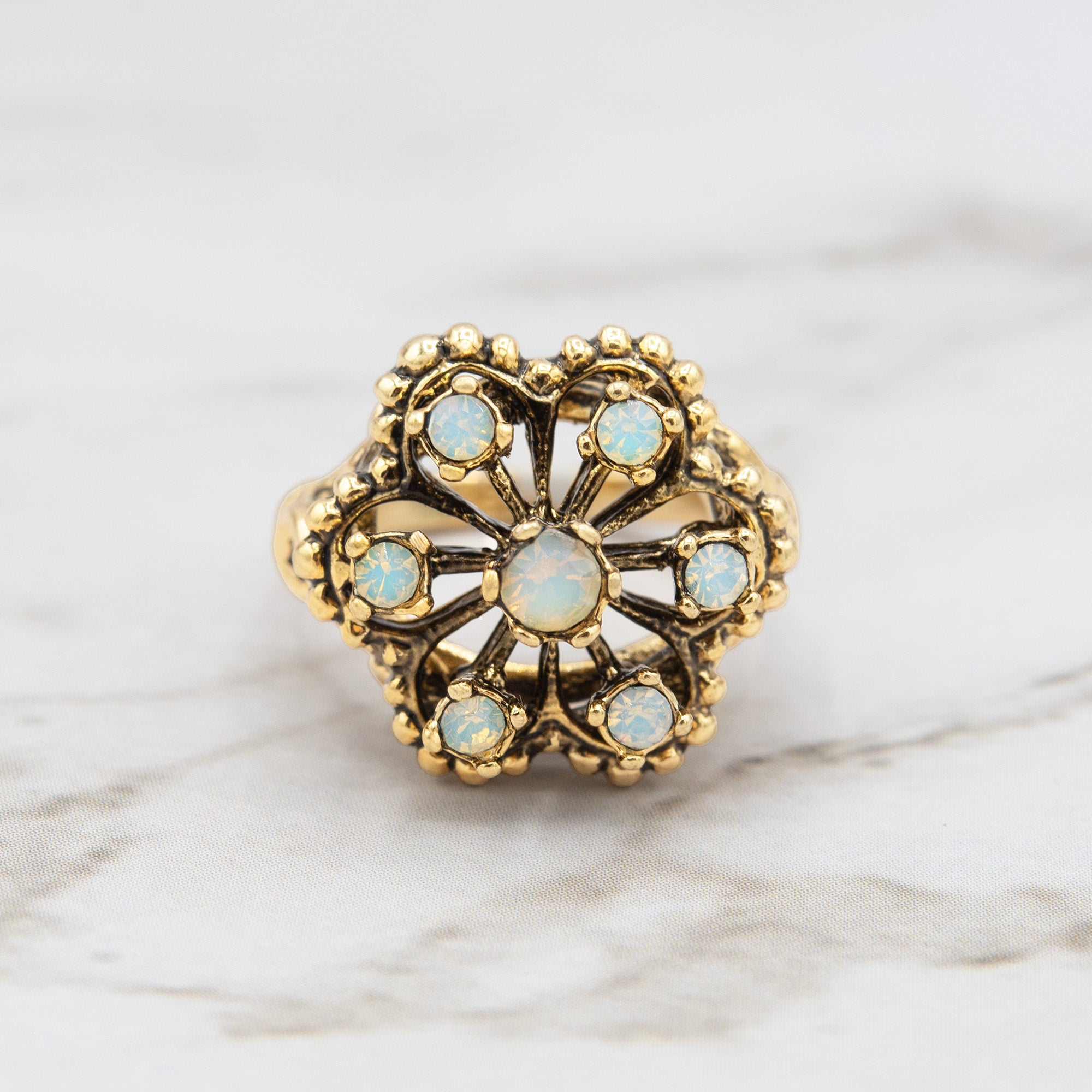 Vintage Ring Flower Petals Ring with Jelly Opal and Clear Crystals 18k Gold Antique Womans Jewelry R245 Size: 5