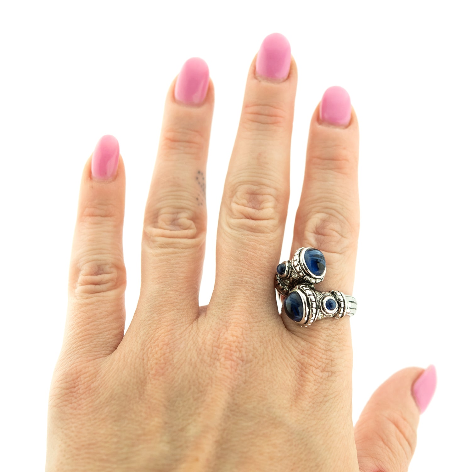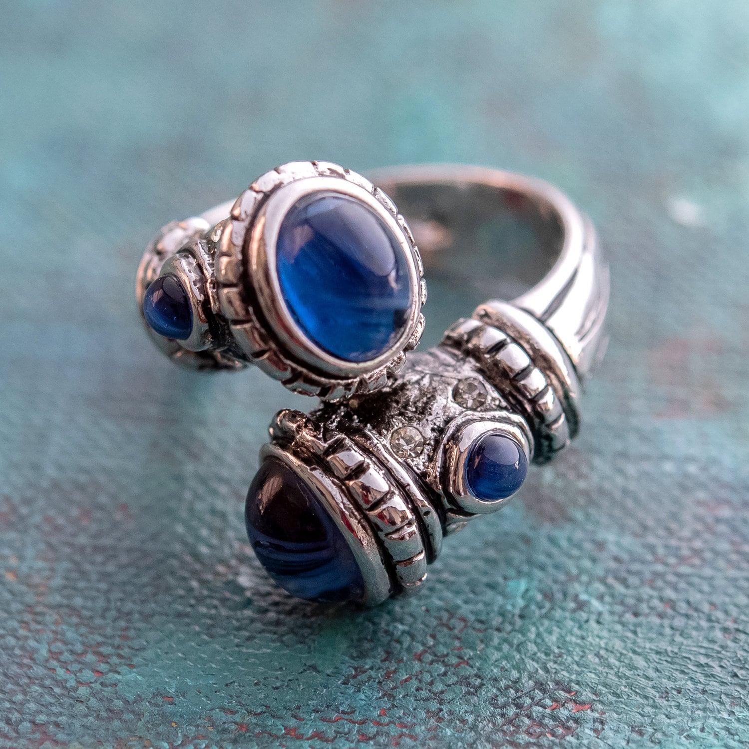 • Vintage Ring 1990's Montana Sapphire Glass Cabochon Stones 18k White Gold Silver Plated #R3438 Size: 9