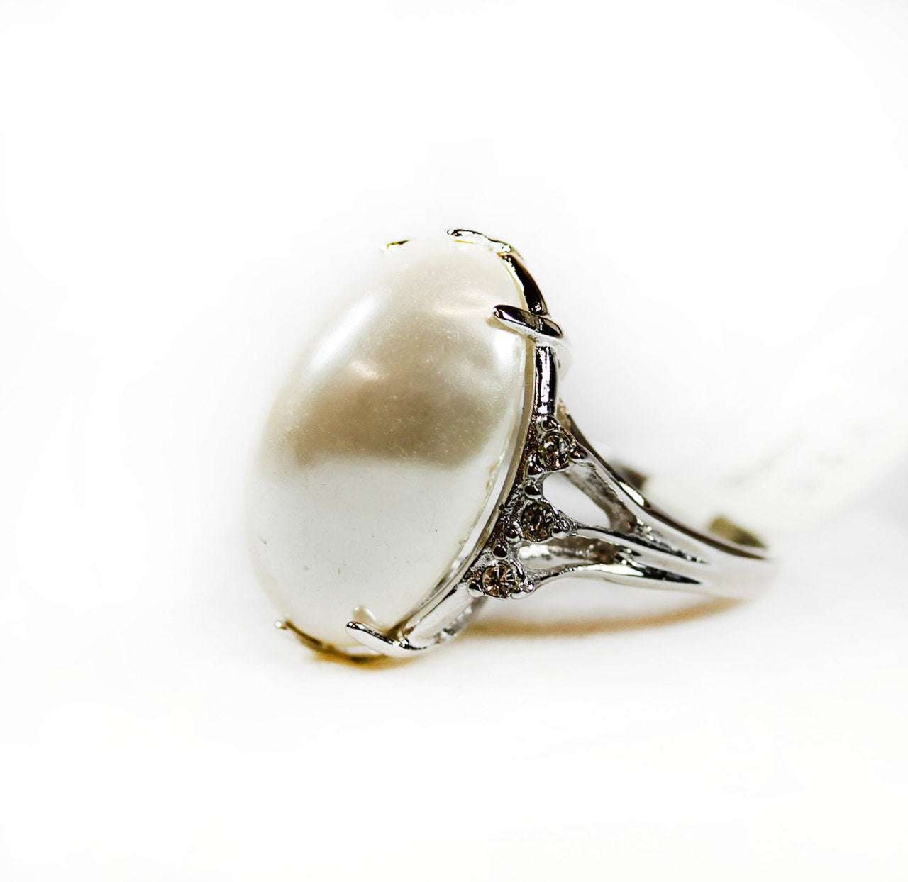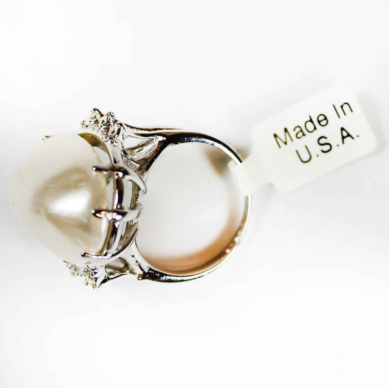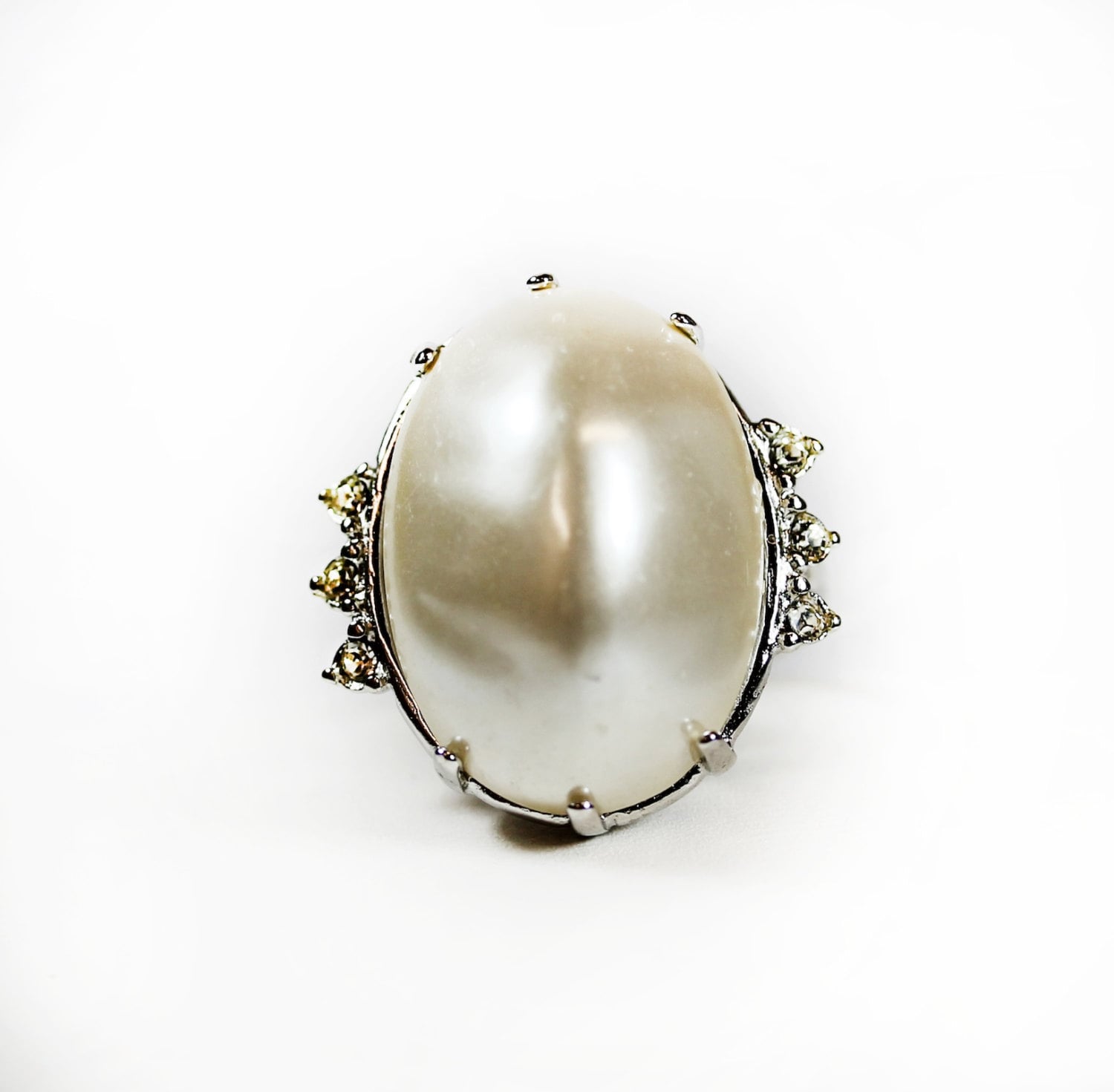 Vintage Ring 1970s Mabe Pearl 18k White Gold Clear Swarovski Crystals Cocktail Ring Antique Jewelry for Women #R1910 Condition: Excellent (Never worn and with tags) Vintage 1970s Cocktail Ring Made in Providence, RI, USA 18k White Gold Electroplated Faux Mabe Pearl Pearl Measures 25mm x 17.5mm Clear Austrian Crystals Stamped - 18k HGE June's Birthstone [SKU:E172033004]