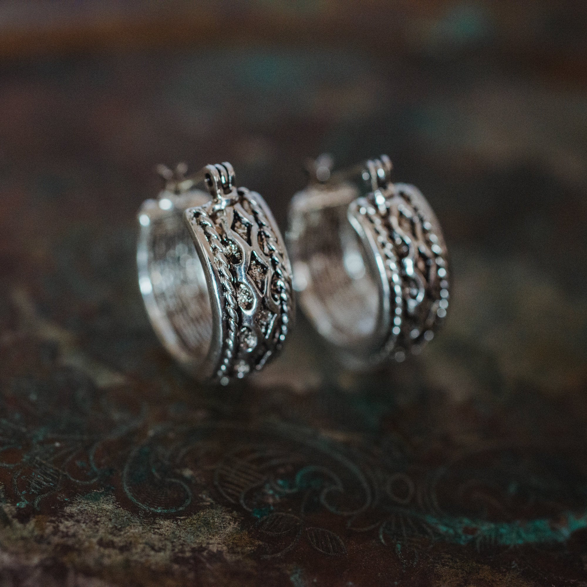 Antiqued 3/4" Earrings While supplies last, enjoy our Vintage Oscar De La Renta Collection! Vintage Oscar De La Renta Hoop Earrings Condition - Excellent - Never worn or previously owned Gorgeously thick and great quality hoops! Filigre Design Antiqued Silver Tone Post Backs Measurements: Hoop Width: 1/4 in. / 4mm Hoop Diameter: 3/4 in. / 11mm