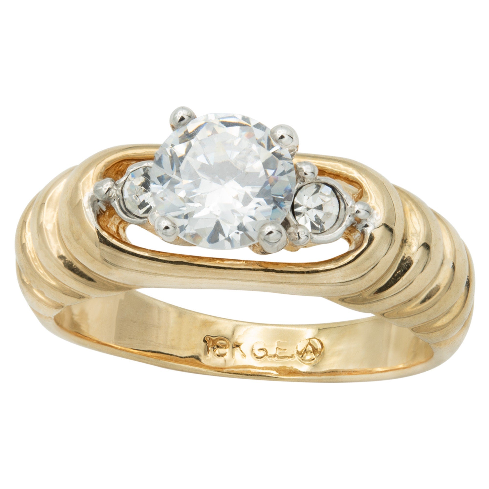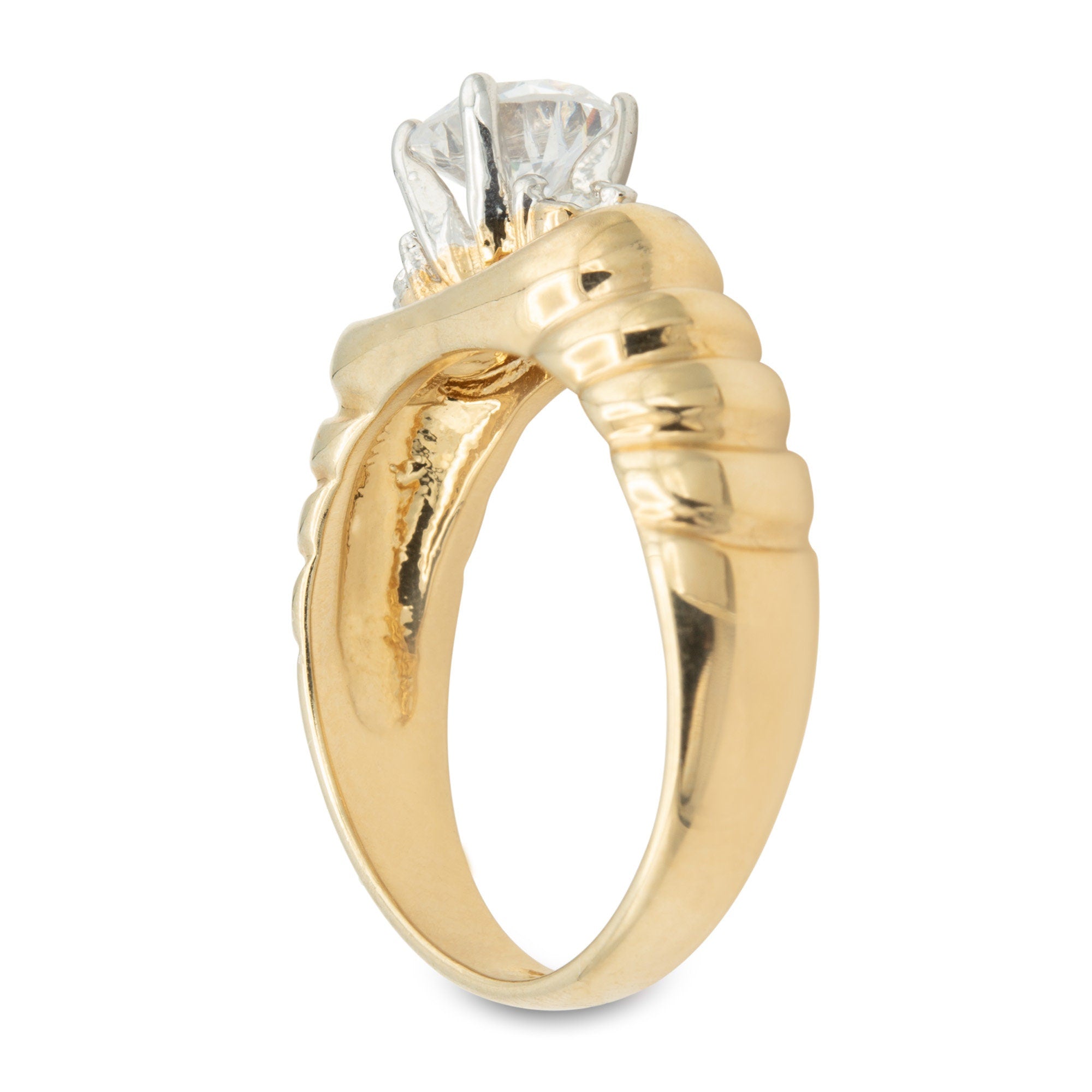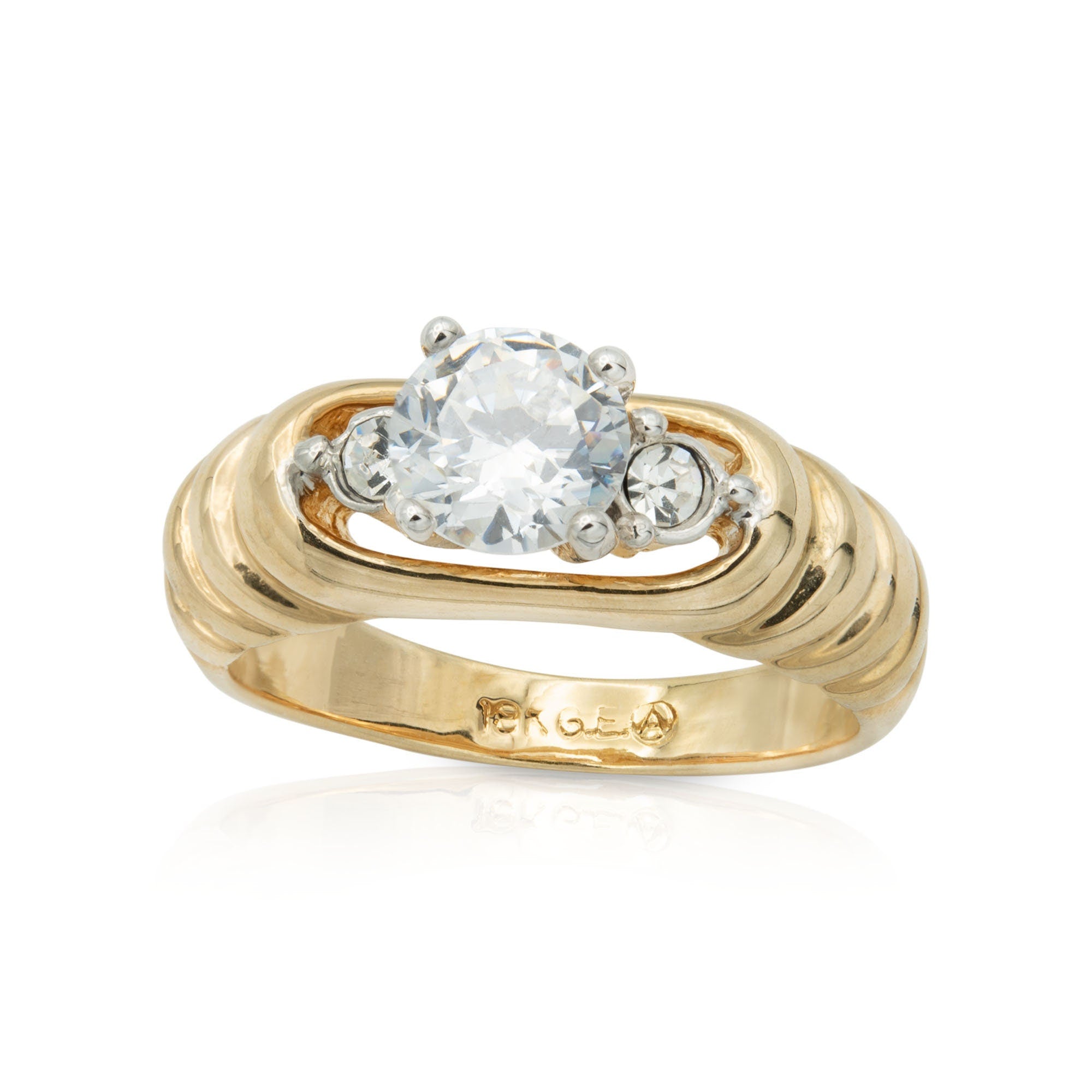 Vintage Ring Cubic Zirconia Solitaire Engagement Ring 18KT Yellow Gold Antique Womans Jewelry #R2715 Condition: Excellent & SPARKLY! (Never worn or owned) Vintage 1980s Solitaire Engagement Style Ring Made in Providence, RI, USA 18k Gold Plated - Silver Tone Round Cut Cubic Zirconia Stone .50 ct. Total Weight Band has 1 Small stone on either side of the Soliaire Height of Setting: 1/4 inch April's Birthstone Color Stamped - 18k HGE