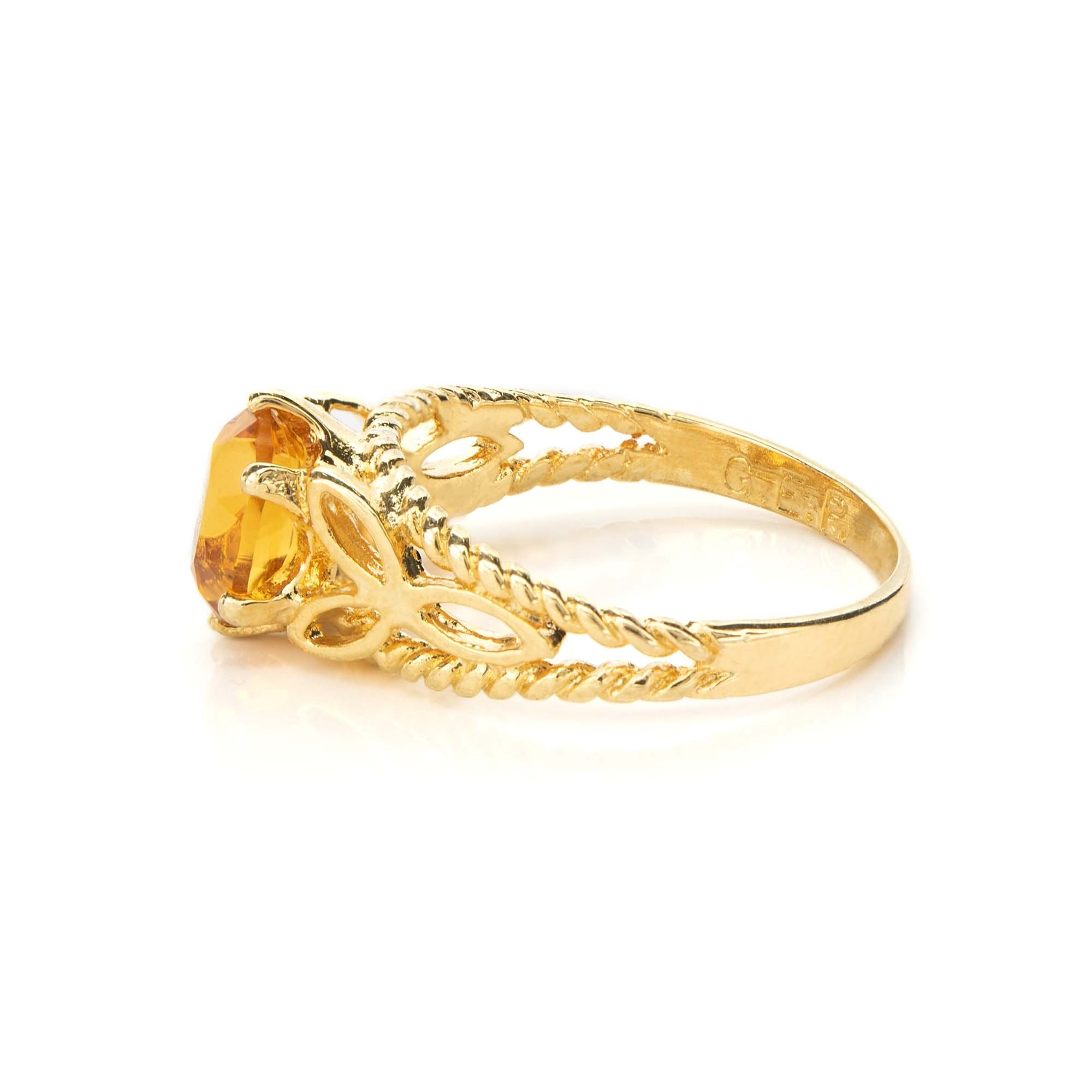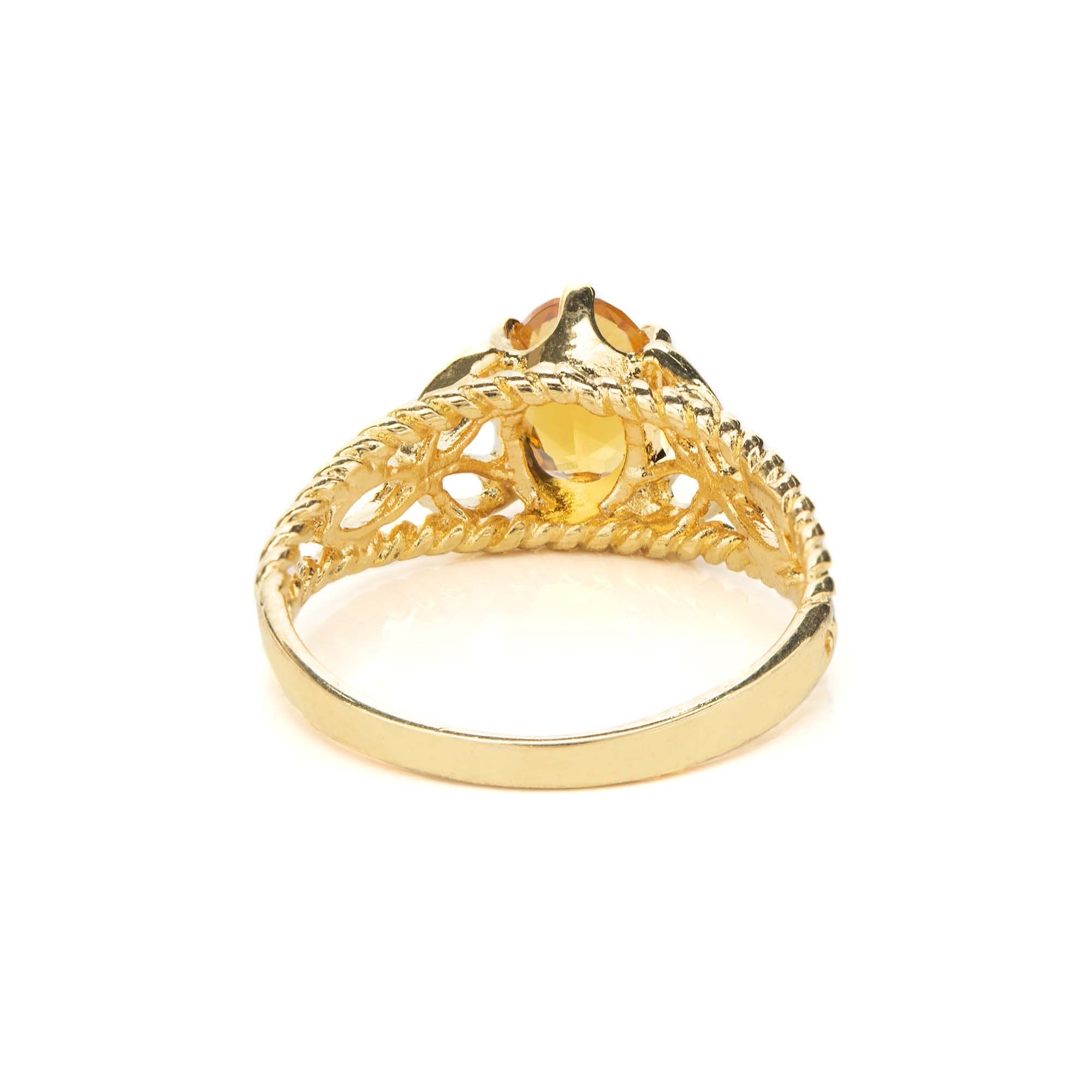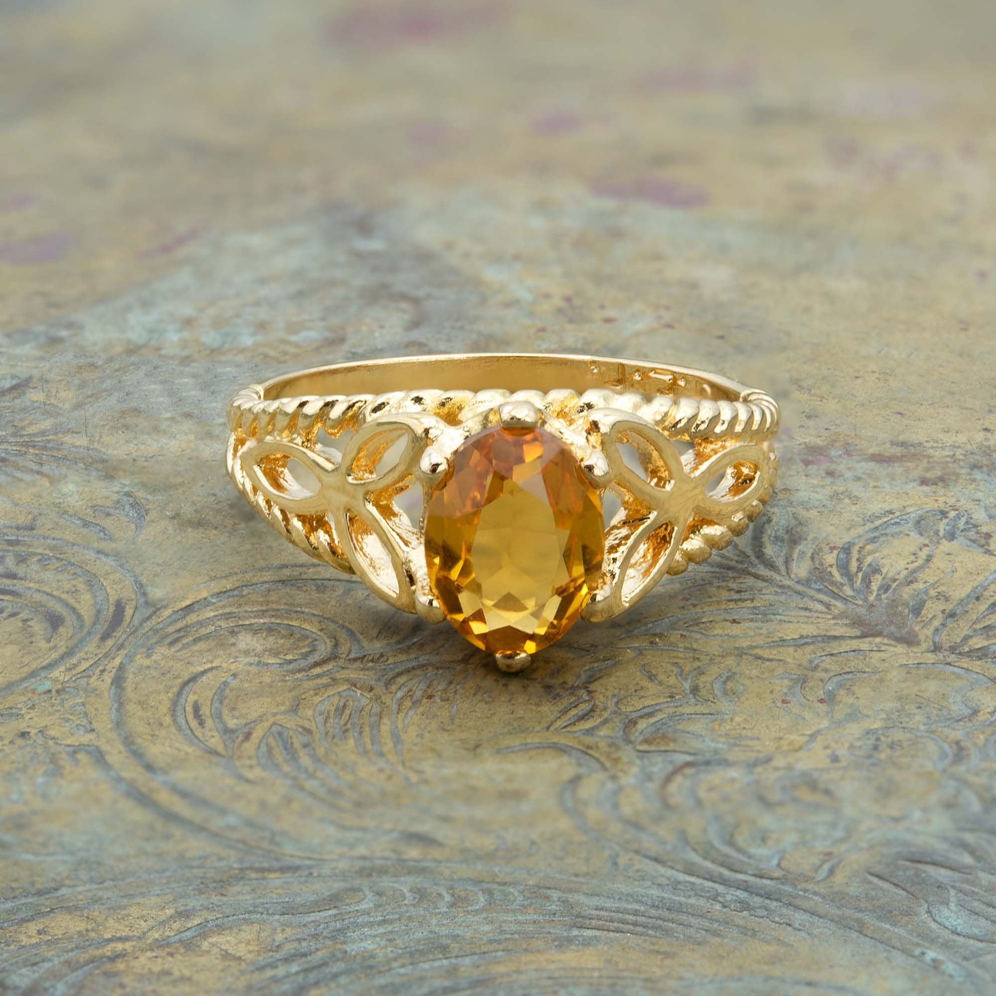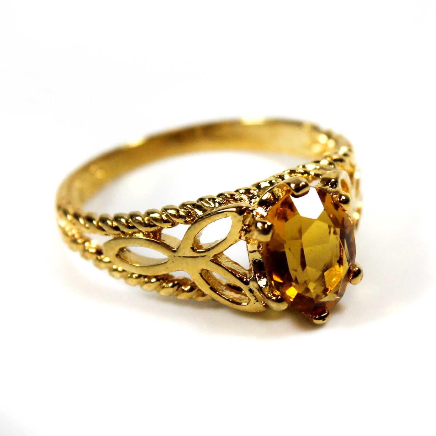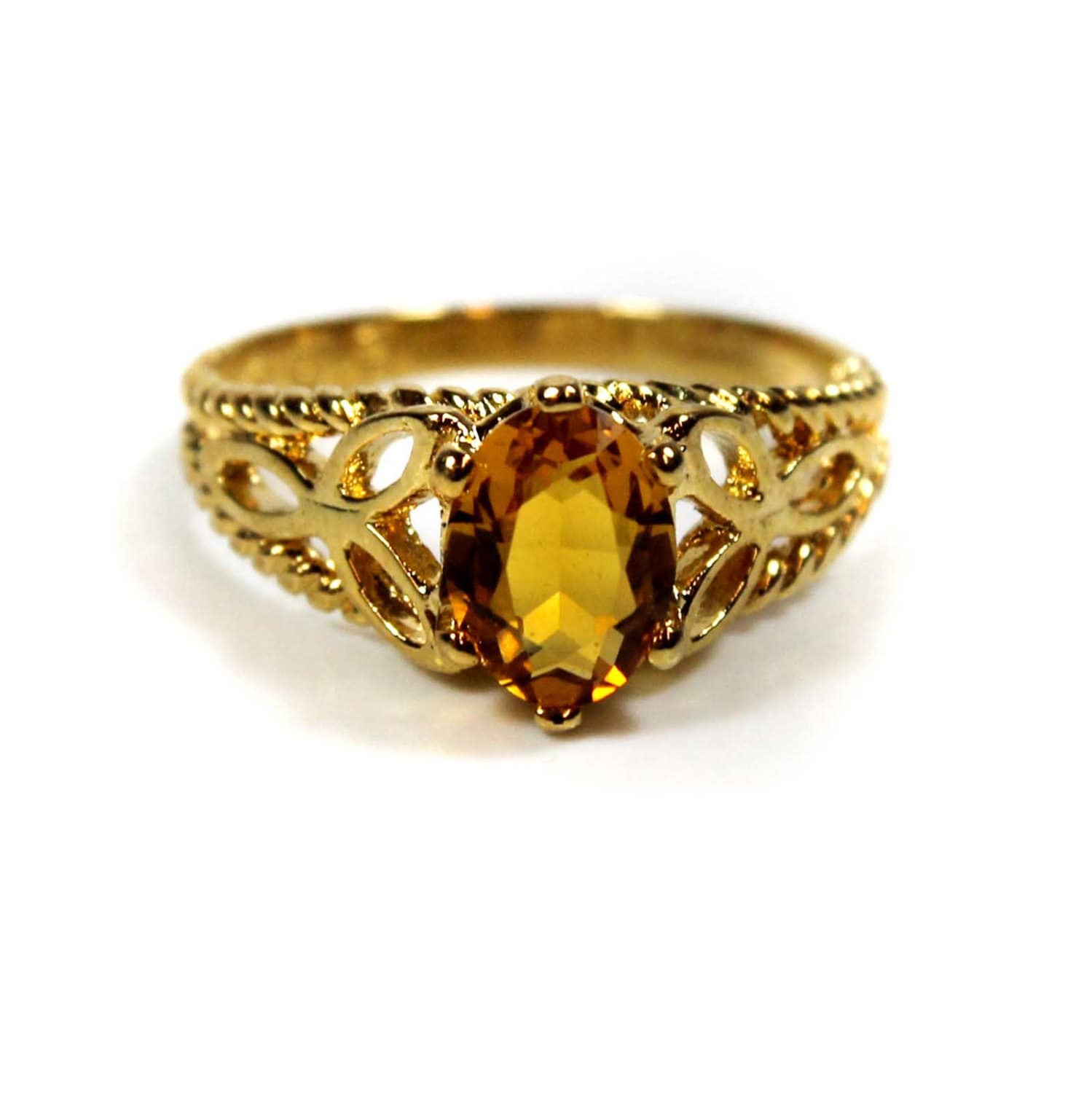 Condition is Excellent - Never worn or owned Vintage Filigree Cocktail Ring Ring Made approx. 1970s Authentic Edwardian Era Mold Made in Providence, Rhode Island, USA Oval Cut Light Topaz Austrian Crystal Intricate Filigree Design on Ring Shank Crystal Size 8.4mm x 6.2mm 18k Gold Electroplated Stamped - 18k HGE November's Birthstone Color More November's Birthstone Rings: