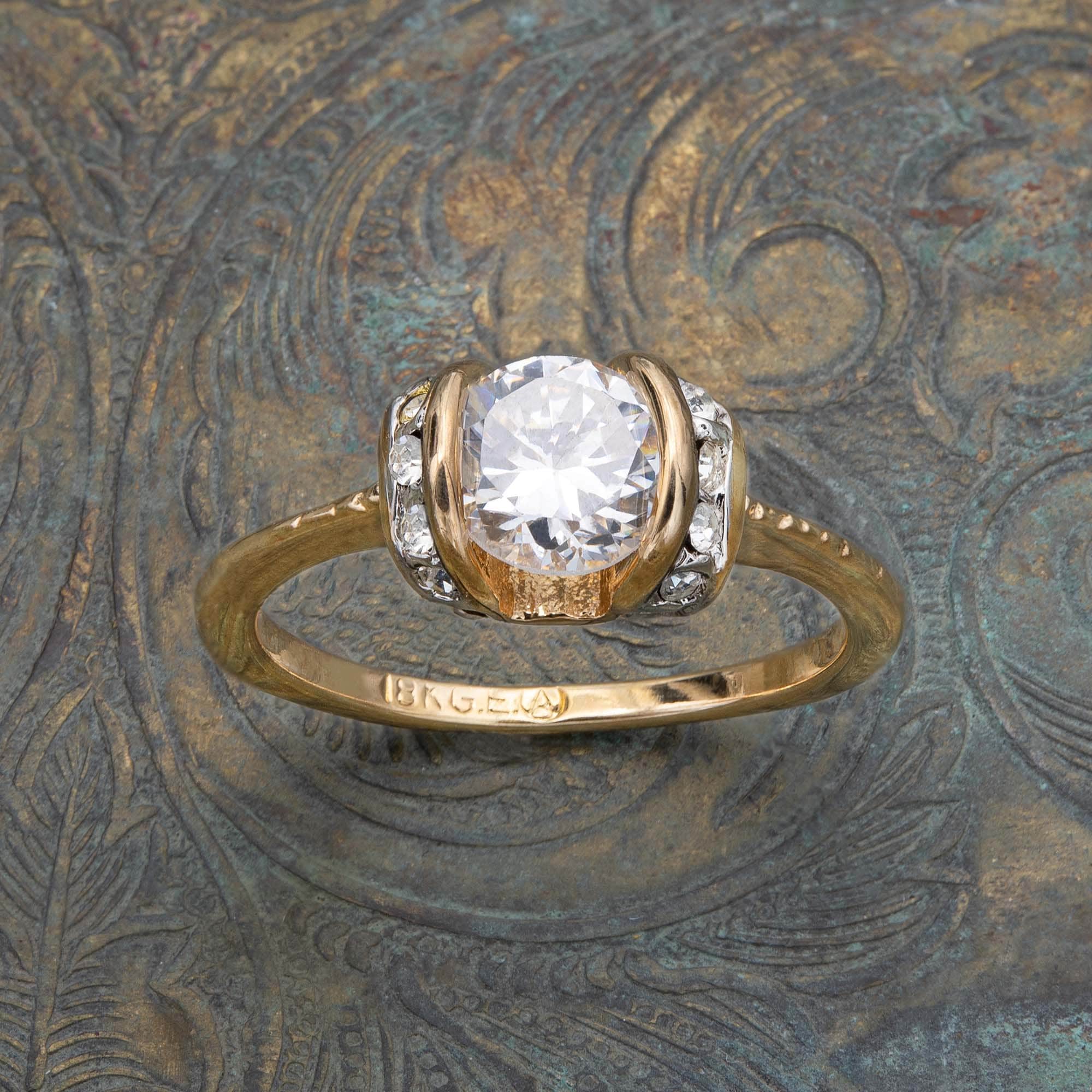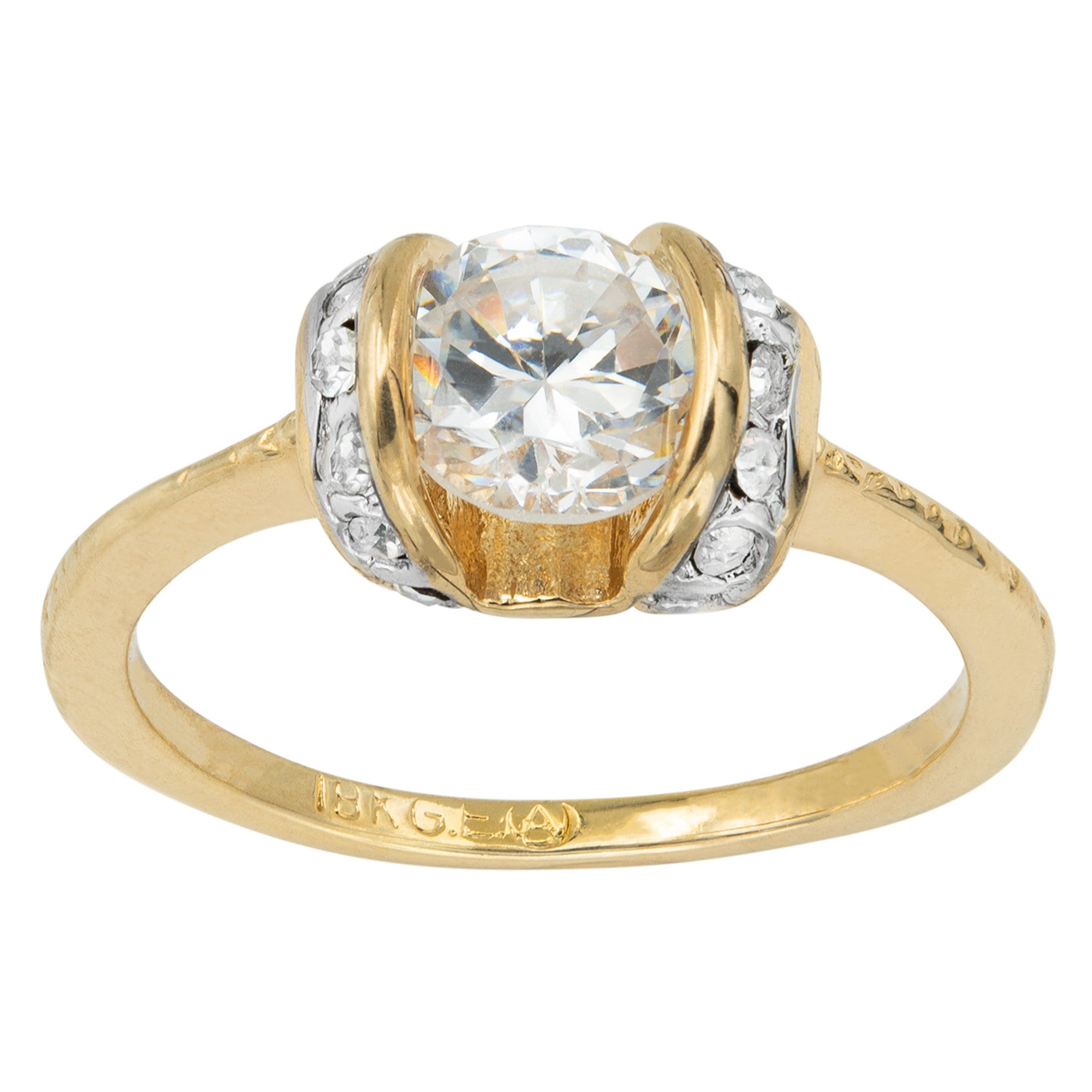 Vintage Ring Cubic Zirconia Solitaire Engagement Style Ring 18KT Yellow Gold Electroplate #R3464 Condition: Excellent & SPARKLY! (Never worn or owned) Vintage 1980s Solitaire Engagement Style Ring Made in Providence, RI, USA 18k Gold Plated - Silver Tone Round Cut Cubic Zirconia Stone 1 ct. Total Weight Band has 8 Small stones on either side of the Soliaire Height of Setting: 1/4 inch April's Birthstone Color Stamped - 18k HGE
